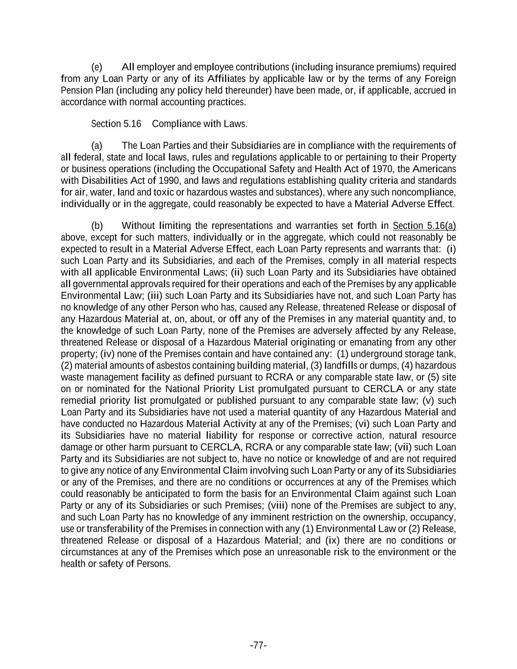 -77- (e) All employer and employee contributions (including insurance premiums) required from any Loan Party or any of its Affiliates by applicable law or by the terms of any Foreign Pension Plan (including any policy held thereunder) have been made, or, if applicable, accrued in accordance with normal accounting practices. Section 5.16 Compliance with Laws. (a) The Loan Parties and their Subsidiaries are in compliance with the requirements of all federal, state and local laws, rules and regulations applicable to or pertaining to their Property or business operations (including the Occupational Safety and Health Act of 1970, the Americans with Disabilities Act of 1990, and laws and regulations establishing quality criteria and standards for air, water, land and toxic or hazardous wastes and substances), where any such noncompliance, individually or in the aggregate, could reasonably be expected to have a Material Adverse Effect. (b) Without limiting the representations and warranties set forth in Section 5.16(a) above, except for such matters, individually or in the aggregate, which could not reasonably be expected to result in a Material Adverse Effect, each Loan Party represents and warrants that: (i) such Loan Party and its Subsidiaries, and each of the Premises, comply in all material respects with all applicable Environmental Laws; (ii) such Loan Party and its Subsidiaries have obtained all governmental approvals required for their operations and each of the Premises by any applicable Environmental Law; (iii) such Loan Party and its Subsidiaries have not, and such Loan Party has no knowledge of any other Person who has, caused any Release, threatened Release or disposal of any Hazardous Material at, on, about, or off any of the Premises in any material quantity and, to the knowledge of such Loan Party, none of the Premises are adversely affected by any Release, threatened Release or disposal of a Hazardous Material originating or emanating from any other property; (iv) none of the Premises contain and have contained any: (1) underground storage tank, (2) material amounts of asbestos containing building material, (3) landfills or dumps, (4) hazardous waste management facility as defined pursuant to RCRA or any comparable state law, or (5) site on or nominated for the National Priority List promulgated pursuant to CERCLA or any state remedial priority list promulgated or published pursuant to any comparable state law; (v) such Loan Party and its Subsidiaries have not used a material quantity of any Hazardous Material and have conducted no Hazardous Material Activity at any of the Premises; (vi) such Loan Party and its Subsidiaries have no material liability for response or corrective action, natural resource damage or other harm pursuant to CERCLA, RCRA or any comparable state law; (vii) such Loan Party and its Subsidiaries are not subject to, have no notice or knowledge of and are not required to give any notice of any Environmental Claim involving such Loan Party or any of its Subsidiaries or any of the Premises, and there are no conditions or occurrences at any of the Premises which could reasonably be anticipated to form the basis for an Environmental Claim against such Loan Party or any of its Subsidiaries or such Premises; (viii) none of the Premises are subject to any, and such Loan Party has no knowledge of any imminent restriction on the ownership, occupancy, use or transferability of the Premises in connection with any (1) Environmental Law or (2) Release, threatened Release or disposal of a Hazardous Material; and (ix) there are no conditions or circumstances at any of the Premises which pose an unreasonable risk to the environment or the health or safety of Persons.