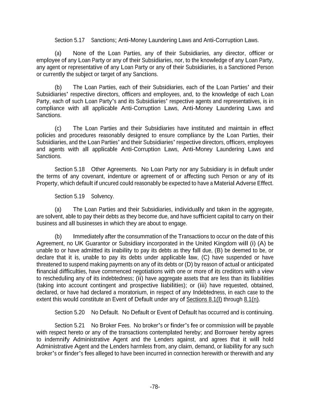 -78- Section 5.17 Sanctions; Anti-Money Laundering Laws and Anti-Corruption Laws. (a) None of the Loan Parties, any of their Subsidiaries, any director, officer or employee of any Loan Party or any of their Subsidiaries, nor, to the knowledge of any Loan Party, any agent or representative of any Loan Party or any of their Subsidiaries, is a Sanctioned Person or currently the subject or target of any Sanctions. (b) The Loan Parties, each of their Subsidiaries, each of the Loan Parties’ and their Subsidiaries’ respective directors, officers and employees, and, to the knowledge of each Loan Party, each of such Loan Party’s and its Subsidiaries’ respective agents and representatives, is in compliance with all applicable Anti-Corruption Laws, Anti-Money Laundering Laws and Sanctions. (c) The Loan Parties and their Subsidiaries have instituted and maintain in effect policies and procedures reasonably designed to ensure compliance by the Loan Parties, their Subsidiaries, and the Loan Parties’ and their Subsidiaries’ respective directors, officers, employees and agents with all applicable Anti-Corruption Laws, Anti-Money Laundering Laws and Sanctions. Section 5.18 Other Agreements. No Loan Party nor any Subsidiary is in default under the terms of any covenant, indenture or agreement of or affecting such Person or any of its Property, which default if uncured could reasonably be expected to have a Material Adverse Effect. Section 5.19 Solvency. (a) The Loan Parties and their Subsidiaries, individually and taken in the aggregate, are solvent, able to pay their debts as they become due, and have sufficient capital to carry on their business and all businesses in which they are about to engage. (b) Immediately after the consummation of the Transactions to occur on the date of this Agreement, no UK Guarantor or Subsidiary incorporated in the United Kingdom will (i) (A) be unable to or have admitted its inability to pay its debts as they fall due, (B) be deemed to be, or declare that it is, unable to pay its debts under applicable law, (C) have suspended or have threatened to suspend making payments on any of its debts or (D) by reason of actual or anticipated financial difficulties, have commenced negotiations with one or more of its creditors with a view to rescheduling any of its indebtedness; (ii) have aggregate assets that are less than its liabilities (taking into account contingent and prospective liabilities); or (iii) have requested, obtained, declared, or have had declared a moratorium, in respect of any Indebtedness, in each case to the extent this would constitute an Event of Default under any of Sections 8.1(l) through 8.1(n). Section 5.20 No Default. No Default or Event of Default has occurred and is continuing. Section 5.21 No Broker Fees. No broker’s or finder’s fee or commission will be payable with respect hereto or any of the transactions contemplated hereby; and Borrower hereby agrees to indemnify Administrative Agent and the Lenders against, and agrees that it will hold Administrative Agent and the Lenders harmless from, any claim, demand, or liability for any such broker’s or finder’s fees alleged to have been incurred in connection herewith or therewith and any