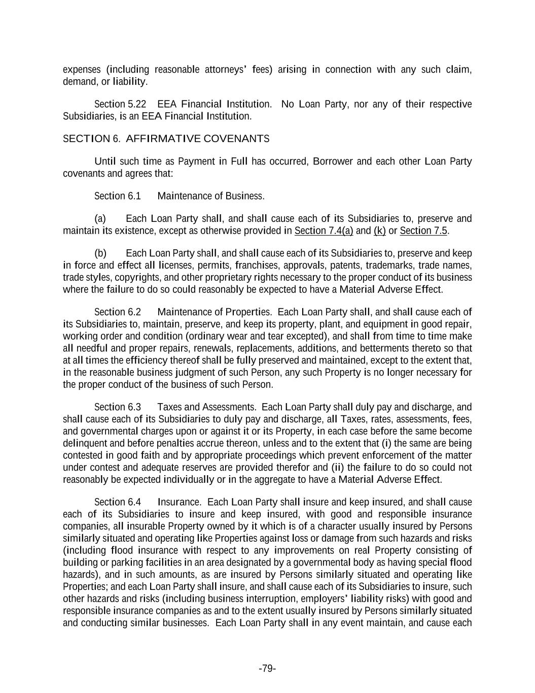 -79- expenses (including reasonable attorneys’ fees) arising in connection with any such claim, demand, or liability. Section 5.22 EEA Financial Institution. No Loan Party, nor any of their respective Subsidiaries, is an EEA Financial Institution. SECTION 6. AFFIRMATIVE COVENANTS Until such time as Payment in Full has occurred, Borrower and each other Loan Party covenants and agrees that: Section 6.1 Maintenance of Business. (a) Each Loan Party shall, and shall cause each of its Subsidiaries to, preserve and maintain its existence, except as otherwise provided in Section 7.4(a) and (k) or Section 7.5. (b) Each Loan Party shall, and shall cause each of its Subsidiaries to, preserve and keep in force and effect all licenses, permits, franchises, approvals, patents, trademarks, trade names, trade styles, copyrights, and other proprietary rights necessary to the proper conduct of its business where the failure to do so could reasonably be expected to have a Material Adverse Effect. Section 6.2 Maintenance of Properties. Each Loan Party shall, and shall cause each of its Subsidiaries to, maintain, preserve, and keep its property, plant, and equipment in good repair, working order and condition (ordinary wear and tear excepted), and shall from time to time make all needful and proper repairs, renewals, replacements, additions, and betterments thereto so that at all times the efficiency thereof shall be fully preserved and maintained, except to the extent that, in the reasonable business judgment of such Person, any such Property is no longer necessary for the proper conduct of the business of such Person. Section 6.3 Taxes and Assessments. Each Loan Party shall duly pay and discharge, and shall cause each of its Subsidiaries to duly pay and discharge, all Taxes, rates, assessments, fees, and governmental charges upon or against it or its Property, in each case before the same become delinquent and before penalties accrue thereon, unless and to the extent that (i) the same are being contested in good faith and by appropriate proceedings which prevent enforcement of the matter under contest and adequate reserves are provided therefor and (ii) the failure to do so could not reasonably be expected individually or in the aggregate to have a Material Adverse Effect. Section 6.4 Insurance. Each Loan Party shall insure and keep insured, and shall cause each of its Subsidiaries to insure and keep insured, with good and responsible insurance companies, all insurable Property owned by it which is of a character usually insured by Persons similarly situated and operating like Properties against loss or damage from such hazards and risks (including flood insurance with respect to any improvements on real Property consisting of building or parking facilities in an area designated by a governmental body as having special flood hazards), and in such amounts, as are insured by Persons similarly situated and operating like Properties; and each Loan Party shall insure, and shall cause each of its Subsidiaries to insure, such other hazards and risks (including business interruption, employers’ liability risks) with good and responsible insurance companies as and to the extent usually insured by Persons similarly situated and conducting similar businesses. Each Loan Party shall in any event maintain, and cause each