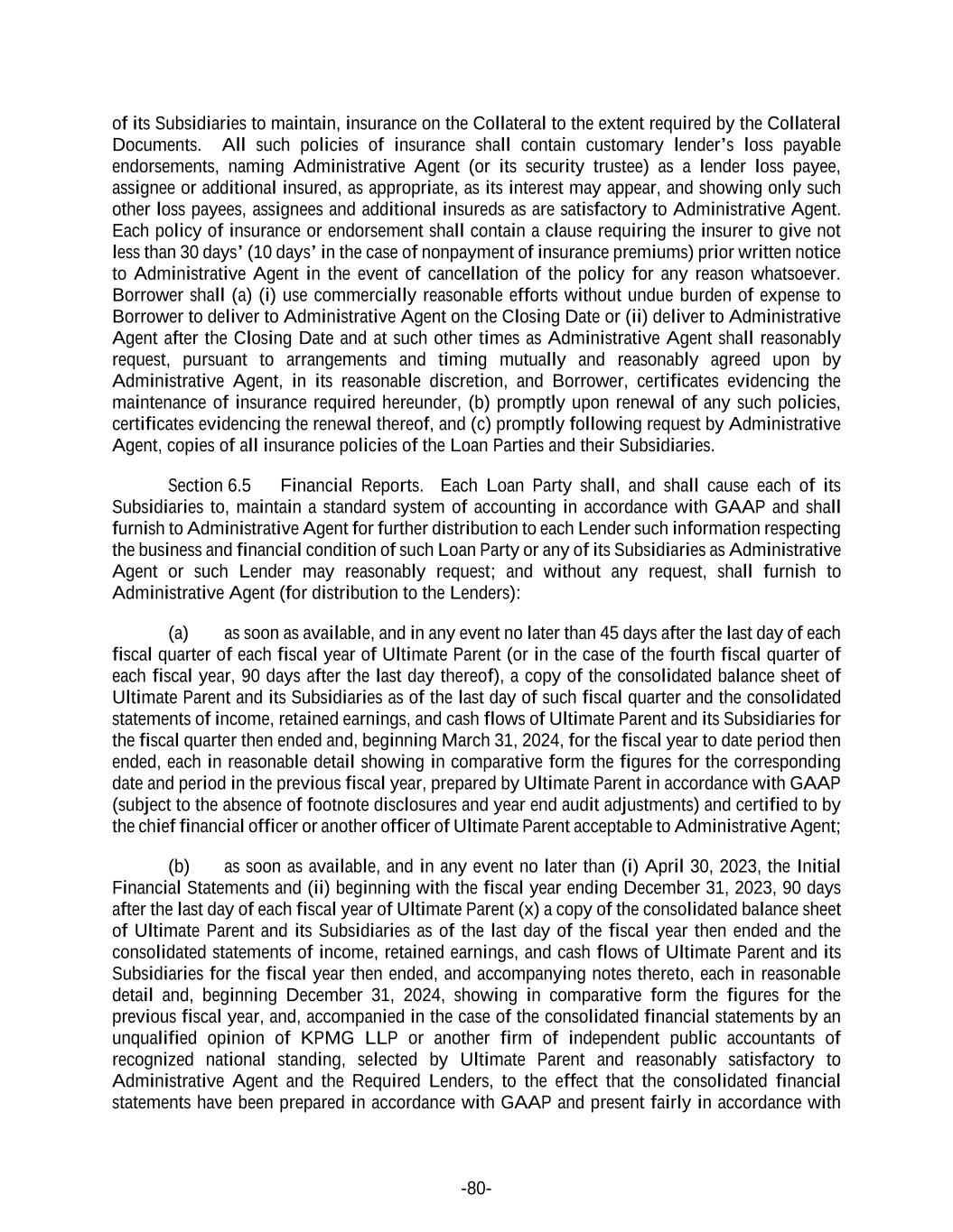 -80- of its Subsidiaries to maintain, insurance on the Collateral to the extent required by the Collateral Documents. All such policies of insurance shall contain customary lender’s loss payable endorsements, naming Administrative Agent (or its security trustee) as a lender loss payee, assignee or additional insured, as appropriate, as its interest may appear, and showing only such other loss payees, assignees and additional insureds as are satisfactory to Administrative Agent. Each policy of insurance or endorsement shall contain a clause requiring the insurer to give not less than 30 days’ (10 days’ in the case of nonpayment of insurance premiums) prior written notice to Administrative Agent in the event of cancellation of the policy for any reason whatsoever. Borrower shall (a) (i) use commercially reasonable efforts without undue burden of expense to Borrower to deliver to Administrative Agent on the Closing Date or (ii) deliver to Administrative Agent after the Closing Date and at such other times as Administrative Agent shall reasonably request, pursuant to arrangements and timing mutually and reasonably agreed upon by Administrative Agent, in its reasonable discretion, and Borrower, certificates evidencing the maintenance of insurance required hereunder, (b) promptly upon renewal of any such policies, certificates evidencing the renewal thereof, and (c) promptly following request by Administrative Agent, copies of all insurance policies of the Loan Parties and their Subsidiaries. Section 6.5 Financial Reports. Each Loan Party shall, and shall cause each of its Subsidiaries to, maintain a standard system of accounting in accordance with GAAP and shall furnish to Administrative Agent for further distribution to each Lender such information respecting the business and financial condition of such Loan Party or any of its Subsidiaries as Administrative Agent or such Lender may reasonably request; and without any request, shall furnish to Administrative Agent (for distribution to the Lenders): (a) as soon as available, and in any event no later than 45 days after the last day of each fiscal quarter of each fiscal year of Ultimate Parent (or in the case of the fourth fiscal quarter of each fiscal year, 90 days after the last day thereof), a copy of the consolidated balance sheet of Ultimate Parent and its Subsidiaries as of the last day of such fiscal quarter and the consolidated statements of income, retained earnings, and cash flows of Ultimate Parent and its Subsidiaries for the fiscal quarter then ended and, beginning March 31, 2024, for the fiscal year to date period then ended, each in reasonable detail showing in comparative form the figures for the corresponding date and period in the previous fiscal year, prepared by Ultimate Parent in accordance with GAAP (subject to the absence of footnote disclosures and year end audit adjustments) and certified to by the chief financial officer or another officer of Ultimate Parent acceptable to Administrative Agent; (b) as soon as available, and in any event no later than (i) April 30, 2023, the Initial Financial Statements and (ii) beginning with the fiscal year ending December 31, 2023, 90 days after the last day of each fiscal year of Ultimate Parent (x) a copy of the consolidated balance sheet of Ultimate Parent and its Subsidiaries as of the last day of the fiscal year then ended and the consolidated statements of income, retained earnings, and cash flows of Ultimate Parent and its Subsidiaries for the fiscal year then ended, and accompanying notes thereto, each in reasonable detail and, beginning December 31, 2024, showing in comparative form the figures for the previous fiscal year, and, accompanied in the case of the consolidated financial statements by an unqualified opinion of KPMG LLP or another firm of independent public accountants of recognized national standing, selected by Ultimate Parent and reasonably satisfactory to Administrative Agent and the Required Lenders, to the effect that the consolidated financial statements have been prepared in accordance with GAAP and present fairly in accordance with