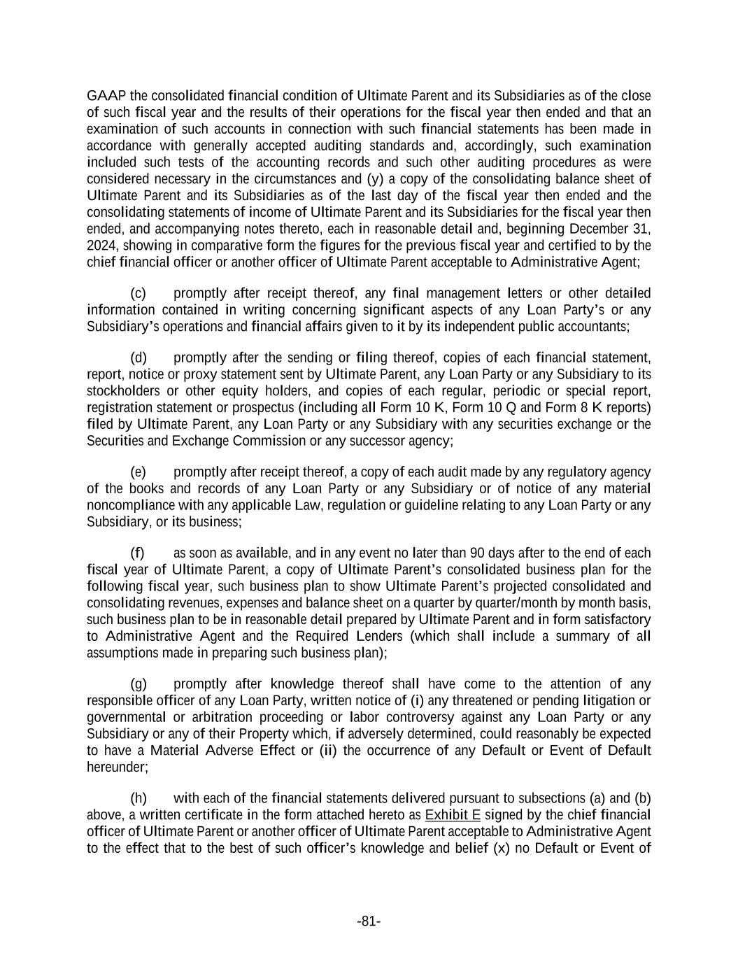 -81- GAAP the consolidated financial condition of Ultimate Parent and its Subsidiaries as of the close of such fiscal year and the results of their operations for the fiscal year then ended and that an examination of such accounts in connection with such financial statements has been made in accordance with generally accepted auditing standards and, accordingly, such examination included such tests of the accounting records and such other auditing procedures as were considered necessary in the circumstances and (y) a copy of the consolidating balance sheet of Ultimate Parent and its Subsidiaries as of the last day of the fiscal year then ended and the consolidating statements of income of Ultimate Parent and its Subsidiaries for the fiscal year then ended, and accompanying notes thereto, each in reasonable detail and, beginning December 31, 2024, showing in comparative form the figures for the previous fiscal year and certified to by the chief financial officer or another officer of Ultimate Parent acceptable to Administrative Agent; (c) promptly after receipt thereof, any final management letters or other detailed information contained in writing concerning significant aspects of any Loan Party’s or any Subsidiary’s operations and financial affairs given to it by its independent public accountants; (d) promptly after the sending or filing thereof, copies of each financial statement, report, notice or proxy statement sent by Ultimate Parent, any Loan Party or any Subsidiary to its stockholders or other equity holders, and copies of each regular, periodic or special report, registration statement or prospectus (including all Form 10 K, Form 10 Q and Form 8 K reports) filed by Ultimate Parent, any Loan Party or any Subsidiary with any securities exchange or the Securities and Exchange Commission or any successor agency; (e) promptly after receipt thereof, a copy of each audit made by any regulatory agency of the books and records of any Loan Party or any Subsidiary or of notice of any material noncompliance with any applicable Law, regulation or guideline relating to any Loan Party or any Subsidiary, or its business; (f) as soon as available, and in any event no later than 90 days after to the end of each fiscal year of Ultimate Parent, a copy of Ultimate Parent’s consolidated business plan for the following fiscal year, such business plan to show Ultimate Parent’s projected consolidated and consolidating revenues, expenses and balance sheet on a quarter by quarter/month by month basis, such business plan to be in reasonable detail prepared by Ultimate Parent and in form satisfactory to Administrative Agent and the Required Lenders (which shall include a summary of all assumptions made in preparing such business plan); (g) promptly after knowledge thereof shall have come to the attention of any responsible officer of any Loan Party, written notice of (i) any threatened or pending litigation or governmental or arbitration proceeding or labor controversy against any Loan Party or any Subsidiary or any of their Property which, if adversely determined, could reasonably be expected to have a Material Adverse Effect or (ii) the occurrence of any Default or Event of Default hereunder; (h) with each of the financial statements delivered pursuant to subsections (a) and (b) above, a written certificate in the form attached hereto as Exhibit E signed by the chief financial officer of Ultimate Parent or another officer of Ultimate Parent acceptable to Administrative Agent to the effect that to the best of such officer’s knowledge and belief (x) no Default or Event of