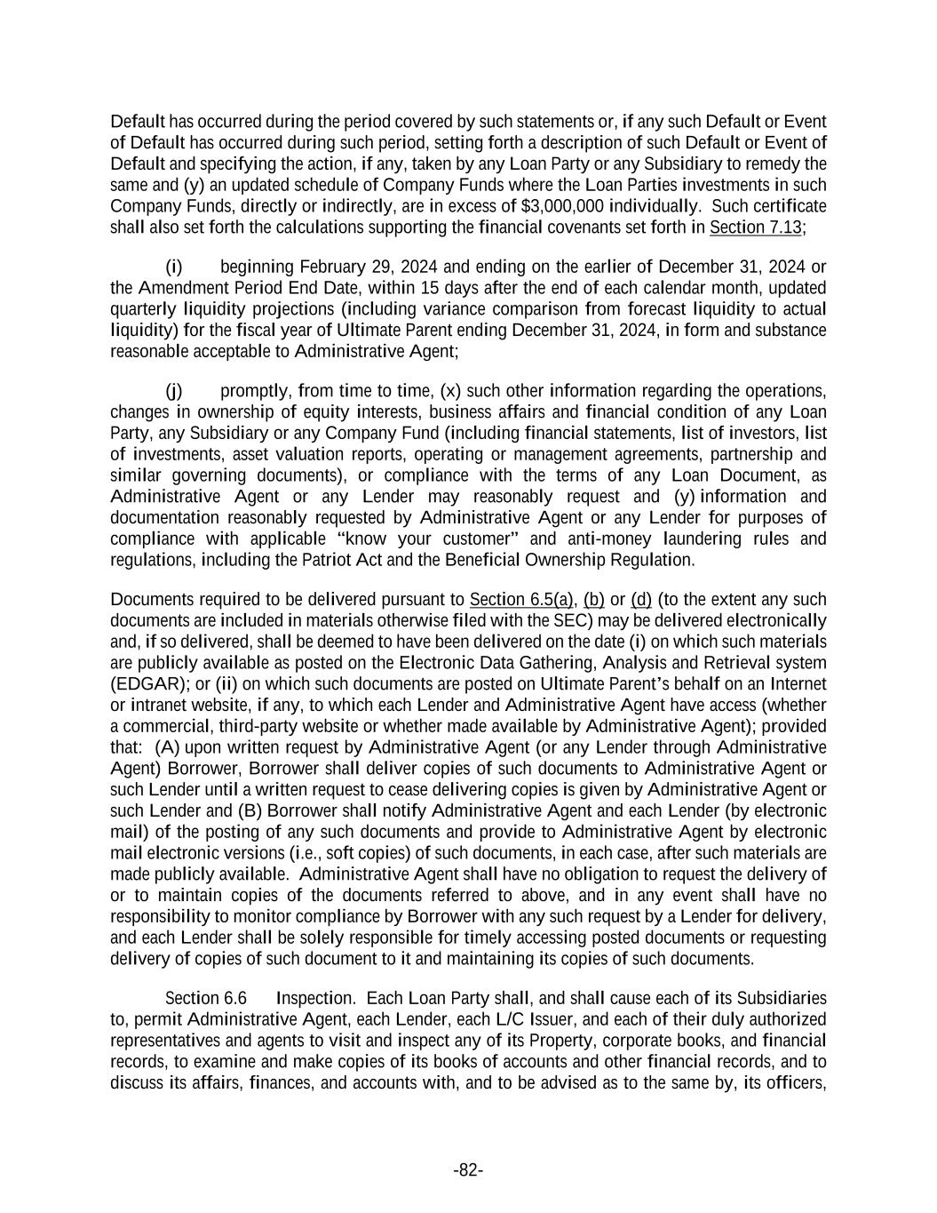 -82- Default has occurred during the period covered by such statements or, if any such Default or Event of Default has occurred during such period, setting forth a description of such Default or Event of Default and specifying the action, if any, taken by any Loan Party or any Subsidiary to remedy the same and (y) an updated schedule of Company Funds where the Loan Parties investments in such Company Funds, directly or indirectly, are in excess of $3,000,000 individually. Such certificate shall also set forth the calculations supporting the financial covenants set forth in Section 7.13; (i) beginning February 29, 2024 and ending on the earlier of December 31, 2024 or the Amendment Period End Date, within 15 days after the end of each calendar month, updated quarterly liquidity projections (including variance comparison from forecast liquidity to actual liquidity) for the fiscal year of Ultimate Parent ending December 31, 2024, in form and substance reasonable acceptable to Administrative Agent; (j) promptly, from time to time, (x) such other information regarding the operations, changes in ownership of equity interests, business affairs and financial condition of any Loan Party, any Subsidiary or any Company Fund (including financial statements, list of investors, list of investments, asset valuation reports, operating or management agreements, partnership and similar governing documents), or compliance with the terms of any Loan Document, as Administrative Agent or any Lender may reasonably request and (y) information and documentation reasonably requested by Administrative Agent or any Lender for purposes of compliance with applicable “know your customer” and anti-money laundering rules and regulations, including the Patriot Act and the Beneficial Ownership Regulation. Documents required to be delivered pursuant to Section 6.5(a), (b) or (d) (to the extent any such documents are included in materials otherwise filed with the SEC) may be delivered electronically and, if so delivered, shall be deemed to have been delivered on the date (i) on which such materials are publicly available as posted on the Electronic Data Gathering, Analysis and Retrieval system (EDGAR); or (ii) on which such documents are posted on Ultimate Parent’s behalf on an Internet or intranet website, if any, to which each Lender and Administrative Agent have access (whether a commercial, third-party website or whether made available by Administrative Agent); provided that: (A) upon written request by Administrative Agent (or any Lender through Administrative Agent) Borrower, Borrower shall deliver copies of such documents to Administrative Agent or such Lender until a written request to cease delivering copies is given by Administrative Agent or such Lender and (B) Borrower shall notify Administrative Agent and each Lender (by electronic mail) of the posting of any such documents and provide to Administrative Agent by electronic mail electronic versions (i.e., soft copies) of such documents, in each case, after such materials are made publicly available. Administrative Agent shall have no obligation to request the delivery of or to maintain copies of the documents referred to above, and in any event shall have no responsibility to monitor compliance by Borrower with any such request by a Lender for delivery, and each Lender shall be solely responsible for timely accessing posted documents or requesting delivery of copies of such document to it and maintaining its copies of such documents. Section 6.6 Inspection. Each Loan Party shall, and shall cause each of its Subsidiaries to, permit Administrative Agent, each Lender, each L/C Issuer, and each of their duly authorized representatives and agents to visit and inspect any of its Property, corporate books, and financial records, to examine and make copies of its books of accounts and other financial records, and to discuss its affairs, finances, and accounts with, and to be advised as to the same by, its officers,