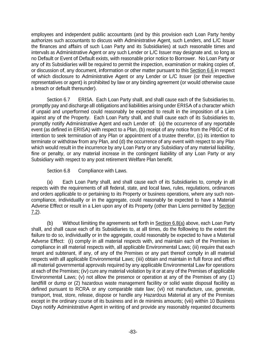 -83- employees and independent public accountants (and by this provision each Loan Party hereby authorizes such accountants to discuss with Administrative Agent, such Lenders, and L/C Issuer the finances and affairs of such Loan Party and its Subsidiaries) at such reasonable times and intervals as Administrative Agent or any such Lender or L/C Issuer may designate and, so long as no Default or Event of Default exists, with reasonable prior notice to Borrower. No Loan Party or any of its Subsidiaries will be required to permit the inspection, examination or making copies of, or discussion of, any document, information or other matter pursuant to this Section 6.6 in respect of which disclosure to Administrative Agent or any Lender or L/C Issuer (or their respective representatives or agent) is prohibited by law or any binding agreement (or would otherwise cause a breach or default thereunder). Section 6.7 ERISA. Each Loan Party shall, and shall cause each of the Subsidiaries to, promptly pay and discharge all obligations and liabilities arising under ERISA of a character which if unpaid and unperformed could reasonably be expected to result in the imposition of a Lien against any of the Property. Each Loan Party shall, and shall cause each of its Subsidiaries to, promptly notify Administrative Agent and each Lender of: (a) the occurrence of any reportable event (as defined in ERISA) with respect to a Plan, (b) receipt of any notice from the PBGC of its intention to seek termination of any Plan or appointment of a trustee therefor, (c) its intention to terminate or withdraw from any Plan, and (d) the occurrence of any event with respect to any Plan which would result in the incurrence by any Loan Party or any Subsidiary of any material liability, fine or penalty, or any material increase in the contingent liability of any Loan Party or any Subsidiary with respect to any post retirement Welfare Plan benefit. Section 6.8 Compliance with Laws. (a) Each Loan Party shall, and shall cause each of its Subsidiaries to, comply in all respects with the requirements of all federal, state, and local laws, rules, regulations, ordinances and orders applicable to or pertaining to its Property or business operations, where any such non- compliance, individually or in the aggregate, could reasonably be expected to have a Material Adverse Effect or result in a Lien upon any of its Property (other than Liens permitted by Section 7.2). (b) Without limiting the agreements set forth in Section 6.8(a) above, each Loan Party shall, and shall cause each of its Subsidiaries to, at all times, do the following to the extent the failure to do so, individually or in the aggregate, could reasonably be expected to have a Material Adverse Effect: (i) comply in all material respects with, and maintain each of the Premises in compliance in all material respects with, all applicable Environmental Laws; (ii) require that each tenant and subtenant, if any, of any of the Premises or any part thereof comply in all material respects with all applicable Environmental Laws; (iii) obtain and maintain in full force and effect all material governmental approvals required by any applicable Environmental Law for operations at each of the Premises; (iv) cure any material violation by it or at any of the Premises of applicable Environmental Laws; (v) not allow the presence or operation at any of the Premises of any (1) landfill or dump or (2) hazardous waste management facility or solid waste disposal facility as defined pursuant to RCRA or any comparable state law; (vi) not manufacture, use, generate, transport, treat, store, release, dispose or handle any Hazardous Material at any of the Premises except in the ordinary course of its business and in de minimis amounts; (vii) within 10 Business Days notify Administrative Agent in writing of and provide any reasonably requested documents