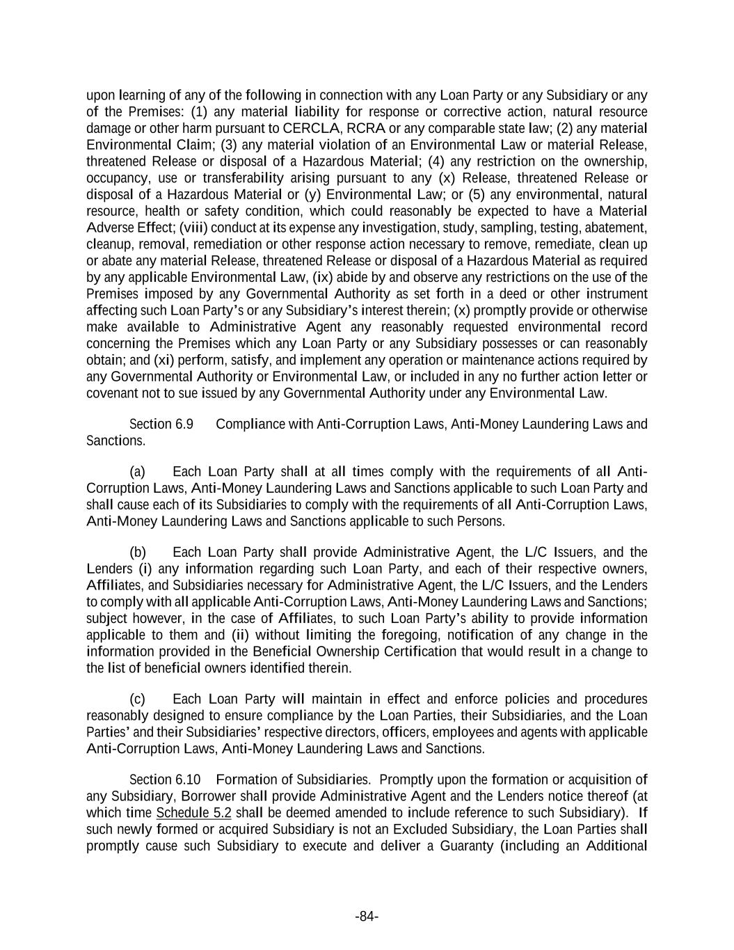 -84- upon learning of any of the following in connection with any Loan Party or any Subsidiary or any of the Premises: (1) any material liability for response or corrective action, natural resource damage or other harm pursuant to CERCLA, RCRA or any comparable state law; (2) any material Environmental Claim; (3) any material violation of an Environmental Law or material Release, threatened Release or disposal of a Hazardous Material; (4) any restriction on the ownership, occupancy, use or transferability arising pursuant to any (x) Release, threatened Release or disposal of a Hazardous Material or (y) Environmental Law; or (5) any environmental, natural resource, health or safety condition, which could reasonably be expected to have a Material Adverse Effect; (viii) conduct at its expense any investigation, study, sampling, testing, abatement, cleanup, removal, remediation or other response action necessary to remove, remediate, clean up or abate any material Release, threatened Release or disposal of a Hazardous Material as required by any applicable Environmental Law, (ix) abide by and observe any restrictions on the use of the Premises imposed by any Governmental Authority as set forth in a deed or other instrument affecting such Loan Party’s or any Subsidiary’s interest therein; (x) promptly provide or otherwise make available to Administrative Agent any reasonably requested environmental record concerning the Premises which any Loan Party or any Subsidiary possesses or can reasonably obtain; and (xi) perform, satisfy, and implement any operation or maintenance actions required by any Governmental Authority or Environmental Law, or included in any no further action letter or covenant not to sue issued by any Governmental Authority under any Environmental Law. Section 6.9 Compliance with Anti-Corruption Laws, Anti-Money Laundering Laws and Sanctions. (a) Each Loan Party shall at all times comply with the requirements of all Anti- Corruption Laws, Anti-Money Laundering Laws and Sanctions applicable to such Loan Party and shall cause each of its Subsidiaries to comply with the requirements of all Anti-Corruption Laws, Anti-Money Laundering Laws and Sanctions applicable to such Persons. (b) Each Loan Party shall provide Administrative Agent, the L/C Issuers, and the Lenders (i) any information regarding such Loan Party, and each of their respective owners, Affiliates, and Subsidiaries necessary for Administrative Agent, the L/C Issuers, and the Lenders to comply with all applicable Anti-Corruption Laws, Anti-Money Laundering Laws and Sanctions; subject however, in the case of Affiliates, to such Loan Party’s ability to provide information applicable to them and (ii) without limiting the foregoing, notification of any change in the information provided in the Beneficial Ownership Certification that would result in a change to the list of beneficial owners identified therein. (c) Each Loan Party will maintain in effect and enforce policies and procedures reasonably designed to ensure compliance by the Loan Parties, their Subsidiaries, and the Loan Parties’ and their Subsidiaries’ respective directors, officers, employees and agents with applicable Anti-Corruption Laws, Anti-Money Laundering Laws and Sanctions. Section 6.10 Formation of Subsidiaries. Promptly upon the formation or acquisition of any Subsidiary, Borrower shall provide Administrative Agent and the Lenders notice thereof (at which time Schedule 5.2 shall be deemed amended to include reference to such Subsidiary). If such newly formed or acquired Subsidiary is not an Excluded Subsidiary, the Loan Parties shall promptly cause such Subsidiary to execute and deliver a Guaranty (including an Additional
