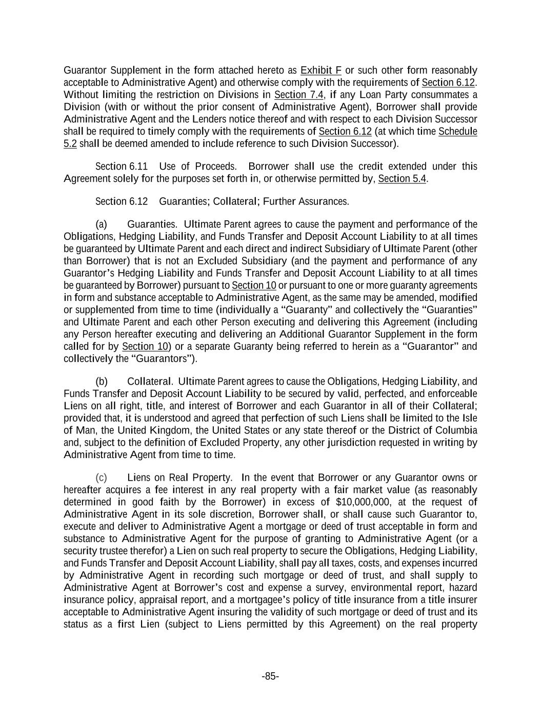 -85- Guarantor Supplement in the form attached hereto as Exhibit F or such other form reasonably acceptable to Administrative Agent) and otherwise comply with the requirements of Section 6.12. Without limiting the restriction on Divisions in Section 7.4, if any Loan Party consummates a Division (with or without the prior consent of Administrative Agent), Borrower shall provide Administrative Agent and the Lenders notice thereof and with respect to each Division Successor shall be required to timely comply with the requirements of Section 6.12 (at which time Schedule 5.2 shall be deemed amended to include reference to such Division Successor). Section 6.11 Use of Proceeds. Borrower shall use the credit extended under this Agreement solely for the purposes set forth in, or otherwise permitted by, Section 5.4. Section 6.12 Guaranties; Collateral; Further Assurances. (a) Guaranties. Ultimate Parent agrees to cause the payment and performance of the Obligations, Hedging Liability, and Funds Transfer and Deposit Account Liability to at all times be guaranteed by Ultimate Parent and each direct and indirect Subsidiary of Ultimate Parent (other than Borrower) that is not an Excluded Subsidiary (and the payment and performance of any Guarantor’s Hedging Liability and Funds Transfer and Deposit Account Liability to at all times be guaranteed by Borrower) pursuant to Section 10 or pursuant to one or more guaranty agreements in form and substance acceptable to Administrative Agent, as the same may be amended, modified or supplemented from time to time (individually a “Guaranty” and collectively the “Guaranties” and Ultimate Parent and each other Person executing and delivering this Agreement (including any Person hereafter executing and delivering an Additional Guarantor Supplement in the form called for by Section 10) or a separate Guaranty being referred to herein as a “Guarantor” and collectively the “Guarantors”). (b) Collateral. Ultimate Parent agrees to cause the Obligations, Hedging Liability, and Funds Transfer and Deposit Account Liability to be secured by valid, perfected, and enforceable Liens on all right, title, and interest of Borrower and each Guarantor in all of their Collateral; provided that, it is understood and agreed that perfection of such Liens shall be limited to the Isle of Man, the United Kingdom, the United States or any state thereof or the District of Columbia and, subject to the definition of Excluded Property, any other jurisdiction requested in writing by Administrative Agent from time to time. (c) Liens on Real Property. In the event that Borrower or any Guarantor owns or hereafter acquires a fee interest in any real property with a fair market value (as reasonably determined in good faith by the Borrower) in excess of $10,000,000, at the request of Administrative Agent in its sole discretion, Borrower shall, or shall cause such Guarantor to, execute and deliver to Administrative Agent a mortgage or deed of trust acceptable in form and substance to Administrative Agent for the purpose of granting to Administrative Agent (or a security trustee therefor) a Lien on such real property to secure the Obligations, Hedging Liability, and Funds Transfer and Deposit Account Liability, shall pay all taxes, costs, and expenses incurred by Administrative Agent in recording such mortgage or deed of trust, and shall supply to Administrative Agent at Borrower’s cost and expense a survey, environmental report, hazard insurance policy, appraisal report, and a mortgagee’s policy of title insurance from a title insurer acceptable to Administrative Agent insuring the validity of such mortgage or deed of trust and its status as a first Lien (subject to Liens permitted by this Agreement) on the real property