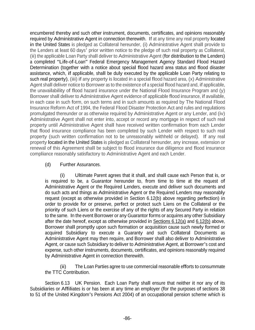 -86- encumbered thereby and such other instrument, documents, certificates, and opinions reasonably required by Administrative Agent in connection therewith. If at any time any real property located in the United States is pledged as Collateral hereunder, (i) Administrative Agent shall provide to the Lenders at least 60 days’ prior written notice to the pledge of such real property as Collateral, (ii) the applicable Loan Party shall deliver to Administrative Agent (for distribution to the Lenders) a completed “Life-of-Loan” Federal Emergency Management Agency Standard Flood Hazard Determination (together with a notice about special flood hazard area status and flood disaster assistance, which, if applicable, shall be duly executed by the applicable Loan Party relating to such real property), (iii) if any property is located in a special flood hazard area, (x) Administrative Agent shall deliver notice to Borrower as to the existence of a special flood hazard and, if applicable, the unavailability of flood hazard insurance under the National Flood Insurance Program and (y) Borrower shall deliver to Administrative Agent evidence of applicable flood insurance, if available, in each case in such form, on such terms and in such amounts as required by The National Flood Insurance Reform Act of 1994, the Federal Flood Disaster Protection Act and rules and regulations promulgated thereunder or as otherwise required by Administrative Agent or any Lender, and (iv) Administrative Agent shall not enter into, accept or record any mortgage in respect of such real property until Administrative Agent shall have received written confirmation from each Lender that flood insurance compliance has been completed by such Lender with respect to such real property (such written confirmation not to be unreasonably withheld or delayed). If any real property located in the United States is pledged as Collateral hereunder, any increase, extension or renewal of this Agreement shall be subject to flood insurance due diligence and flood insurance compliance reasonably satisfactory to Administrative Agent and each Lender. (d) Further Assurances. (i) Ultimate Parent agrees that it shall, and shall cause each Person that is, or is required to be, a Guarantor hereunder to, from time to time at the request of Administrative Agent or the Required Lenders, execute and deliver such documents and do such acts and things as Administrative Agent or the Required Lenders may reasonably request (except as otherwise provided in Section 6.12(b) above regarding perfection) in order to provide for or preserve, perfect or protect such Liens on the Collateral or the priority of such Liens or the exercise of any of the rights of any Secured Party in relation to the same. In the event Borrower or any Guarantor forms or acquires any other Subsidiary after the date hereof, except as otherwise provided in Sections 6.12(a) and 6.12(b) above, Borrower shall promptly upon such formation or acquisition cause such newly formed or acquired Subsidiary to execute a Guaranty and such Collateral Documents as Administrative Agent may then require, and Borrower shall also deliver to Administrative Agent, or cause such Subsidiary to deliver to Administrative Agent, at Borrower’s cost and expense, such other instruments, documents, certificates, and opinions reasonably required by Administrative Agent in connection therewith. (ii) The Loan Parties agree to use commercial reasonable efforts to consummate the TTC Contribution. Section 6.13 UK Pension. Each Loan Party shall ensure that neither it nor any of its Subsidiaries or Affiliates is or has been at any time an employer (for the purposes of sections 38 to 51 of the United Kingdom’s Pensions Act 2004) of an occupational pension scheme which is