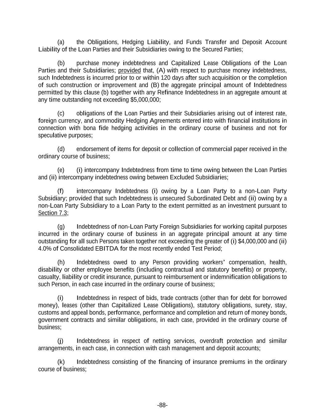 -88- (a) the Obligations, Hedging Liability, and Funds Transfer and Deposit Account Liability of the Loan Parties and their Subsidiaries owing to the Secured Parties; (b) purchase money indebtedness and Capitalized Lease Obligations of the Loan Parties and their Subsidiaries; provided that, (A) with respect to purchase money indebtedness, such Indebtedness is incurred prior to or within 120 days after such acquisition or the completion of such construction or improvement and (B) the aggregate principal amount of Indebtedness permitted by this clause (b) together with any Refinance Indebtedness in an aggregate amount at any time outstanding not exceeding $5,000,000; (c) obligations of the Loan Parties and their Subsidiaries arising out of interest rate, foreign currency, and commodity Hedging Agreements entered into with financial institutions in connection with bona fide hedging activities in the ordinary course of business and not for speculative purposes; (d) endorsement of items for deposit or collection of commercial paper received in the ordinary course of business; (e) (i) intercompany Indebtedness from time to time owing between the Loan Parties and (ii) intercompany indebtedness owing between Excluded Subsidiaries; (f) intercompany Indebtedness (i) owing by a Loan Party to a non-Loan Party Subsidiary; provided that such Indebtedness is unsecured Subordinated Debt and (ii) owing by a non-Loan Party Subsidiary to a Loan Party to the extent permitted as an investment pursuant to Section 7.3; (g) Indebtedness of non-Loan Party Foreign Subsidiaries for working capital purposes incurred in the ordinary course of business in an aggregate principal amount at any time outstanding for all such Persons taken together not exceeding the greater of (i) $4,000,000 and (ii) 4.0% of Consolidated EBITDA for the most recently ended Test Period; (h) Indebtedness owed to any Person providing workers’ compensation, health, disability or other employee benefits (including contractual and statutory benefits) or property, casualty, liability or credit insurance, pursuant to reimbursement or indemnification obligations to such Person, in each case incurred in the ordinary course of business; (i) Indebtedness in respect of bids, trade contracts (other than for debt for borrowed money), leases (other than Capitalized Lease Obligations), statutory obligations, surety, stay, customs and appeal bonds, performance, performance and completion and return of money bonds, government contracts and similar obligations, in each case, provided in the ordinary course of business; (j) Indebtedness in respect of netting services, overdraft protection and similar arrangements, in each case, in connection with cash management and deposit accounts; (k) Indebtedness consisting of the financing of insurance premiums in the ordinary course of business;