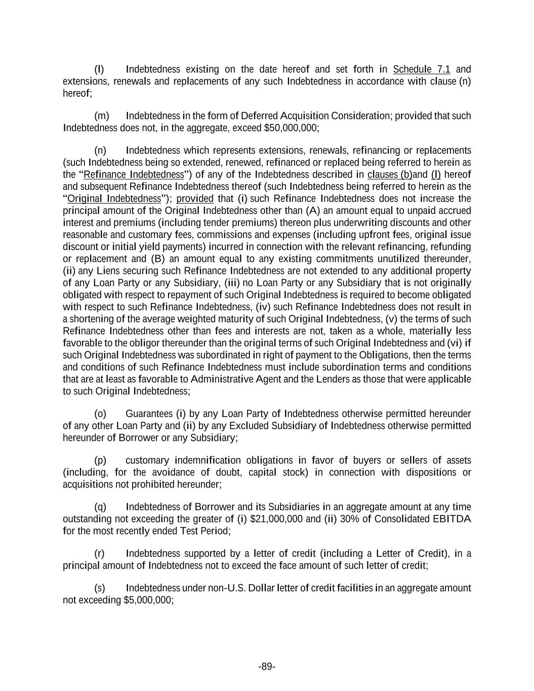 -89- (l) Indebtedness existing on the date hereof and set forth in Schedule 7.1 and extensions, renewals and replacements of any such Indebtedness in accordance with clause (n) hereof; (m) Indebtedness in the form of Deferred Acquisition Consideration; provided that such Indebtedness does not, in the aggregate, exceed $50,000,000; (n) Indebtedness which represents extensions, renewals, refinancing or replacements (such Indebtedness being so extended, renewed, refinanced or replaced being referred to herein as the “Refinance Indebtedness”) of any of the Indebtedness described in clauses (b)and (l) hereof and subsequent Refinance Indebtedness thereof (such Indebtedness being referred to herein as the “Original Indebtedness”); provided that (i) such Refinance Indebtedness does not increase the principal amount of the Original Indebtedness other than (A) an amount equal to unpaid accrued interest and premiums (including tender premiums) thereon plus underwriting discounts and other reasonable and customary fees, commissions and expenses (including upfront fees, original issue discount or initial yield payments) incurred in connection with the relevant refinancing, refunding or replacement and (B) an amount equal to any existing commitments unutilized thereunder, (ii) any Liens securing such Refinance Indebtedness are not extended to any additional property of any Loan Party or any Subsidiary, (iii) no Loan Party or any Subsidiary that is not originally obligated with respect to repayment of such Original Indebtedness is required to become obligated with respect to such Refinance Indebtedness, (iv) such Refinance Indebtedness does not result in a shortening of the average weighted maturity of such Original Indebtedness, (v) the terms of such Refinance Indebtedness other than fees and interests are not, taken as a whole, materially less favorable to the obligor thereunder than the original terms of such Original Indebtedness and (vi) if such Original Indebtedness was subordinated in right of payment to the Obligations, then the terms and conditions of such Refinance Indebtedness must include subordination terms and conditions that are at least as favorable to Administrative Agent and the Lenders as those that were applicable to such Original Indebtedness; (o) Guarantees (i) by any Loan Party of Indebtedness otherwise permitted hereunder of any other Loan Party and (ii) by any Excluded Subsidiary of Indebtedness otherwise permitted hereunder of Borrower or any Subsidiary; (p) customary indemnification obligations in favor of buyers or sellers of assets (including, for the avoidance of doubt, capital stock) in connection with dispositions or acquisitions not prohibited hereunder; (q) Indebtedness of Borrower and its Subsidiaries in an aggregate amount at any time outstanding not exceeding the greater of (i) $21,000,000 and (ii) 30% of Consolidated EBITDA for the most recently ended Test Period; (r) Indebtedness supported by a letter of credit (including a Letter of Credit), in a principal amount of Indebtedness not to exceed the face amount of such letter of credit; (s) Indebtedness under non-U.S. Dollar letter of credit facilities in an aggregate amount not exceeding $5,000,000;