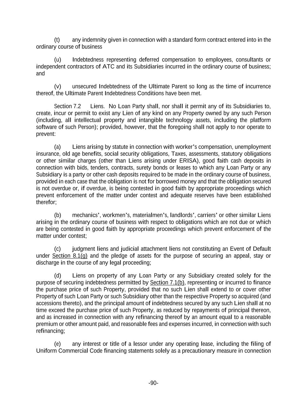 -90- (t) any indemnity given in connection with a standard form contract entered into in the ordinary course of business (u) Indebtedness representing deferred compensation to employees, consultants or independent contractors of ATC and its Subsidiaries incurred in the ordinary course of business; and (v) unsecured Indebtedness of the Ultimate Parent so long as the time of incurrence thereof, the Ultimate Parent Indebtedness Conditions have been met. Section 7.2 Liens. No Loan Party shall, nor shall it permit any of its Subsidiaries to, create, incur or permit to exist any Lien of any kind on any Property owned by any such Person (including, all intellectual property and intangible technology assets, including the platform software of such Person); provided, however, that the foregoing shall not apply to nor operate to prevent: (a) Liens arising by statute in connection with worker’s compensation, unemployment insurance, old age benefits, social security obligations, Taxes, assessments, statutory obligations or other similar charges (other than Liens arising under ERISA), good faith cash deposits in connection with bids, tenders, contracts, surety bonds or leases to which any Loan Party or any Subsidiary is a party or other cash deposits required to be made in the ordinary course of business, provided in each case that the obligation is not for borrowed money and that the obligation secured is not overdue or, if overdue, is being contested in good faith by appropriate proceedings which prevent enforcement of the matter under contest and adequate reserves have been established therefor; (b) mechanics’, workmen’s, materialmen’s, landlords’, carriers’ or other similar Liens arising in the ordinary course of business with respect to obligations which are not due or which are being contested in good faith by appropriate proceedings which prevent enforcement of the matter under contest; (c) judgment liens and judicial attachment liens not constituting an Event of Default under Section 8.1(g) and the pledge of assets for the purpose of securing an appeal, stay or discharge in the course of any legal proceeding; (d) Liens on property of any Loan Party or any Subsidiary created solely for the purpose of securing indebtedness permitted by Section 7.1(b), representing or incurred to finance the purchase price of such Property, provided that no such Lien shall extend to or cover other Property of such Loan Party or such Subsidiary other than the respective Property so acquired (and accessions thereto), and the principal amount of indebtedness secured by any such Lien shall at no time exceed the purchase price of such Property, as reduced by repayments of principal thereon, and as increased in connection with any refinancing thereof by an amount equal to a reasonable premium or other amount paid, and reasonable fees and expenses incurred, in connection with such refinancing; (e) any interest or title of a lessor under any operating lease, including the filing of Uniform Commercial Code financing statements solely as a precautionary measure in connection