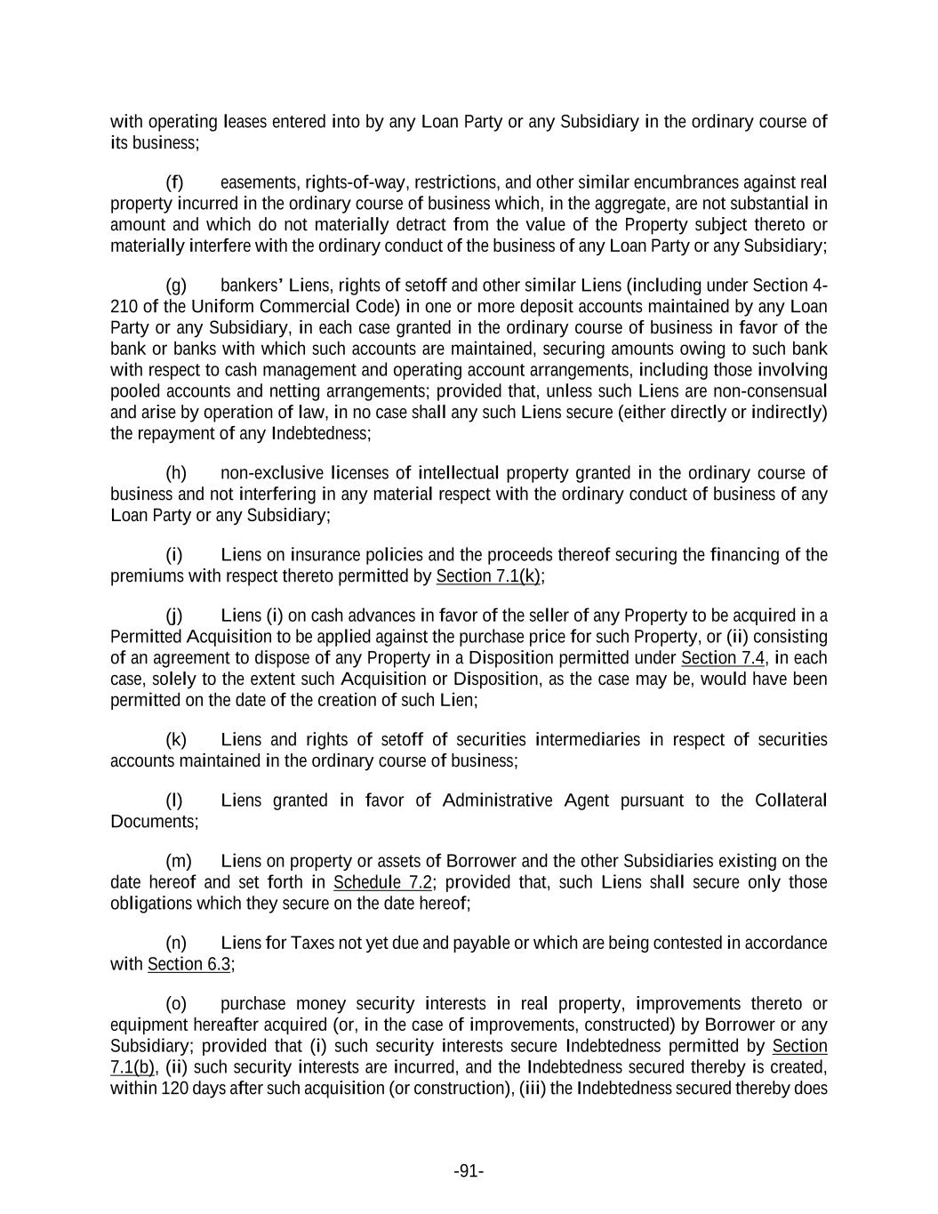 -91- with operating leases entered into by any Loan Party or any Subsidiary in the ordinary course of its business; (f) easements, rights-of-way, restrictions, and other similar encumbrances against real property incurred in the ordinary course of business which, in the aggregate, are not substantial in amount and which do not materially detract from the value of the Property subject thereto or materially interfere with the ordinary conduct of the business of any Loan Party or any Subsidiary; (g) bankers’ Liens, rights of setoff and other similar Liens (including under Section 4- 210 of the Uniform Commercial Code) in one or more deposit accounts maintained by any Loan Party or any Subsidiary, in each case granted in the ordinary course of business in favor of the bank or banks with which such accounts are maintained, securing amounts owing to such bank with respect to cash management and operating account arrangements, including those involving pooled accounts and netting arrangements; provided that, unless such Liens are non-consensual and arise by operation of law, in no case shall any such Liens secure (either directly or indirectly) the repayment of any Indebtedness; (h) non-exclusive licenses of intellectual property granted in the ordinary course of business and not interfering in any material respect with the ordinary conduct of business of any Loan Party or any Subsidiary; (i) Liens on insurance policies and the proceeds thereof securing the financing of the premiums with respect thereto permitted by Section 7.1(k); (j) Liens (i) on cash advances in favor of the seller of any Property to be acquired in a Permitted Acquisition to be applied against the purchase price for such Property, or (ii) consisting of an agreement to dispose of any Property in a Disposition permitted under Section 7.4, in each case, solely to the extent such Acquisition or Disposition, as the case may be, would have been permitted on the date of the creation of such Lien; (k) Liens and rights of setoff of securities intermediaries in respect of securities accounts maintained in the ordinary course of business; (l) Liens granted in favor of Administrative Agent pursuant to the Collateral Documents; (m) Liens on property or assets of Borrower and the other Subsidiaries existing on the date hereof and set forth in Schedule 7.2; provided that, such Liens shall secure only those obligations which they secure on the date hereof; (n) Liens for Taxes not yet due and payable or which are being contested in accordance with Section 6.3; (o) purchase money security interests in real property, improvements thereto or equipment hereafter acquired (or, in the case of improvements, constructed) by Borrower or any Subsidiary; provided that (i) such security interests secure Indebtedness permitted by Section 7.1(b), (ii) such security interests are incurred, and the Indebtedness secured thereby is created, within 120 days after such acquisition (or construction), (iii) the Indebtedness secured thereby does