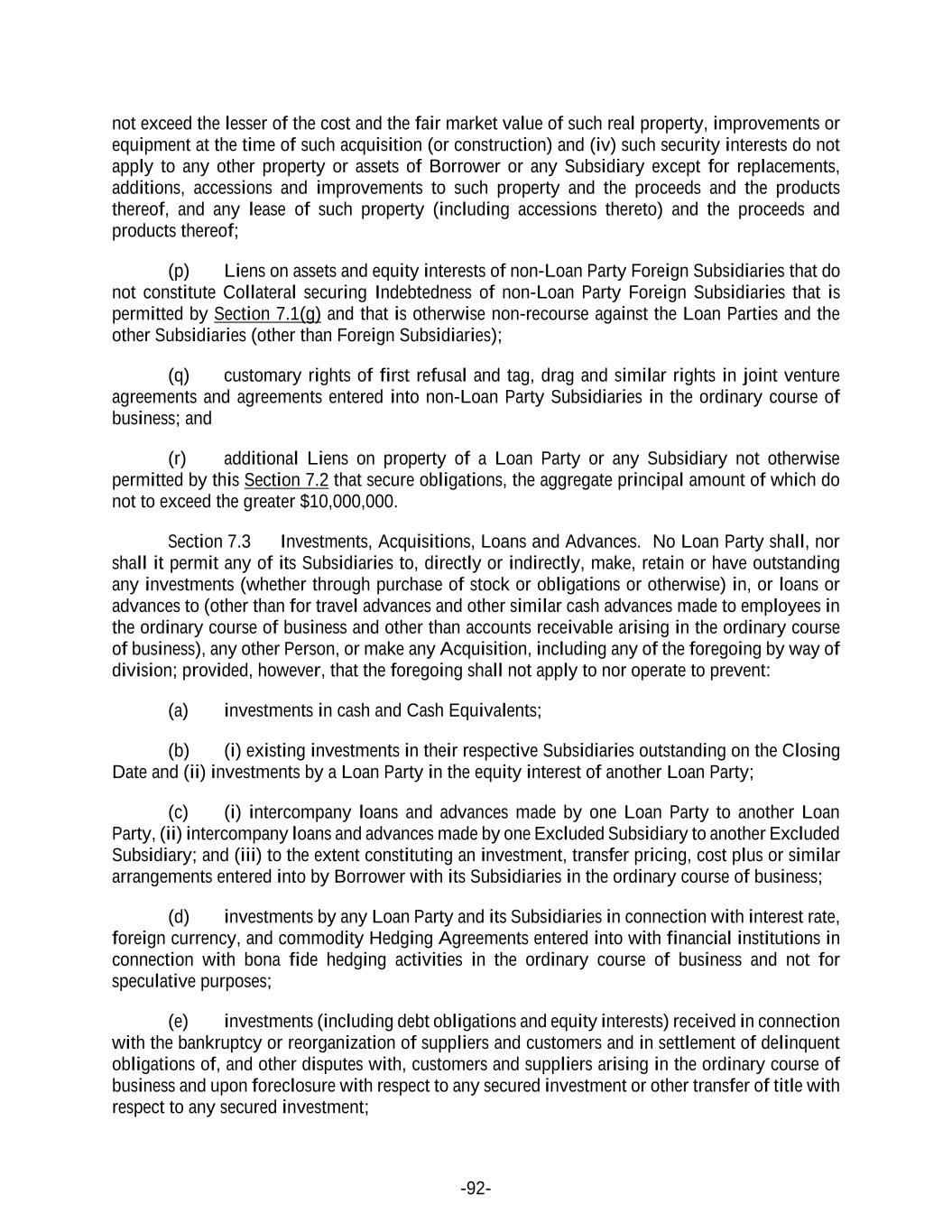 -92- not exceed the lesser of the cost and the fair market value of such real property, improvements or equipment at the time of such acquisition (or construction) and (iv) such security interests do not apply to any other property or assets of Borrower or any Subsidiary except for replacements, additions, accessions and improvements to such property and the proceeds and the products thereof, and any lease of such property (including accessions thereto) and the proceeds and products thereof; (p) Liens on assets and equity interests of non-Loan Party Foreign Subsidiaries that do not constitute Collateral securing Indebtedness of non-Loan Party Foreign Subsidiaries that is permitted by Section 7.1(g) and that is otherwise non-recourse against the Loan Parties and the other Subsidiaries (other than Foreign Subsidiaries); (q) customary rights of first refusal and tag, drag and similar rights in joint venture agreements and agreements entered into non-Loan Party Subsidiaries in the ordinary course of business; and (r) additional Liens on property of a Loan Party or any Subsidiary not otherwise permitted by this Section 7.2 that secure obligations, the aggregate principal amount of which do not to exceed the greater $10,000,000. Section 7.3 Investments, Acquisitions, Loans and Advances. No Loan Party shall, nor shall it permit any of its Subsidiaries to, directly or indirectly, make, retain or have outstanding any investments (whether through purchase of stock or obligations or otherwise) in, or loans or advances to (other than for travel advances and other similar cash advances made to employees in the ordinary course of business and other than accounts receivable arising in the ordinary course of business), any other Person, or make any Acquisition, including any of the foregoing by way of division; provided, however, that the foregoing shall not apply to nor operate to prevent: (a) investments in cash and Cash Equivalents; (b) (i) existing investments in their respective Subsidiaries outstanding on the Closing Date and (ii) investments by a Loan Party in the equity interest of another Loan Party; (c) (i) intercompany loans and advances made by one Loan Party to another Loan Party, (ii) intercompany loans and advances made by one Excluded Subsidiary to another Excluded Subsidiary; and (iii) to the extent constituting an investment, transfer pricing, cost plus or similar arrangements entered into by Borrower with its Subsidiaries in the ordinary course of business; (d) investments by any Loan Party and its Subsidiaries in connection with interest rate, foreign currency, and commodity Hedging Agreements entered into with financial institutions in connection with bona fide hedging activities in the ordinary course of business and not for speculative purposes; (e) investments (including debt obligations and equity interests) received in connection with the bankruptcy or reorganization of suppliers and customers and in settlement of delinquent obligations of, and other disputes with, customers and suppliers arising in the ordinary course of business and upon foreclosure with respect to any secured investment or other transfer of title with respect to any secured investment;
