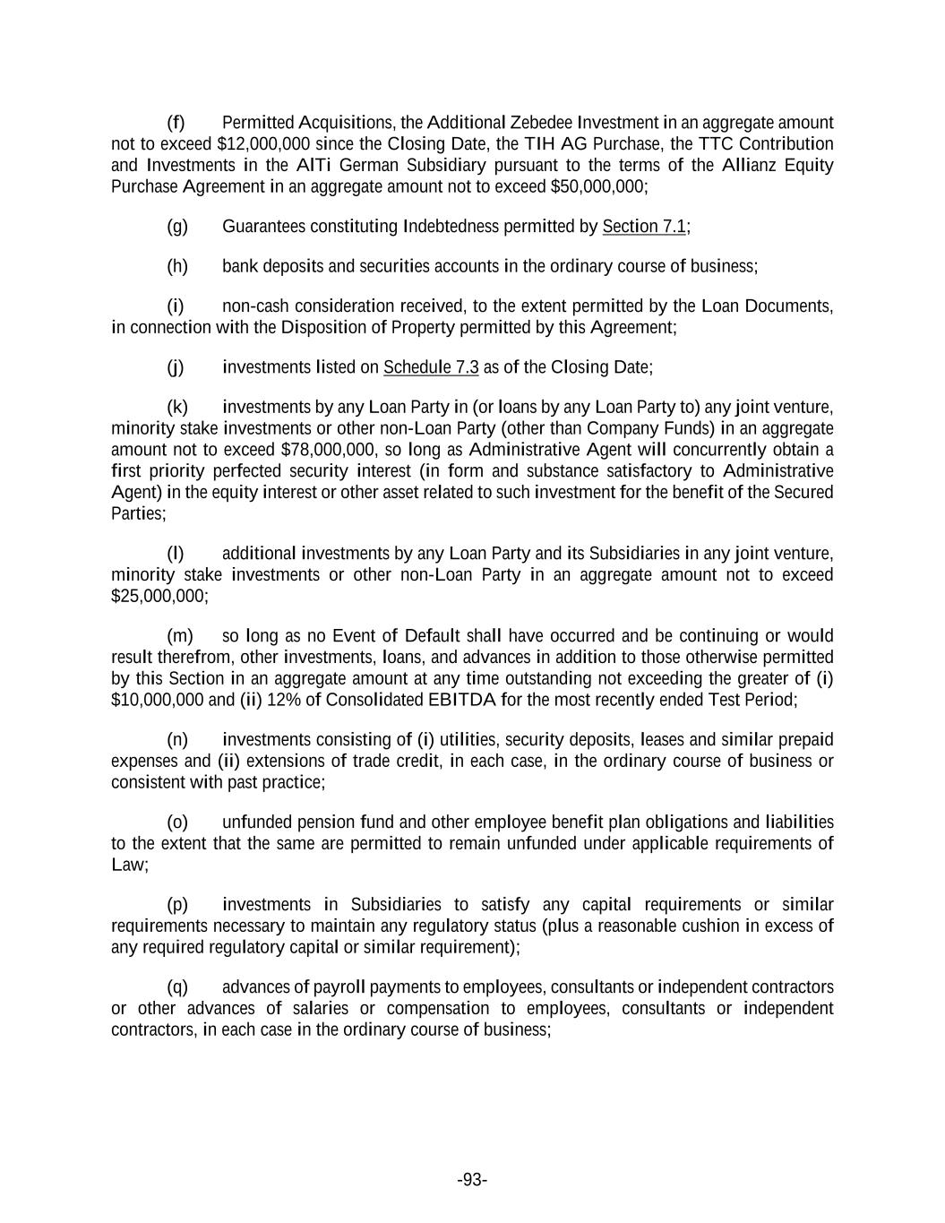 -93- (f) Permitted Acquisitions, the Additional Zebedee Investment in an aggregate amount not to exceed $12,000,000 since the Closing Date, the TIH AG Purchase, the TTC Contribution and Investments in the AlTi German Subsidiary pursuant to the terms of the Allianz Equity Purchase Agreement in an aggregate amount not to exceed $50,000,000; (g) Guarantees constituting Indebtedness permitted by Section 7.1; (h) bank deposits and securities accounts in the ordinary course of business; (i) non-cash consideration received, to the extent permitted by the Loan Documents, in connection with the Disposition of Property permitted by this Agreement; (j) investments listed on Schedule 7.3 as of the Closing Date; (k) investments by any Loan Party in (or loans by any Loan Party to) any joint venture, minority stake investments or other non-Loan Party (other than Company Funds) in an aggregate amount not to exceed $78,000,000, so long as Administrative Agent will concurrently obtain a first priority perfected security interest (in form and substance satisfactory to Administrative Agent) in the equity interest or other asset related to such investment for the benefit of the Secured Parties; (l) additional investments by any Loan Party and its Subsidiaries in any joint venture, minority stake investments or other non-Loan Party in an aggregate amount not to exceed $25,000,000; (m) so long as no Event of Default shall have occurred and be continuing or would result therefrom, other investments, loans, and advances in addition to those otherwise permitted by this Section in an aggregate amount at any time outstanding not exceeding the greater of (i) $10,000,000 and (ii) 12% of Consolidated EBITDA for the most recently ended Test Period; (n) investments consisting of (i) utilities, security deposits, leases and similar prepaid expenses and (ii) extensions of trade credit, in each case, in the ordinary course of business or consistent with past practice; (o) unfunded pension fund and other employee benefit plan obligations and liabilities to the extent that the same are permitted to remain unfunded under applicable requirements of Law; (p) investments in Subsidiaries to satisfy any capital requirements or similar requirements necessary to maintain any regulatory status (plus a reasonable cushion in excess of any required regulatory capital or similar requirement); (q) advances of payroll payments to employees, consultants or independent contractors or other advances of salaries or compensation to employees, consultants or independent contractors, in each case in the ordinary course of business;