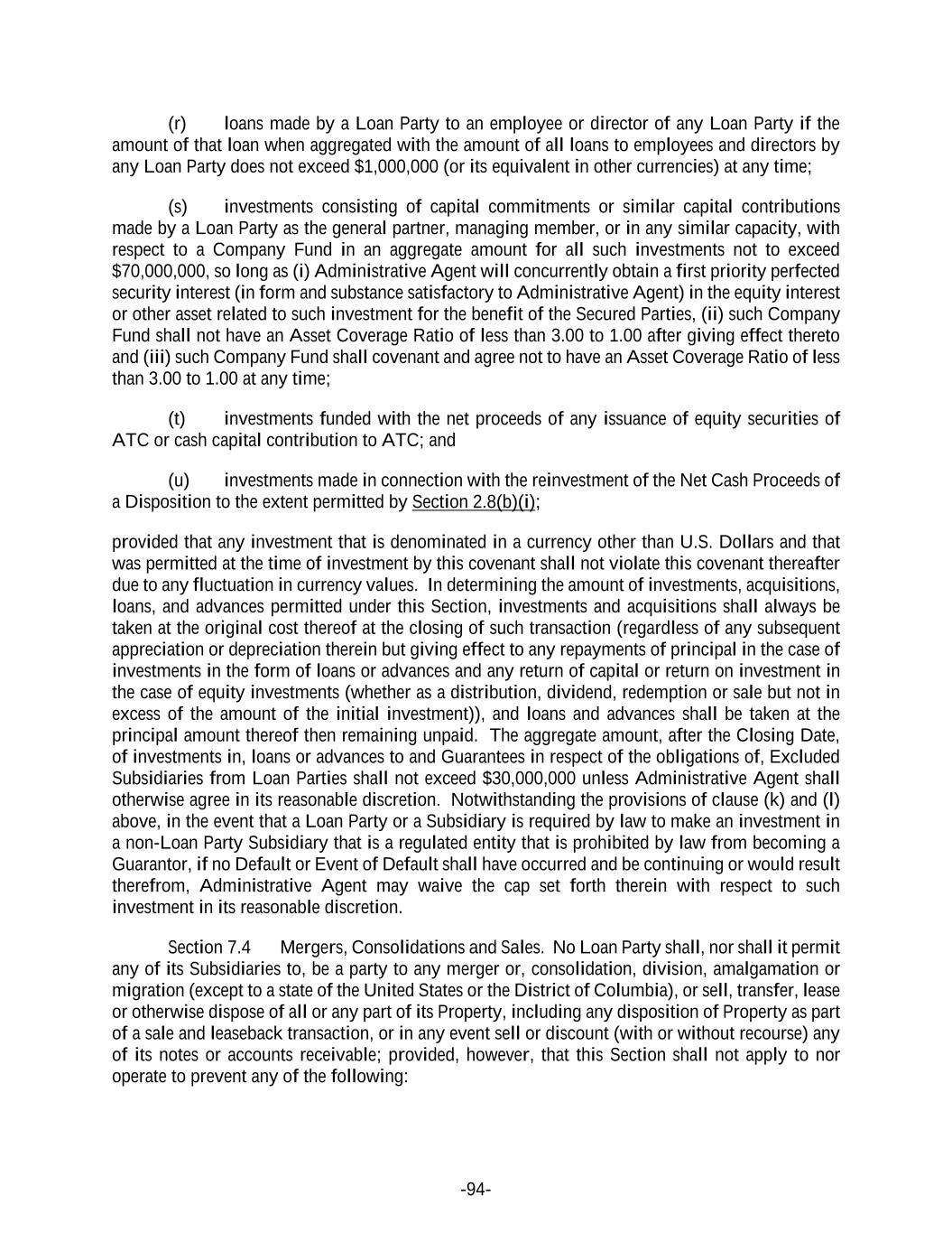 -94- (r) loans made by a Loan Party to an employee or director of any Loan Party if the amount of that loan when aggregated with the amount of all loans to employees and directors by any Loan Party does not exceed $1,000,000 (or its equivalent in other currencies) at any time; (s) investments consisting of capital commitments or similar capital contributions made by a Loan Party as the general partner, managing member, or in any similar capacity, with respect to a Company Fund in an aggregate amount for all such investments not to exceed $70,000,000, so long as (i) Administrative Agent will concurrently obtain a first priority perfected security interest (in form and substance satisfactory to Administrative Agent) in the equity interest or other asset related to such investment for the benefit of the Secured Parties, (ii) such Company Fund shall not have an Asset Coverage Ratio of less than 3.00 to 1.00 after giving effect thereto and (iii) such Company Fund shall covenant and agree not to have an Asset Coverage Ratio of less than 3.00 to 1.00 at any time; (t) investments funded with the net proceeds of any issuance of equity securities of ATC or cash capital contribution to ATC; and (u) investments made in connection with the reinvestment of the Net Cash Proceeds of a Disposition to the extent permitted by Section 2.8(b)(i); provided that any investment that is denominated in a currency other than U.S. Dollars and that was permitted at the time of investment by this covenant shall not violate this covenant thereafter due to any fluctuation in currency values. In determining the amount of investments, acquisitions, loans, and advances permitted under this Section, investments and acquisitions shall always be taken at the original cost thereof at the closing of such transaction (regardless of any subsequent appreciation or depreciation therein but giving effect to any repayments of principal in the case of investments in the form of loans or advances and any return of capital or return on investment in the case of equity investments (whether as a distribution, dividend, redemption or sale but not in excess of the amount of the initial investment)), and loans and advances shall be taken at the principal amount thereof then remaining unpaid. The aggregate amount, after the Closing Date, of investments in, loans or advances to and Guarantees in respect of the obligations of, Excluded Subsidiaries from Loan Parties shall not exceed $30,000,000 unless Administrative Agent shall otherwise agree in its reasonable discretion. Notwithstanding the provisions of clause (k) and (l) above, in the event that a Loan Party or a Subsidiary is required by law to make an investment in a non-Loan Party Subsidiary that is a regulated entity that is prohibited by law from becoming a Guarantor, if no Default or Event of Default shall have occurred and be continuing or would result therefrom, Administrative Agent may waive the cap set forth therein with respect to such investment in its reasonable discretion. Section 7.4 Mergers, Consolidations and Sales. No Loan Party shall, nor shall it permit any of its Subsidiaries to, be a party to any merger or, consolidation, division, amalgamation or migration (except to a state of the United States or the District of Columbia), or sell, transfer, lease or otherwise dispose of all or any part of its Property, including any disposition of Property as part of a sale and leaseback transaction, or in any event sell or discount (with or without recourse) any of its notes or accounts receivable; provided, however, that this Section shall not apply to nor operate to prevent any of the following: