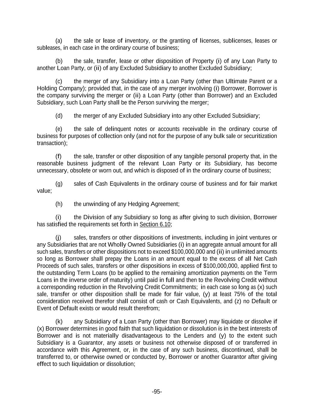 -95- (a) the sale or lease of inventory, or the granting of licenses, sublicenses, leases or subleases, in each case in the ordinary course of business; (b) the sale, transfer, lease or other disposition of Property (i) of any Loan Party to another Loan Party, or (ii) of any Excluded Subsidiary to another Excluded Subsidiary; (c) the merger of any Subsidiary into a Loan Party (other than Ultimate Parent or a Holding Company); provided that, in the case of any merger involving (i) Borrower, Borrower is the company surviving the merger or (ii) a Loan Party (other than Borrower) and an Excluded Subsidiary, such Loan Party shall be the Person surviving the merger; (d) the merger of any Excluded Subsidiary into any other Excluded Subsidiary; (e) the sale of delinquent notes or accounts receivable in the ordinary course of business for purposes of collection only (and not for the purpose of any bulk sale or securitization transaction); (f) the sale, transfer or other disposition of any tangible personal property that, in the reasonable business judgment of the relevant Loan Party or its Subsidiary, has become unnecessary, obsolete or worn out, and which is disposed of in the ordinary course of business; (g) sales of Cash Equivalents in the ordinary course of business and for fair market value; (h) the unwinding of any Hedging Agreement; (i) the Division of any Subsidiary so long as after giving to such division, Borrower has satisfied the requirements set forth in Section 6.10; (j) sales, transfers or other dispositions of investments, including in joint ventures or any Subsidiaries that are not Wholly Owned Subsidiaries (i) in an aggregate annual amount for all such sales, transfers or other dispositions not to exceed $100,000,000 and (ii) in unlimited amounts so long as Borrower shall prepay the Loans in an amount equal to the excess of all Net Cash Proceeds of such sales, transfers or other dispositions in excess of $100,000,000, applied first to the outstanding Term Loans (to be applied to the remaining amortization payments on the Term Loans in the inverse order of maturity) until paid in full and then to the Revolving Credit without a corresponding reduction in the Revolving Credit Commitments; in each case so long as (x) such sale, transfer or other disposition shall be made for fair value, (y) at least 75% of the total consideration received therefor shall consist of cash or Cash Equivalents, and (z) no Default or Event of Default exists or would result therefrom; (k) any Subsidiary of a Loan Party (other than Borrower) may liquidate or dissolve if (x) Borrower determines in good faith that such liquidation or dissolution is in the best interests of Borrower and is not materially disadvantageous to the Lenders and (y) to the extent such Subsidiary is a Guarantor, any assets or business not otherwise disposed of or transferred in accordance with this Agreement, or, in the case of any such business, discontinued, shall be transferred to, or otherwise owned or conducted by, Borrower or another Guarantor after giving effect to such liquidation or dissolution;