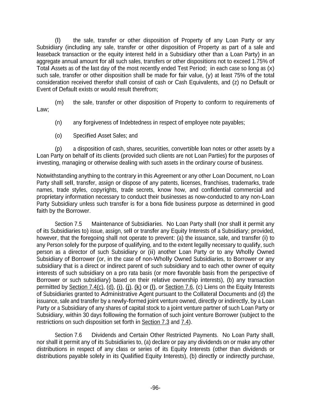 -96- (l) the sale, transfer or other disposition of Property of any Loan Party or any Subsidiary (including any sale, transfer or other disposition of Property as part of a sale and leaseback transaction or the equity interest held in a Subsidiary other than a Loan Party) in an aggregate annual amount for all such sales, transfers or other dispositions not to exceed 1.75% of Total Assets as of the last day of the most recently ended Test Period; in each case so long as (x) such sale, transfer or other disposition shall be made for fair value, (y) at least 75% of the total consideration received therefor shall consist of cash or Cash Equivalents, and (z) no Default or Event of Default exists or would result therefrom; (m) the sale, transfer or other disposition of Property to conform to requirements of Law; (n) any forgiveness of Indebtedness in respect of employee note payables; (o) Specified Asset Sales; and (p) a disposition of cash, shares, securities, convertible loan notes or other assets by a Loan Party on behalf of its clients (provided such clients are not Loan Parties) for the purposes of investing, managing or otherwise dealing with such assets in the ordinary course of business. Notwithstanding anything to the contrary in this Agreement or any other Loan Document, no Loan Party shall sell, transfer, assign or dispose of any patents, licenses, franchises, trademarks, trade names, trade styles, copyrights, trade secrets, know how, and confidential commercial and proprietary information necessary to conduct their businesses as now-conducted to any non-Loan Party Subsidiary unless such transfer is for a bona fide business purpose as determined in good faith by the Borrower. Section 7.5 Maintenance of Subsidiaries. No Loan Party shall (nor shall it permit any of its Subsidiaries to) issue, assign, sell or transfer any Equity Interests of a Subsidiary; provided, however, that the foregoing shall not operate to prevent: (a) the issuance, sale, and transfer (i) to any Person solely for the purpose of qualifying, and to the extent legally necessary to qualify, such person as a director of such Subsidiary or (ii) another Loan Party or to any Wholly Owned Subsidiary of Borrower (or, in the case of non-Wholly Owned Subsidiaries, to Borrower or any subsidiary that is a direct or indirect parent of such subsidiary and to each other owner of equity interests of such subsidiary on a pro rata basis (or more favorable basis from the perspective of Borrower or such subsidiary) based on their relative ownership interests), (b) any transaction permitted by Section 7.4(c), (d), (i), (j), (k) or (l), or Section 7.6, (c) Liens on the Equity Interests of Subsidiaries granted to Administrative Agent pursuant to the Collateral Documents and (d) the issuance, sale and transfer by a newly-formed joint venture owned, directly or indirectly, by a Loan Party or a Subsidiary of any shares of capital stock to a joint venture partner of such Loan Party or Subsidiary, within 30 days following the formation of such joint venture Borrower (subject to the restrictions on such disposition set forth in Section 7.3 and 7.4). Section 7.6 Dividends and Certain Other Restricted Payments. No Loan Party shall, nor shall it permit any of its Subsidiaries to, (a) declare or pay any dividends on or make any other distributions in respect of any class or series of its Equity Interests (other than dividends or distributions payable solely in its Qualified Equity Interests), (b) directly or indirectly purchase,