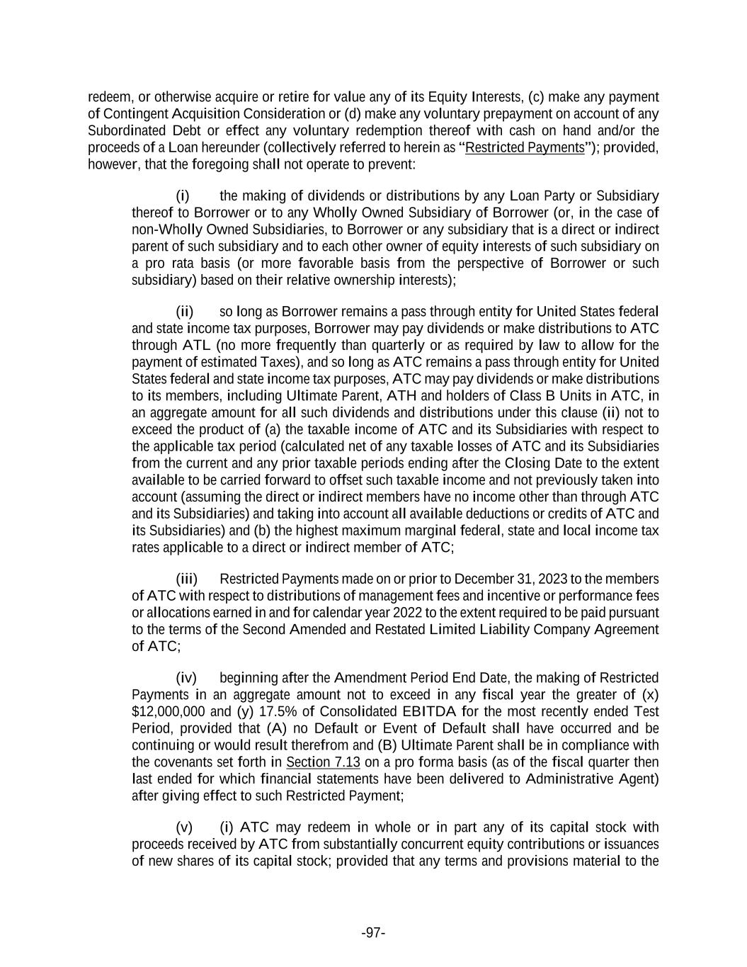 -97- redeem, or otherwise acquire or retire for value any of its Equity Interests, (c) make any payment of Contingent Acquisition Consideration or (d) make any voluntary prepayment on account of any Subordinated Debt or effect any voluntary redemption thereof with cash on hand and/or the proceeds of a Loan hereunder (collectively referred to herein as “Restricted Payments”); provided, however, that the foregoing shall not operate to prevent: (i) the making of dividends or distributions by any Loan Party or Subsidiary thereof to Borrower or to any Wholly Owned Subsidiary of Borrower (or, in the case of non-Wholly Owned Subsidiaries, to Borrower or any subsidiary that is a direct or indirect parent of such subsidiary and to each other owner of equity interests of such subsidiary on a pro rata basis (or more favorable basis from the perspective of Borrower or such subsidiary) based on their relative ownership interests); (ii) so long as Borrower remains a pass through entity for United States federal and state income tax purposes, Borrower may pay dividends or make distributions to ATC through ATL (no more frequently than quarterly or as required by law to allow for the payment of estimated Taxes), and so long as ATC remains a pass through entity for United States federal and state income tax purposes, ATC may pay dividends or make distributions to its members, including Ultimate Parent, ATH and holders of Class B Units in ATC, in an aggregate amount for all such dividends and distributions under this clause (ii) not to exceed the product of (a) the taxable income of ATC and its Subsidiaries with respect to the applicable tax period (calculated net of any taxable losses of ATC and its Subsidiaries from the current and any prior taxable periods ending after the Closing Date to the extent available to be carried forward to offset such taxable income and not previously taken into account (assuming the direct or indirect members have no income other than through ATC and its Subsidiaries) and taking into account all available deductions or credits of ATC and its Subsidiaries) and (b) the highest maximum marginal federal, state and local income tax rates applicable to a direct or indirect member of ATC; (iii) Restricted Payments made on or prior to December 31, 2023 to the members of ATC with respect to distributions of management fees and incentive or performance fees or allocations earned in and for calendar year 2022 to the extent required to be paid pursuant to the terms of the Second Amended and Restated Limited Liability Company Agreement of ATC; (iv) beginning after the Amendment Period End Date, the making of Restricted Payments in an aggregate amount not to exceed in any fiscal year the greater of (x) $12,000,000 and (y) 17.5% of Consolidated EBITDA for the most recently ended Test Period, provided that (A) no Default or Event of Default shall have occurred and be continuing or would result therefrom and (B) Ultimate Parent shall be in compliance with the covenants set forth in Section 7.13 on a pro forma basis (as of the fiscal quarter then last ended for which financial statements have been delivered to Administrative Agent) after giving effect to such Restricted Payment; (v) (i) ATC may redeem in whole or in part any of its capital stock with proceeds received by ATC from substantially concurrent equity contributions or issuances of new shares of its capital stock; provided that any terms and provisions material to the
