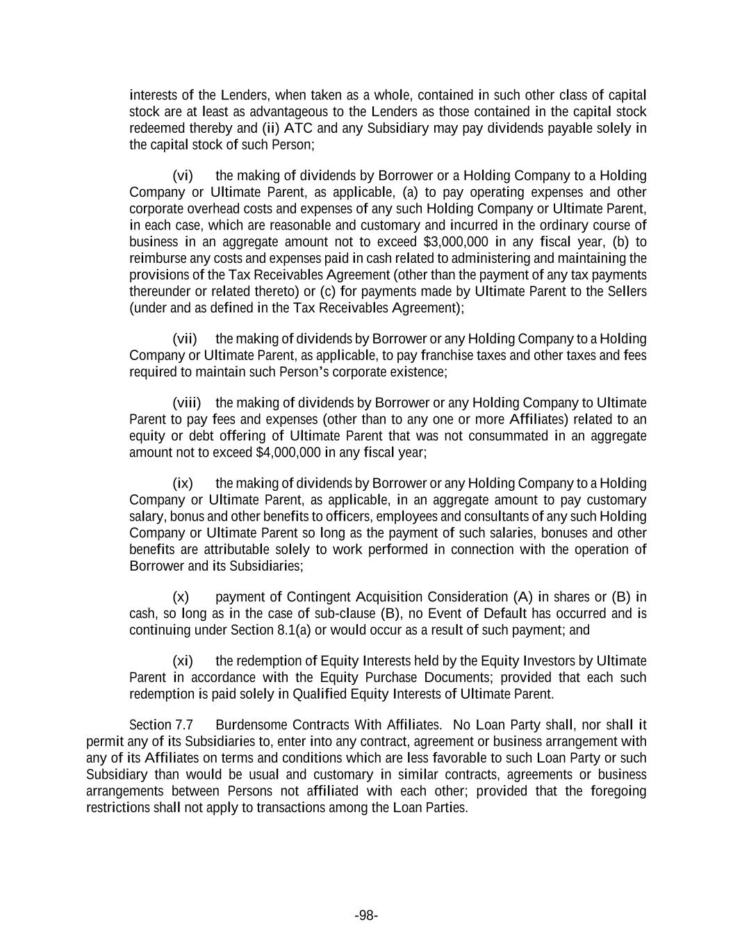 -98- interests of the Lenders, when taken as a whole, contained in such other class of capital stock are at least as advantageous to the Lenders as those contained in the capital stock redeemed thereby and (ii) ATC and any Subsidiary may pay dividends payable solely in the capital stock of such Person; (vi) the making of dividends by Borrower or a Holding Company to a Holding Company or Ultimate Parent, as applicable, (a) to pay operating expenses and other corporate overhead costs and expenses of any such Holding Company or Ultimate Parent, in each case, which are reasonable and customary and incurred in the ordinary course of business in an aggregate amount not to exceed $3,000,000 in any fiscal year, (b) to reimburse any costs and expenses paid in cash related to administering and maintaining the provisions of the Tax Receivables Agreement (other than the payment of any tax payments thereunder or related thereto) or (c) for payments made by Ultimate Parent to the Sellers (under and as defined in the Tax Receivables Agreement); (vii) the making of dividends by Borrower or any Holding Company to a Holding Company or Ultimate Parent, as applicable, to pay franchise taxes and other taxes and fees required to maintain such Person’s corporate existence; (viii) the making of dividends by Borrower or any Holding Company to Ultimate Parent to pay fees and expenses (other than to any one or more Affiliates) related to an equity or debt offering of Ultimate Parent that was not consummated in an aggregate amount not to exceed $4,000,000 in any fiscal year; (ix) the making of dividends by Borrower or any Holding Company to a Holding Company or Ultimate Parent, as applicable, in an aggregate amount to pay customary salary, bonus and other benefits to officers, employees and consultants of any such Holding Company or Ultimate Parent so long as the payment of such salaries, bonuses and other benefits are attributable solely to work performed in connection with the operation of Borrower and its Subsidiaries; (x) payment of Contingent Acquisition Consideration (A) in shares or (B) in cash, so long as in the case of sub-clause (B), no Event of Default has occurred and is continuing under Section 8.1(a) or would occur as a result of such payment; and (xi) the redemption of Equity Interests held by the Equity Investors by Ultimate Parent in accordance with the Equity Purchase Documents; provided that each such redemption is paid solely in Qualified Equity Interests of Ultimate Parent. Section 7.7 Burdensome Contracts With Affiliates. No Loan Party shall, nor shall it permit any of its Subsidiaries to, enter into any contract, agreement or business arrangement with any of its Affiliates on terms and conditions which are less favorable to such Loan Party or such Subsidiary than would be usual and customary in similar contracts, agreements or business arrangements between Persons not affiliated with each other; provided that the foregoing restrictions shall not apply to transactions among the Loan Parties.