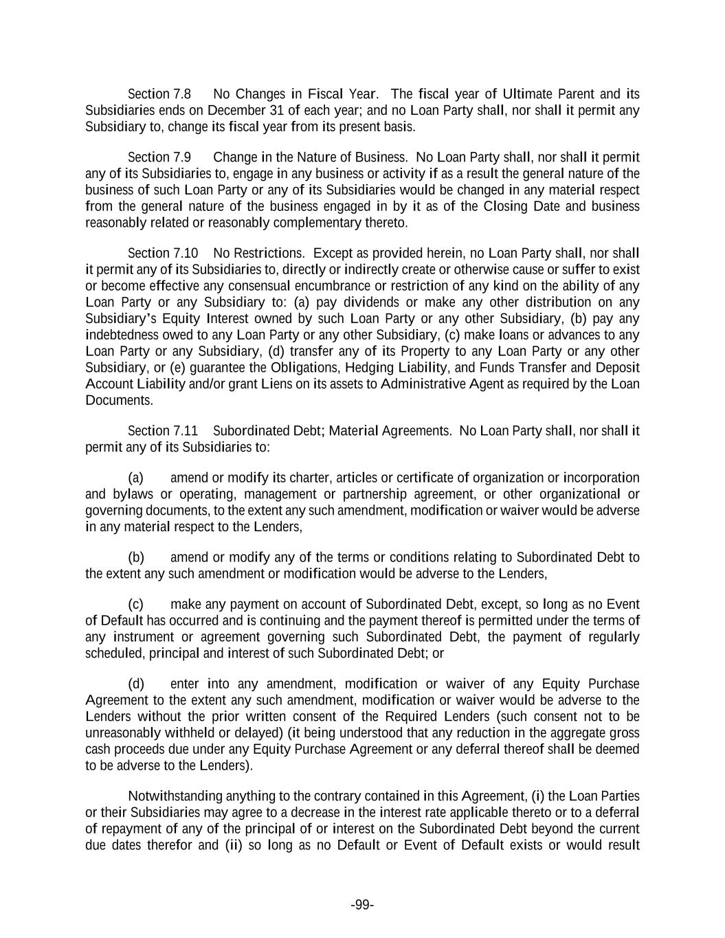 -99- Section 7.8 No Changes in Fiscal Year. The fiscal year of Ultimate Parent and its Subsidiaries ends on December 31 of each year; and no Loan Party shall, nor shall it permit any Subsidiary to, change its fiscal year from its present basis. Section 7.9 Change in the Nature of Business. No Loan Party shall, nor shall it permit any of its Subsidiaries to, engage in any business or activity if as a result the general nature of the business of such Loan Party or any of its Subsidiaries would be changed in any material respect from the general nature of the business engaged in by it as of the Closing Date and business reasonably related or reasonably complementary thereto. Section 7.10 No Restrictions. Except as provided herein, no Loan Party shall, nor shall it permit any of its Subsidiaries to, directly or indirectly create or otherwise cause or suffer to exist or become effective any consensual encumbrance or restriction of any kind on the ability of any Loan Party or any Subsidiary to: (a) pay dividends or make any other distribution on any Subsidiary’s Equity Interest owned by such Loan Party or any other Subsidiary, (b) pay any indebtedness owed to any Loan Party or any other Subsidiary, (c) make loans or advances to any Loan Party or any Subsidiary, (d) transfer any of its Property to any Loan Party or any other Subsidiary, or (e) guarantee the Obligations, Hedging Liability, and Funds Transfer and Deposit Account Liability and/or grant Liens on its assets to Administrative Agent as required by the Loan Documents. Section 7.11 Subordinated Debt; Material Agreements. No Loan Party shall, nor shall it permit any of its Subsidiaries to: (a) amend or modify its charter, articles or certificate of organization or incorporation and bylaws or operating, management or partnership agreement, or other organizational or governing documents, to the extent any such amendment, modification or waiver would be adverse in any material respect to the Lenders, (b) amend or modify any of the terms or conditions relating to Subordinated Debt to the extent any such amendment or modification would be adverse to the Lenders, (c) make any payment on account of Subordinated Debt, except, so long as no Event of Default has occurred and is continuing and the payment thereof is permitted under the terms of any instrument or agreement governing such Subordinated Debt, the payment of regularly scheduled, principal and interest of such Subordinated Debt; or (d) enter into any amendment, modification or waiver of any Equity Purchase Agreement to the extent any such amendment, modification or waiver would be adverse to the Lenders without the prior written consent of the Required Lenders (such consent not to be unreasonably withheld or delayed) (it being understood that any reduction in the aggregate gross cash proceeds due under any Equity Purchase Agreement or any deferral thereof shall be deemed to be adverse to the Lenders). Notwithstanding anything to the contrary contained in this Agreement, (i) the Loan Parties or their Subsidiaries may agree to a decrease in the interest rate applicable thereto or to a deferral of repayment of any of the principal of or interest on the Subordinated Debt beyond the current due dates therefor and (ii) so long as no Default or Event of Default exists or would result