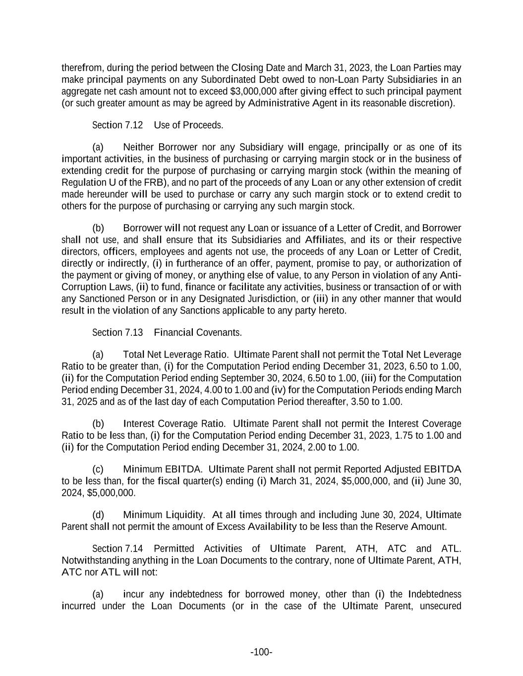 -100- therefrom, during the period between the Closing Date and March 31, 2023, the Loan Parties may make principal payments on any Subordinated Debt owed to non-Loan Party Subsidiaries in an aggregate net cash amount not to exceed $3,000,000 after giving effect to such principal payment (or such greater amount as may be agreed by Administrative Agent in its reasonable discretion). Section 7.12 Use of Proceeds. (a) Neither Borrower nor any Subsidiary will engage, principally or as one of its important activities, in the business of purchasing or carrying margin stock or in the business of extending credit for the purpose of purchasing or carrying margin stock (within the meaning of Regulation U of the FRB), and no part of the proceeds of any Loan or any other extension of credit made hereunder will be used to purchase or carry any such margin stock or to extend credit to others for the purpose of purchasing or carrying any such margin stock. (b) Borrower will not request any Loan or issuance of a Letter of Credit, and Borrower shall not use, and shall ensure that its Subsidiaries and Affiliates, and its or their respective directors, officers, employees and agents not use, the proceeds of any Loan or Letter of Credit, directly or indirectly, (i) in furtherance of an offer, payment, promise to pay, or authorization of the payment or giving of money, or anything else of value, to any Person in violation of any Anti- Corruption Laws, (ii) to fund, finance or facilitate any activities, business or transaction of or with any Sanctioned Person or in any Designated Jurisdiction, or (iii) in any other manner that would result in the violation of any Sanctions applicable to any party hereto. Section 7.13 Financial Covenants. (a) Total Net Leverage Ratio. Ultimate Parent shall not permit the Total Net Leverage Ratio to be greater than, (i) for the Computation Period ending December 31, 2023, 6.50 to 1.00, (ii) for the Computation Period ending September 30, 2024, 6.50 to 1.00, (iii) for the Computation Period ending December 31, 2024, 4.00 to 1.00 and (iv) for the Computation Periods ending March 31, 2025 and as of the last day of each Computation Period thereafter, 3.50 to 1.00. (b) Interest Coverage Ratio. Ultimate Parent shall not permit the Interest Coverage Ratio to be less than, (i) for the Computation Period ending December 31, 2023, 1.75 to 1.00 and (ii) for the Computation Period ending December 31, 2024, 2.00 to 1.00. (c) Minimum EBITDA. Ultimate Parent shall not permit Reported Adjusted EBITDA to be less than, for the fiscal quarter(s) ending (i) March 31, 2024, $5,000,000, and (ii) June 30, 2024, $5,000,000. (d) Minimum Liquidity. At all times through and including June 30, 2024, Ultimate Parent shall not permit the amount of Excess Availability to be less than the Reserve Amount. Section 7.14 Permitted Activities of Ultimate Parent, ATH, ATC and ATL. Notwithstanding anything in the Loan Documents to the contrary, none of Ultimate Parent, ATH, ATC nor ATL will not: (a) incur any indebtedness for borrowed money, other than (i) the Indebtedness incurred under the Loan Documents (or in the case of the Ultimate Parent, unsecured