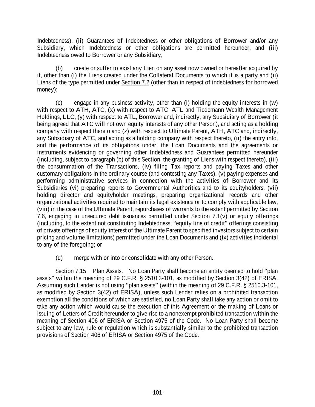 -101- Indebtedness), (ii) Guarantees of Indebtedness or other obligations of Borrower and/or any Subsidiary, which Indebtedness or other obligations are permitted hereunder, and (iii) Indebtedness owed to Borrower or any Subsidiary; (b) create or suffer to exist any Lien on any asset now owned or hereafter acquired by it, other than (i) the Liens created under the Collateral Documents to which it is a party and (ii) Liens of the type permitted under Section 7.2 (other than in respect of indebtedness for borrowed money); (c) engage in any business activity, other than (i) holding the equity interests in (w) with respect to ATH, ATC, (x) with respect to ATC, ATL and Tiedemann Wealth Management Holdings, LLC, (y) with respect to ATL, Borrower and, indirectly, any Subsidiary of Borrower (it being agreed that ATC will not own equity interests of any other Person), and acting as a holding company with respect thereto and (z) with respect to Ultimate Parent, ATH, ATC and, indirectly, any Subsidiary of ATC, and acting as a holding company with respect thereto, (ii) the entry into, and the performance of its obligations under, the Loan Documents and the agreements or instruments evidencing or governing other Indebtedness and Guarantees permitted hereunder (including, subject to paragraph (b) of this Section, the granting of Liens with respect thereto), (iii) the consummation of the Transactions, (iv) filing Tax reports and paying Taxes and other customary obligations in the ordinary course (and contesting any Taxes), (v) paying expenses and performing administrative services in connection with the activities of Borrower and its Subsidiaries (vi) preparing reports to Governmental Authorities and to its equityholders, (vii) holding director and equityholder meetings, preparing organizational records and other organizational activities required to maintain its legal existence or to comply with applicable law, (viii) in the case of the Ultimate Parent, repurchases of warrants to the extent permitted by Section 7.6, engaging in unsecured debt issuances permitted under Section 7.1(v) or equity offerings (including, to the extent not constituting Indebtedness, “equity line of credit” offerings consisting of private offerings of equity interest of the Ultimate Parent to specified investors subject to certain pricing and volume limitations) permitted under the Loan Documents and (ix) activities incidental to any of the foregoing; or (d) merge with or into or consolidate with any other Person. Section 7.15 Plan Assets. No Loan Party shall become an entity deemed to hold “plan assets” within the meaning of 29 C.F.R. § 2510.3-101, as modified by Section 3(42) of ERISA. Assuming such Lender is not using “plan assets” (within the meaning of 29 C.F.R. § 2510.3-101, as modified by Section 3(42) of ERISA), unless such Lender relies on a prohibited transaction exemption all the conditions of which are satisfied, no Loan Party shall take any action or omit to take any action which would cause the execution of this Agreement or the making of Loans or issuing of Letters of Credit hereunder to give rise to a nonexempt prohibited transaction within the meaning of Section 406 of ERISA or Section 4975 of the Code. No Loan Party shall become subject to any law, rule or regulation which is substantially similar to the prohibited transaction provisions of Section 406 of ERISA or Section 4975 of the Code.