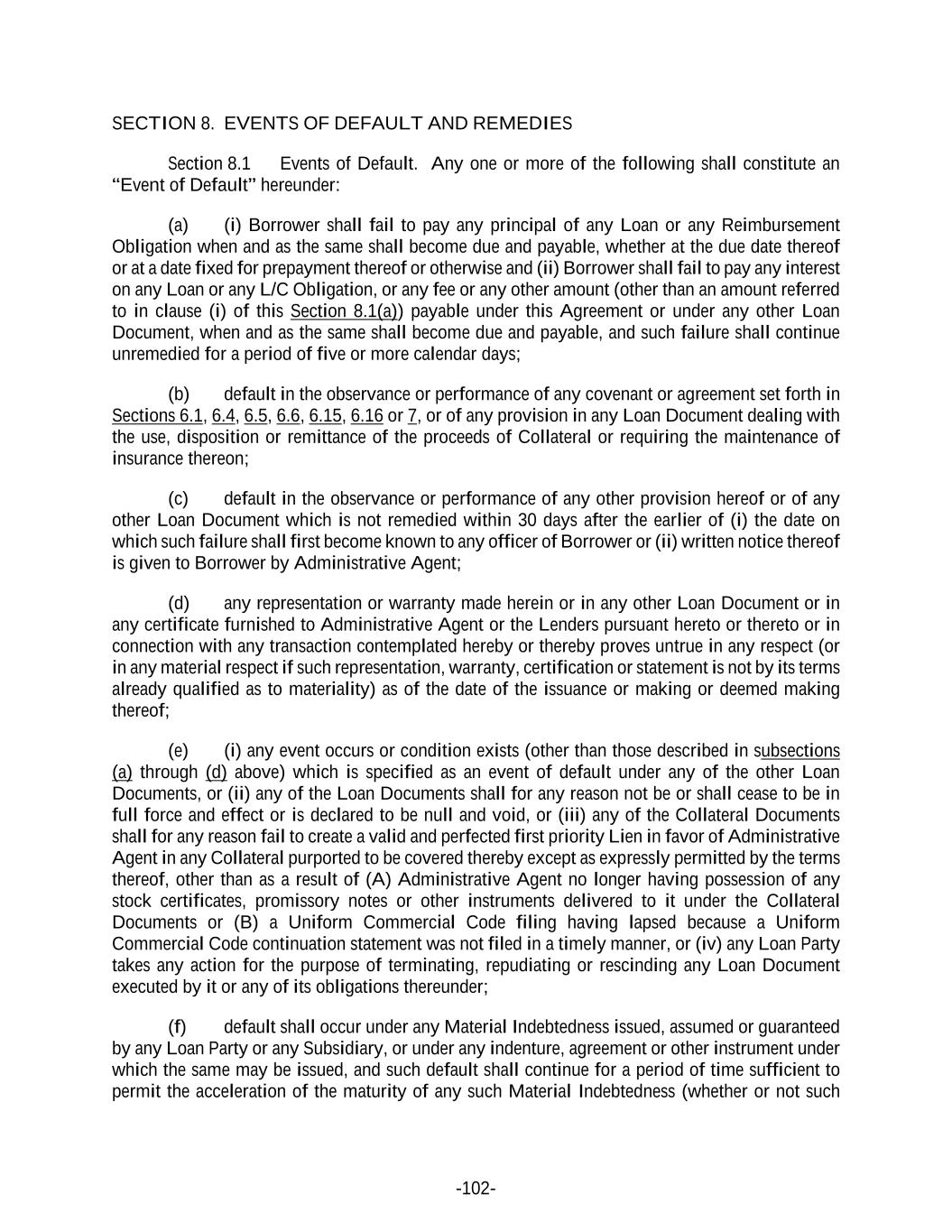 -102- SECTION 8. EVENTS OF DEFAULT AND REMEDIES Section 8.1 Events of Default. Any one or more of the following shall constitute an “Event of Default” hereunder: (a) (i) Borrower shall fail to pay any principal of any Loan or any Reimbursement Obligation when and as the same shall become due and payable, whether at the due date thereof or at a date fixed for prepayment thereof or otherwise and (ii) Borrower shall fail to pay any interest on any Loan or any L/C Obligation, or any fee or any other amount (other than an amount referred to in clause (i) of this Section 8.1(a)) payable under this Agreement or under any other Loan Document, when and as the same shall become due and payable, and such failure shall continue unremedied for a period of five or more calendar days; (b) default in the observance or performance of any covenant or agreement set forth in Sections 6.1, 6.4, 6.5, 6.6, 6.15, 6.16 or 7, or of any provision in any Loan Document dealing with the use, disposition or remittance of the proceeds of Collateral or requiring the maintenance of insurance thereon; (c) default in the observance or performance of any other provision hereof or of any other Loan Document which is not remedied within 30 days after the earlier of (i) the date on which such failure shall first become known to any officer of Borrower or (ii) written notice thereof is given to Borrower by Administrative Agent; (d) any representation or warranty made herein or in any other Loan Document or in any certificate furnished to Administrative Agent or the Lenders pursuant hereto or thereto or in connection with any transaction contemplated hereby or thereby proves untrue in any respect (or in any material respect if such representation, warranty, certification or statement is not by its terms already qualified as to materiality) as of the date of the issuance or making or deemed making thereof; (e) (i) any event occurs or condition exists (other than those described in subsections (a) through (d) above) which is specified as an event of default under any of the other Loan Documents, or (ii) any of the Loan Documents shall for any reason not be or shall cease to be in full force and effect or is declared to be null and void, or (iii) any of the Collateral Documents shall for any reason fail to create a valid and perfected first priority Lien in favor of Administrative Agent in any Collateral purported to be covered thereby except as expressly permitted by the terms thereof, other than as a result of (A) Administrative Agent no longer having possession of any stock certificates, promissory notes or other instruments delivered to it under the Collateral Documents or (B) a Uniform Commercial Code filing having lapsed because a Uniform Commercial Code continuation statement was not filed in a timely manner, or (iv) any Loan Party takes any action for the purpose of terminating, repudiating or rescinding any Loan Document executed by it or any of its obligations thereunder; (f) default shall occur under any Material Indebtedness issued, assumed or guaranteed by any Loan Party or any Subsidiary, or under any indenture, agreement or other instrument under which the same may be issued, and such default shall continue for a period of time sufficient to permit the acceleration of the maturity of any such Material Indebtedness (whether or not such