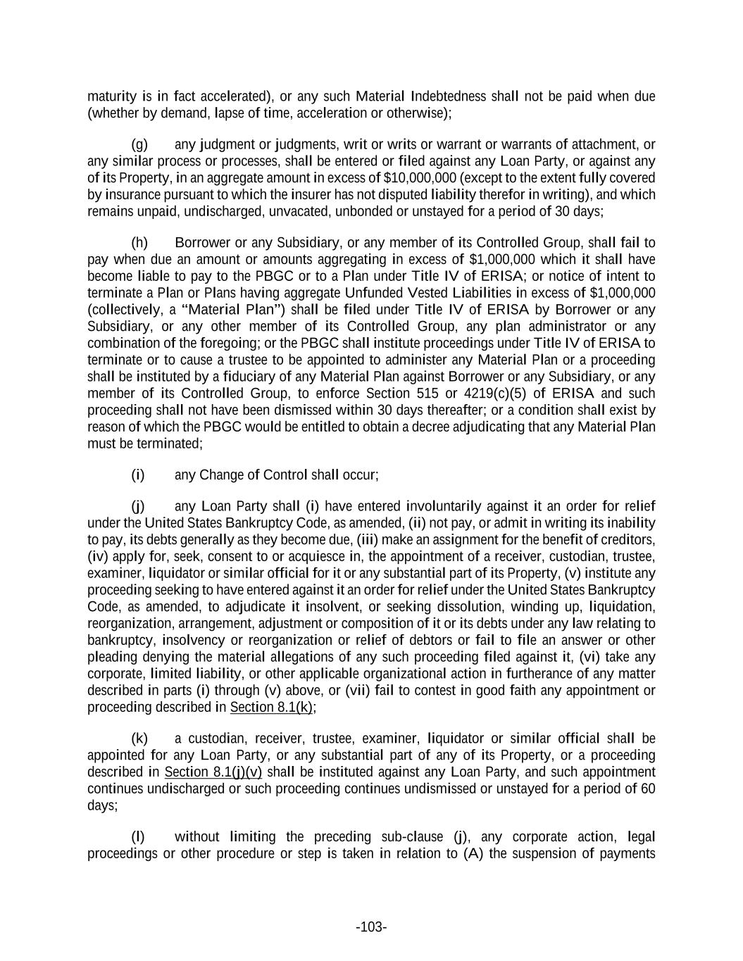 -103- maturity is in fact accelerated), or any such Material Indebtedness shall not be paid when due (whether by demand, lapse of time, acceleration or otherwise); (g) any judgment or judgments, writ or writs or warrant or warrants of attachment, or any similar process or processes, shall be entered or filed against any Loan Party, or against any of its Property, in an aggregate amount in excess of $10,000,000 (except to the extent fully covered by insurance pursuant to which the insurer has not disputed liability therefor in writing), and which remains unpaid, undischarged, unvacated, unbonded or unstayed for a period of 30 days; (h) Borrower or any Subsidiary, or any member of its Controlled Group, shall fail to pay when due an amount or amounts aggregating in excess of $1,000,000 which it shall have become liable to pay to the PBGC or to a Plan under Title IV of ERISA; or notice of intent to terminate a Plan or Plans having aggregate Unfunded Vested Liabilities in excess of $1,000,000 (collectively, a “Material Plan”) shall be filed under Title IV of ERISA by Borrower or any Subsidiary, or any other member of its Controlled Group, any plan administrator or any combination of the foregoing; or the PBGC shall institute proceedings under Title IV of ERISA to terminate or to cause a trustee to be appointed to administer any Material Plan or a proceeding shall be instituted by a fiduciary of any Material Plan against Borrower or any Subsidiary, or any member of its Controlled Group, to enforce Section 515 or 4219(c)(5) of ERISA and such proceeding shall not have been dismissed within 30 days thereafter; or a condition shall exist by reason of which the PBGC would be entitled to obtain a decree adjudicating that any Material Plan must be terminated; (i) any Change of Control shall occur; (j) any Loan Party shall (i) have entered involuntarily against it an order for relief under the United States Bankruptcy Code, as amended, (ii) not pay, or admit in writing its inability to pay, its debts generally as they become due, (iii) make an assignment for the benefit of creditors, (iv) apply for, seek, consent to or acquiesce in, the appointment of a receiver, custodian, trustee, examiner, liquidator or similar official for it or any substantial part of its Property, (v) institute any proceeding seeking to have entered against it an order for relief under the United States Bankruptcy Code, as amended, to adjudicate it insolvent, or seeking dissolution, winding up, liquidation, reorganization, arrangement, adjustment or composition of it or its debts under any law relating to bankruptcy, insolvency or reorganization or relief of debtors or fail to file an answer or other pleading denying the material allegations of any such proceeding filed against it, (vi) take any corporate, limited liability, or other applicable organizational action in furtherance of any matter described in parts (i) through (v) above, or (vii) fail to contest in good faith any appointment or proceeding described in Section 8.1(k); (k) a custodian, receiver, trustee, examiner, liquidator or similar official shall be appointed for any Loan Party, or any substantial part of any of its Property, or a proceeding described in Section 8.1(j)(v) shall be instituted against any Loan Party, and such appointment continues undischarged or such proceeding continues undismissed or unstayed for a period of 60 days; (l) without limiting the preceding sub-clause (j), any corporate action, legal proceedings or other procedure or step is taken in relation to (A) the suspension of payments