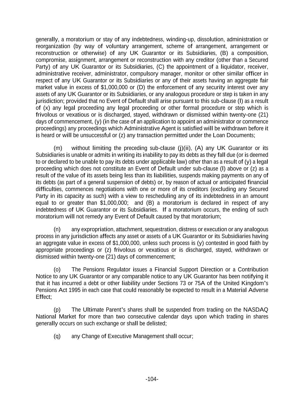 -104- generally, a moratorium or stay of any indebtedness, winding-up, dissolution, administration or reorganization (by way of voluntary arrangement, scheme of arrangement, arrangement or reconstruction or otherwise) of any UK Guarantor or its Subsidiaries, (B) a composition, compromise, assignment, arrangement or reconstruction with any creditor (other than a Secured Party) of any UK Guarantor or its Subsidiaries, (C) the appointment of a liquidator, receiver, administrative receiver, administrator, compulsory manager, monitor or other similar officer in respect of any UK Guarantor or its Subsidiaries or any of their assets having an aggregate fair market value in excess of $1,000,000 or (D) the enforcement of any security interest over any assets of any UK Guarantor or its Subsidiaries, or any analogous procedure or step is taken in any jurisdiction; provided that no Event of Default shall arise pursuant to this sub-clause (l) as a result of (x) any legal proceeding any legal proceeding or other formal procedure or step which is frivolous or vexatious or is discharged, stayed, withdrawn or dismissed within twenty-one (21) days of commencement, (y) (in the case of an application to appoint an administrator or commence proceedings) any proceedings which Administrative Agent is satisfied will be withdrawn before it is heard or will be unsuccessful or (z) any transaction permitted under the Loan Documents; (m) without limiting the preceding sub-clause (j)(ii), (A) any UK Guarantor or its Subsidiaries is unable or admits in writing its inability to pay its debts as they fall due (or is deemed to or declared to be unable to pay its debts under applicable law) other than as a result of (y) a legal proceeding which does not constitute an Event of Default under sub-clause (l) above or (z) as a result of the value of its assets being less than its liabilities, suspends making payments on any of its debts (as part of a general suspension of debts) or, by reason of actual or anticipated financial difficulties, commences negotiations with one or more of its creditors (excluding any Secured Party in its capacity as such) with a view to rescheduling any of its indebtedness in an amount equal to or greater than $1,000,000; and (B) a moratorium is declared in respect of any indebtedness of UK Guarantor or its Subsidiaries. If a moratorium occurs, the ending of such moratorium will not remedy any Event of Default caused by that moratorium; (n) any expropriation, attachment, sequestration, distress or execution or any analogous process in any jurisdiction affects any asset or assets of a UK Guarantor or its Subsidiaries having an aggregate value in excess of $1,000,000, unless such process is (y) contested in good faith by appropriate proceedings or (z) frivolous or vexatious or is discharged, stayed, withdrawn or dismissed within twenty-one (21) days of commencement; (o) The Pensions Regulator issues a Financial Support Direction or a Contribution Notice to any UK Guarantor or any comparable notice to any UK Guarantor has been notifying it that it has incurred a debt or other liability under Sections 73 or 75A of the United Kingdom’s Pensions Act 1995 in each case that could reasonably be expected to result in a Material Adverse Effect; (p) The Ultimate Parent’s shares shall be suspended from trading on the NASDAQ National Market for more than two consecutive calendar days upon which trading in shares generally occurs on such exchange or shall be delisted; (q) any Change of Executive Management shall occur;
