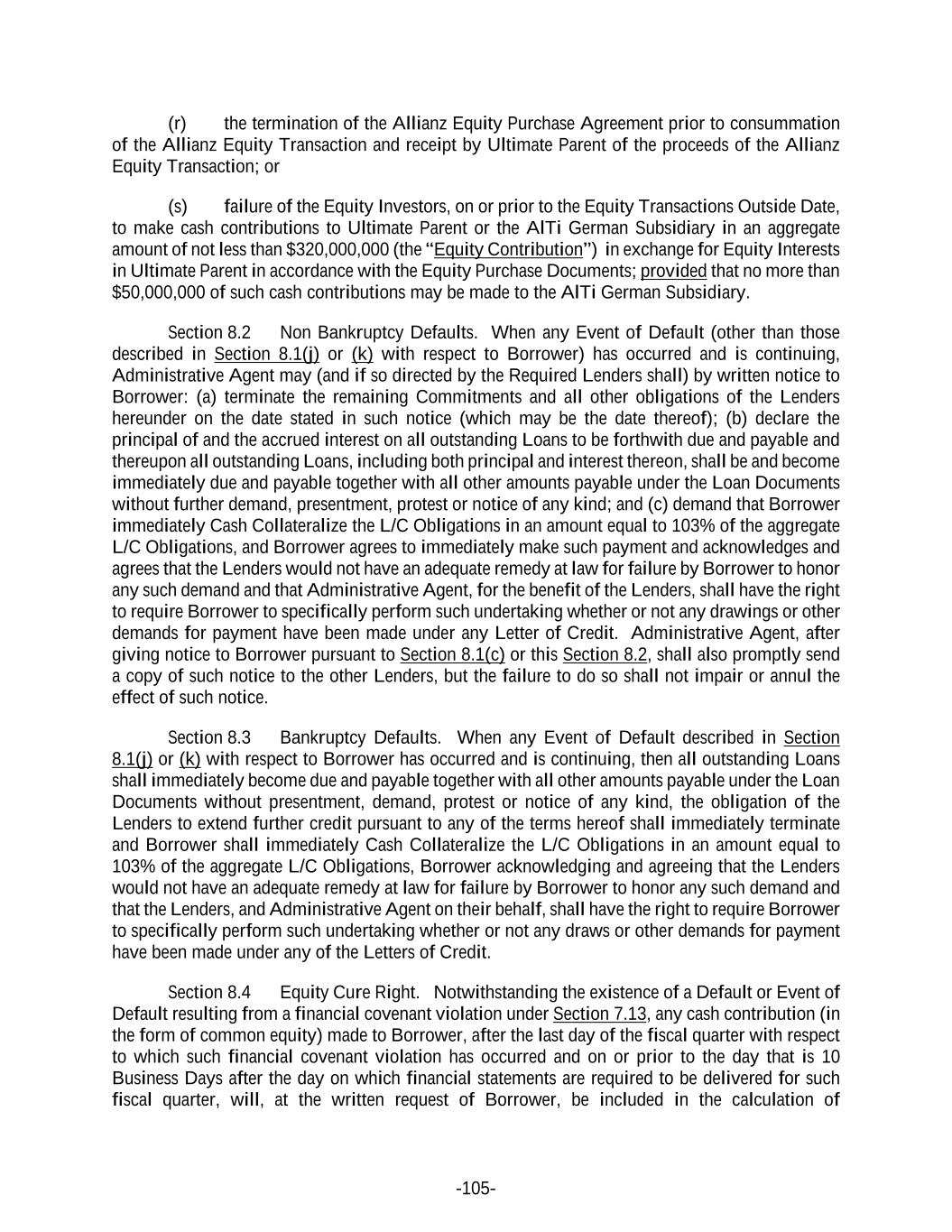 -105- (r) the termination of the Allianz Equity Purchase Agreement prior to consummation of the Allianz Equity Transaction and receipt by Ultimate Parent of the proceeds of the Allianz Equity Transaction; or (s) failure of the Equity Investors, on or prior to the Equity Transactions Outside Date, to make cash contributions to Ultimate Parent or the AlTi German Subsidiary in an aggregate amount of not less than $320,000,000 (the “Equity Contribution”) in exchange for Equity Interests in Ultimate Parent in accordance with the Equity Purchase Documents; provided that no more than $50,000,000 of such cash contributions may be made to the AlTi German Subsidiary. Section 8.2 Non Bankruptcy Defaults. When any Event of Default (other than those described in Section 8.1(j) or (k) with respect to Borrower) has occurred and is continuing, Administrative Agent may (and if so directed by the Required Lenders shall) by written notice to Borrower: (a) terminate the remaining Commitments and all other obligations of the Lenders hereunder on the date stated in such notice (which may be the date thereof); (b) declare the principal of and the accrued interest on all outstanding Loans to be forthwith due and payable and thereupon all outstanding Loans, including both principal and interest thereon, shall be and become immediately due and payable together with all other amounts payable under the Loan Documents without further demand, presentment, protest or notice of any kind; and (c) demand that Borrower immediately Cash Collateralize the L/C Obligations in an amount equal to 103% of the aggregate L/C Obligations, and Borrower agrees to immediately make such payment and acknowledges and agrees that the Lenders would not have an adequate remedy at law for failure by Borrower to honor any such demand and that Administrative Agent, for the benefit of the Lenders, shall have the right to require Borrower to specifically perform such undertaking whether or not any drawings or other demands for payment have been made under any Letter of Credit. Administrative Agent, after giving notice to Borrower pursuant to Section 8.1(c) or this Section 8.2, shall also promptly send a copy of such notice to the other Lenders, but the failure to do so shall not impair or annul the effect of such notice. Section 8.3 Bankruptcy Defaults. When any Event of Default described in Section 8.1(j) or (k) with respect to Borrower has occurred and is continuing, then all outstanding Loans shall immediately become due and payable together with all other amounts payable under the Loan Documents without presentment, demand, protest or notice of any kind, the obligation of the Lenders to extend further credit pursuant to any of the terms hereof shall immediately terminate and Borrower shall immediately Cash Collateralize the L/C Obligations in an amount equal to 103% of the aggregate L/C Obligations, Borrower acknowledging and agreeing that the Lenders would not have an adequate remedy at law for failure by Borrower to honor any such demand and that the Lenders, and Administrative Agent on their behalf, shall have the right to require Borrower to specifically perform such undertaking whether or not any draws or other demands for payment have been made under any of the Letters of Credit. Section 8.4 Equity Cure Right. Notwithstanding the existence of a Default or Event of Default resulting from a financial covenant violation under Section 7.13, any cash contribution (in the form of common equity) made to Borrower, after the last day of the fiscal quarter with respect to which such financial covenant violation has occurred and on or prior to the day that is 10 Business Days after the day on which financial statements are required to be delivered for such fiscal quarter, will, at the written request of Borrower, be included in the calculation of