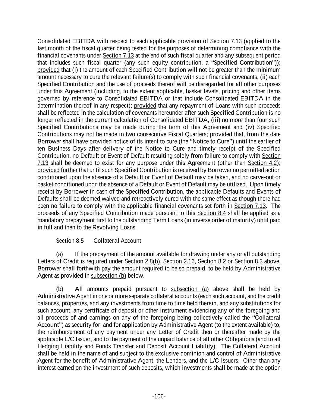 -106- Consolidated EBITDA with respect to each applicable provision of Section 7.13 (applied to the last month of the fiscal quarter being tested for the purposes of determining compliance with the financial covenants under Section 7.13 at the end of such fiscal quarter and any subsequent period that includes such fiscal quarter (any such equity contribution, a “Specified Contribution”)); provided that (i) the amount of each Specified Contribution will not be greater than the minimum amount necessary to cure the relevant failure(s) to comply with such financial covenants, (ii) each Specified Contribution and the use of proceeds thereof will be disregarded for all other purposes under this Agreement (including, to the extent applicable, basket levels, pricing and other items governed by reference to Consolidated EBITDA or that include Consolidated EBITDA in the determination thereof in any respect); provided that any repayment of Loans with such proceeds shall be reflected in the calculation of covenants hereunder after such Specified Contribution is no longer reflected in the current calculation of Consolidated EBITDA, (iii) no more than four such Specified Contributions may be made during the term of this Agreement and (iv) Specified Contributions may not be made in two consecutive Fiscal Quarters; provided that, from the date Borrower shall have provided notice of its intent to cure (the “Notice to Cure”) until the earlier of ten Business Days after delivery of the Notice to Cure and timely receipt of the Specified Contribution, no Default or Event of Default resulting solely from failure to comply with Section 7.13 shall be deemed to exist for any purpose under this Agreement (other than Section 4.2); provided further that until such Specified Contribution is received by Borrower no permitted action conditioned upon the absence of a Default or Event of Default may be taken, and no carve-out or basket conditioned upon the absence of a Default or Event of Default may be utilized. Upon timely receipt by Borrower in cash of the Specified Contribution, the applicable Defaults and Events of Defaults shall be deemed waived and retroactively cured with the same effect as though there had been no failure to comply with the applicable financial covenants set forth in Section 7.13. The proceeds of any Specified Contribution made pursuant to this Section 8.4 shall be applied as a mandatory prepayment first to the outstanding Term Loans (in inverse order of maturity) until paid in full and then to the Revolving Loans. Section 8.5 Collateral Account. (a) If the prepayment of the amount available for drawing under any or all outstanding Letters of Credit is required under Section 2.8(b), Section 2.16, Section 8.2 or Section 8.3 above, Borrower shall forthwith pay the amount required to be so prepaid, to be held by Administrative Agent as provided in subsection (b) below. (b) All amounts prepaid pursuant to subsection (a) above shall be held by Administrative Agent in one or more separate collateral accounts (each such account, and the credit balances, properties, and any investments from time to time held therein, and any substitutions for such account, any certificate of deposit or other instrument evidencing any of the foregoing and all proceeds of and earnings on any of the foregoing being collectively called the “Collateral Account”) as security for, and for application by Administrative Agent (to the extent available) to, the reimbursement of any payment under any Letter of Credit then or thereafter made by the applicable L/C Issuer, and to the payment of the unpaid balance of all other Obligations (and to all Hedging Liability and Funds Transfer and Deposit Account Liability). The Collateral Account shall be held in the name of and subject to the exclusive dominion and control of Administrative Agent for the benefit of Administrative Agent, the Lenders, and the L/C Issuers. Other than any interest earned on the investment of such deposits, which investments shall be made at the option