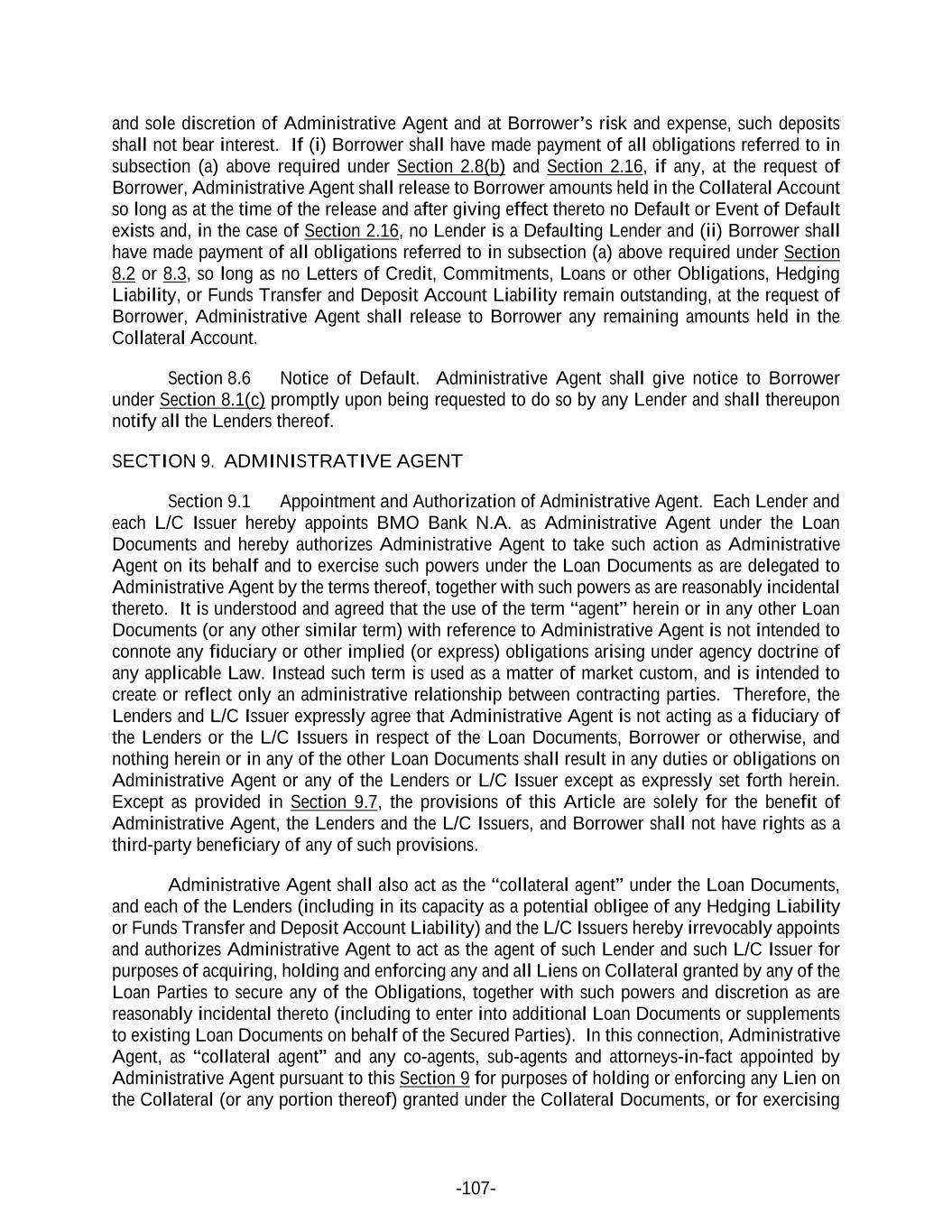 -107- and sole discretion of Administrative Agent and at Borrower’s risk and expense, such deposits shall not bear interest. If (i) Borrower shall have made payment of all obligations referred to in subsection (a) above required under Section 2.8(b) and Section 2.16, if any, at the request of Borrower, Administrative Agent shall release to Borrower amounts held in the Collateral Account so long as at the time of the release and after giving effect thereto no Default or Event of Default exists and, in the case of Section 2.16, no Lender is a Defaulting Lender and (ii) Borrower shall have made payment of all obligations referred to in subsection (a) above required under Section 8.2 or 8.3, so long as no Letters of Credit, Commitments, Loans or other Obligations, Hedging Liability, or Funds Transfer and Deposit Account Liability remain outstanding, at the request of Borrower, Administrative Agent shall release to Borrower any remaining amounts held in the Collateral Account. Section 8.6 Notice of Default. Administrative Agent shall give notice to Borrower under Section 8.1(c) promptly upon being requested to do so by any Lender and shall thereupon notify all the Lenders thereof. SECTION 9. ADMINISTRATIVE AGENT Section 9.1 Appointment and Authorization of Administrative Agent. Each Lender and each L/C Issuer hereby appoints BMO Bank N.A. as Administrative Agent under the Loan Documents and hereby authorizes Administrative Agent to take such action as Administrative Agent on its behalf and to exercise such powers under the Loan Documents as are delegated to Administrative Agent by the terms thereof, together with such powers as are reasonably incidental thereto. It is understood and agreed that the use of the term “agent” herein or in any other Loan Documents (or any other similar term) with reference to Administrative Agent is not intended to connote any fiduciary or other implied (or express) obligations arising under agency doctrine of any applicable Law. Instead such term is used as a matter of market custom, and is intended to create or reflect only an administrative relationship between contracting parties. Therefore, the Lenders and L/C Issuer expressly agree that Administrative Agent is not acting as a fiduciary of the Lenders or the L/C Issuers in respect of the Loan Documents, Borrower or otherwise, and nothing herein or in any of the other Loan Documents shall result in any duties or obligations on Administrative Agent or any of the Lenders or L/C Issuer except as expressly set forth herein. Except as provided in Section 9.7, the provisions of this Article are solely for the benefit of Administrative Agent, the Lenders and the L/C Issuers, and Borrower shall not have rights as a third-party beneficiary of any of such provisions. Administrative Agent shall also act as the “collateral agent” under the Loan Documents, and each of the Lenders (including in its capacity as a potential obligee of any Hedging Liability or Funds Transfer and Deposit Account Liability) and the L/C Issuers hereby irrevocably appoints and authorizes Administrative Agent to act as the agent of such Lender and such L/C Issuer for purposes of acquiring, holding and enforcing any and all Liens on Collateral granted by any of the Loan Parties to secure any of the Obligations, together with such powers and discretion as are reasonably incidental thereto (including to enter into additional Loan Documents or supplements to existing Loan Documents on behalf of the Secured Parties). In this connection, Administrative Agent, as “collateral agent” and any co-agents, sub-agents and attorneys-in-fact appointed by Administrative Agent pursuant to this Section 9 for purposes of holding or enforcing any Lien on the Collateral (or any portion thereof) granted under the Collateral Documents, or for exercising