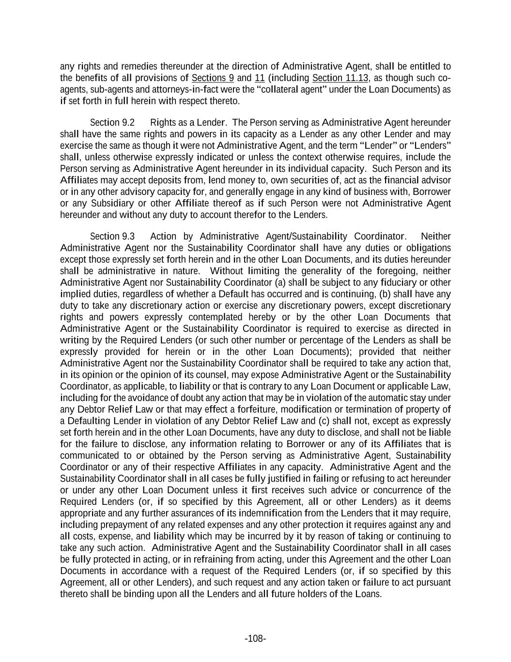 -108- any rights and remedies thereunder at the direction of Administrative Agent, shall be entitled to the benefits of all provisions of Sections 9 and 11 (including Section 11.13, as though such co- agents, sub-agents and attorneys-in-fact were the “collateral agent” under the Loan Documents) as if set forth in full herein with respect thereto. Section 9.2 Rights as a Lender. The Person serving as Administrative Agent hereunder shall have the same rights and powers in its capacity as a Lender as any other Lender and may exercise the same as though it were not Administrative Agent, and the term “Lender” or “Lenders” shall, unless otherwise expressly indicated or unless the context otherwise requires, include the Person serving as Administrative Agent hereunder in its individual capacity. Such Person and its Affiliates may accept deposits from, lend money to, own securities of, act as the financial advisor or in any other advisory capacity for, and generally engage in any kind of business with, Borrower or any Subsidiary or other Affiliate thereof as if such Person were not Administrative Agent hereunder and without any duty to account therefor to the Lenders. Section 9.3 Action by Administrative Agent/Sustainability Coordinator. Neither Administrative Agent nor the Sustainability Coordinator shall have any duties or obligations except those expressly set forth herein and in the other Loan Documents, and its duties hereunder shall be administrative in nature. Without limiting the generality of the foregoing, neither Administrative Agent nor Sustainability Coordinator (a) shall be subject to any fiduciary or other implied duties, regardless of whether a Default has occurred and is continuing, (b) shall have any duty to take any discretionary action or exercise any discretionary powers, except discretionary rights and powers expressly contemplated hereby or by the other Loan Documents that Administrative Agent or the Sustainability Coordinator is required to exercise as directed in writing by the Required Lenders (or such other number or percentage of the Lenders as shall be expressly provided for herein or in the other Loan Documents); provided that neither Administrative Agent nor the Sustainability Coordinator shall be required to take any action that, in its opinion or the opinion of its counsel, may expose Administrative Agent or the Sustainability Coordinator, as applicable, to liability or that is contrary to any Loan Document or applicable Law, including for the avoidance of doubt any action that may be in violation of the automatic stay under any Debtor Relief Law or that may effect a forfeiture, modification or termination of property of a Defaulting Lender in violation of any Debtor Relief Law and (c) shall not, except as expressly set forth herein and in the other Loan Documents, have any duty to disclose, and shall not be liable for the failure to disclose, any information relating to Borrower or any of its Affiliates that is communicated to or obtained by the Person serving as Administrative Agent, Sustainability Coordinator or any of their respective Affiliates in any capacity. Administrative Agent and the Sustainability Coordinator shall in all cases be fully justified in failing or refusing to act hereunder or under any other Loan Document unless it first receives such advice or concurrence of the Required Lenders (or, if so specified by this Agreement, all or other Lenders) as it deems appropriate and any further assurances of its indemnification from the Lenders that it may require, including prepayment of any related expenses and any other protection it requires against any and all costs, expense, and liability which may be incurred by it by reason of taking or continuing to take any such action. Administrative Agent and the Sustainability Coordinator shall in all cases be fully protected in acting, or in refraining from acting, under this Agreement and the other Loan Documents in accordance with a request of the Required Lenders (or, if so specified by this Agreement, all or other Lenders), and such request and any action taken or failure to act pursuant thereto shall be binding upon all the Lenders and all future holders of the Loans.