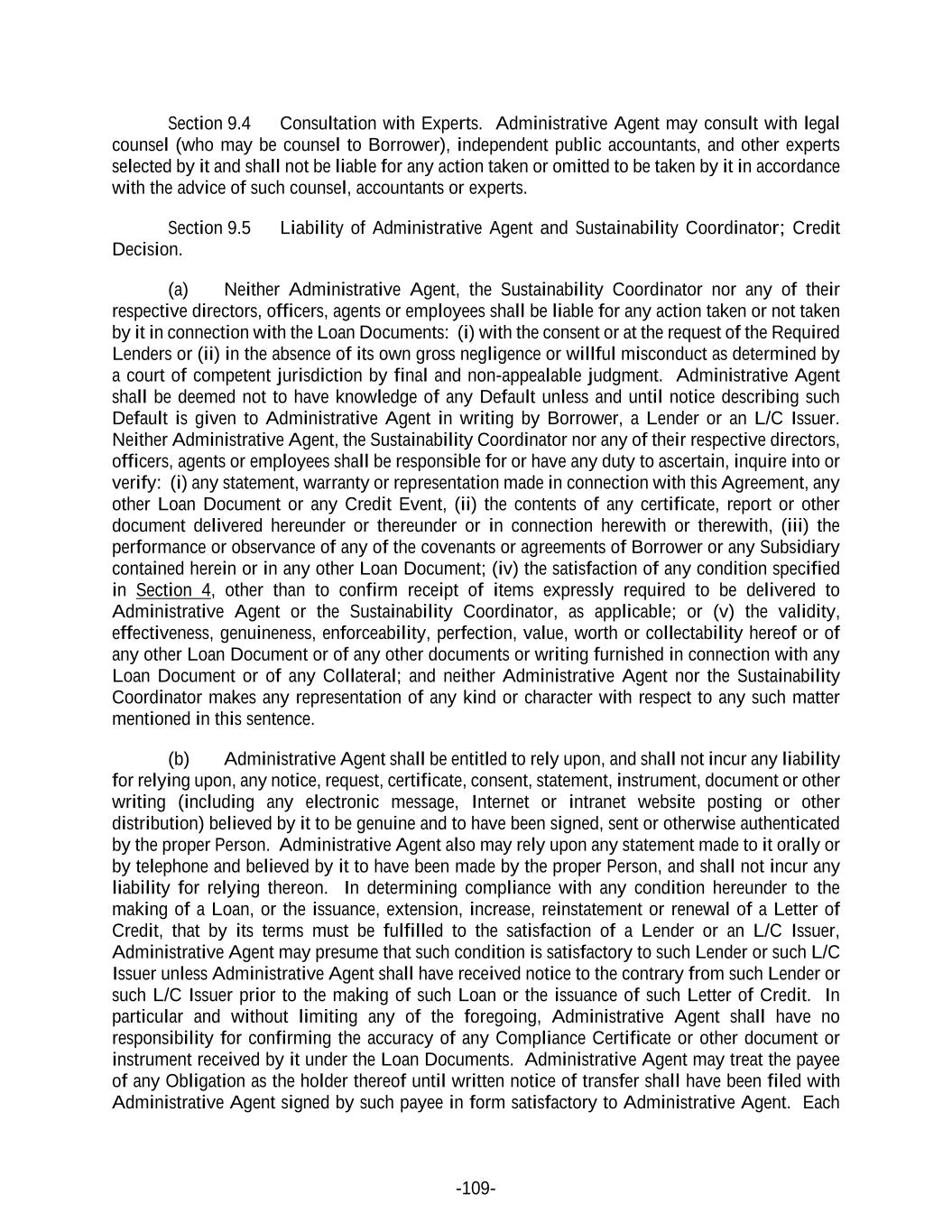-109- Section 9.4 Consultation with Experts. Administrative Agent may consult with legal counsel (who may be counsel to Borrower), independent public accountants, and other experts selected by it and shall not be liable for any action taken or omitted to be taken by it in accordance with the advice of such counsel, accountants or experts. Section 9.5 Liability of Administrative Agent and Sustainability Coordinator; Credit Decision. (a) Neither Administrative Agent, the Sustainability Coordinator nor any of their respective directors, officers, agents or employees shall be liable for any action taken or not taken by it in connection with the Loan Documents: (i) with the consent or at the request of the Required Lenders or (ii) in the absence of its own gross negligence or willful misconduct as determined by a court of competent jurisdiction by final and non-appealable judgment. Administrative Agent shall be deemed not to have knowledge of any Default unless and until notice describing such Default is given to Administrative Agent in writing by Borrower, a Lender or an L/C Issuer. Neither Administrative Agent, the Sustainability Coordinator nor any of their respective directors, officers, agents or employees shall be responsible for or have any duty to ascertain, inquire into or verify: (i) any statement, warranty or representation made in connection with this Agreement, any other Loan Document or any Credit Event, (ii) the contents of any certificate, report or other document delivered hereunder or thereunder or in connection herewith or therewith, (iii) the performance or observance of any of the covenants or agreements of Borrower or any Subsidiary contained herein or in any other Loan Document; (iv) the satisfaction of any condition specified in Section 4, other than to confirm receipt of items expressly required to be delivered to Administrative Agent or the Sustainability Coordinator, as applicable; or (v) the validity, effectiveness, genuineness, enforceability, perfection, value, worth or collectability hereof or of any other Loan Document or of any other documents or writing furnished in connection with any Loan Document or of any Collateral; and neither Administrative Agent nor the Sustainability Coordinator makes any representation of any kind or character with respect to any such matter mentioned in this sentence. (b) Administrative Agent shall be entitled to rely upon, and shall not incur any liability for relying upon, any notice, request, certificate, consent, statement, instrument, document or other writing (including any electronic message, Internet or intranet website posting or other distribution) believed by it to be genuine and to have been signed, sent or otherwise authenticated by the proper Person. Administrative Agent also may rely upon any statement made to it orally or by telephone and believed by it to have been made by the proper Person, and shall not incur any liability for relying thereon. In determining compliance with any condition hereunder to the making of a Loan, or the issuance, extension, increase, reinstatement or renewal of a Letter of Credit, that by its terms must be fulfilled to the satisfaction of a Lender or an L/C Issuer, Administrative Agent may presume that such condition is satisfactory to such Lender or such L/C Issuer unless Administrative Agent shall have received notice to the contrary from such Lender or such L/C Issuer prior to the making of such Loan or the issuance of such Letter of Credit. In particular and without limiting any of the foregoing, Administrative Agent shall have no responsibility for confirming the accuracy of any Compliance Certificate or other document or instrument received by it under the Loan Documents. Administrative Agent may treat the payee of any Obligation as the holder thereof until written notice of transfer shall have been filed with Administrative Agent signed by such payee in form satisfactory to Administrative Agent. Each