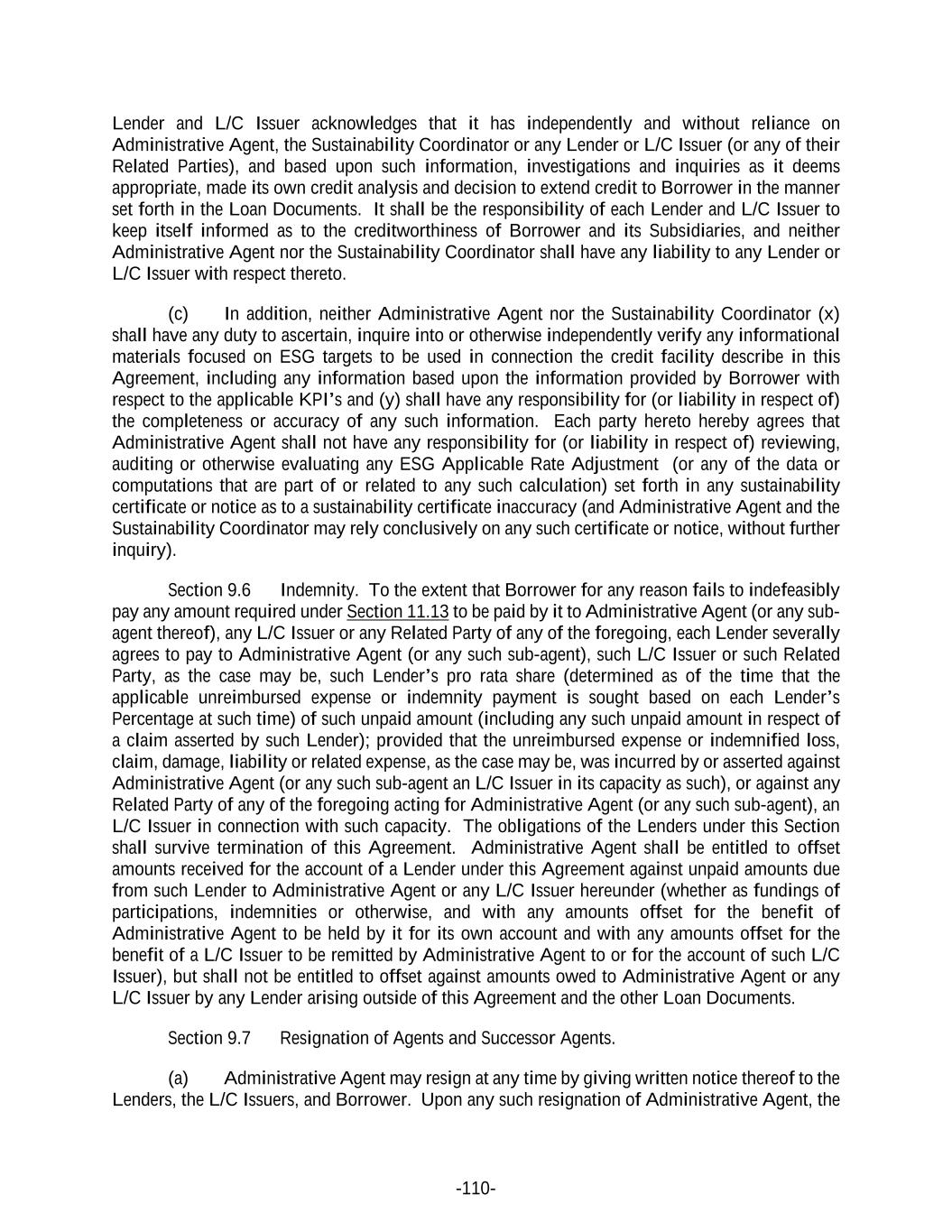 -110- Lender and L/C Issuer acknowledges that it has independently and without reliance on Administrative Agent, the Sustainability Coordinator or any Lender or L/C Issuer (or any of their Related Parties), and based upon such information, investigations and inquiries as it deems appropriate, made its own credit analysis and decision to extend credit to Borrower in the manner set forth in the Loan Documents. It shall be the responsibility of each Lender and L/C Issuer to keep itself informed as to the creditworthiness of Borrower and its Subsidiaries, and neither Administrative Agent nor the Sustainability Coordinator shall have any liability to any Lender or L/C Issuer with respect thereto. (c) In addition, neither Administrative Agent nor the Sustainability Coordinator (x) shall have any duty to ascertain, inquire into or otherwise independently verify any informational materials focused on ESG targets to be used in connection the credit facility describe in this Agreement, including any information based upon the information provided by Borrower with respect to the applicable KPI’s and (y) shall have any responsibility for (or liability in respect of) the completeness or accuracy of any such information. Each party hereto hereby agrees that Administrative Agent shall not have any responsibility for (or liability in respect of) reviewing, auditing or otherwise evaluating any ESG Applicable Rate Adjustment (or any of the data or computations that are part of or related to any such calculation) set forth in any sustainability certificate or notice as to a sustainability certificate inaccuracy (and Administrative Agent and the Sustainability Coordinator may rely conclusively on any such certificate or notice, without further inquiry). Section 9.6 Indemnity. To the extent that Borrower for any reason fails to indefeasibly pay any amount required under Section 11.13 to be paid by it to Administrative Agent (or any sub- agent thereof), any L/C Issuer or any Related Party of any of the foregoing, each Lender severally agrees to pay to Administrative Agent (or any such sub-agent), such L/C Issuer or such Related Party, as the case may be, such Lender’s pro rata share (determined as of the time that the applicable unreimbursed expense or indemnity payment is sought based on each Lender’s Percentage at such time) of such unpaid amount (including any such unpaid amount in respect of a claim asserted by such Lender); provided that the unreimbursed expense or indemnified loss, claim, damage, liability or related expense, as the case may be, was incurred by or asserted against Administrative Agent (or any such sub-agent an L/C Issuer in its capacity as such), or against any Related Party of any of the foregoing acting for Administrative Agent (or any such sub-agent), an L/C Issuer in connection with such capacity. The obligations of the Lenders under this Section shall survive termination of this Agreement. Administrative Agent shall be entitled to offset amounts received for the account of a Lender under this Agreement against unpaid amounts due from such Lender to Administrative Agent or any L/C Issuer hereunder (whether as fundings of participations, indemnities or otherwise, and with any amounts offset for the benefit of Administrative Agent to be held by it for its own account and with any amounts offset for the benefit of a L/C Issuer to be remitted by Administrative Agent to or for the account of such L/C Issuer), but shall not be entitled to offset against amounts owed to Administrative Agent or any L/C Issuer by any Lender arising outside of this Agreement and the other Loan Documents. Section 9.7 Resignation of Agents and Successor Agents. (a) Administrative Agent may resign at any time by giving written notice thereof to the Lenders, the L/C Issuers, and Borrower. Upon any such resignation of Administrative Agent, the