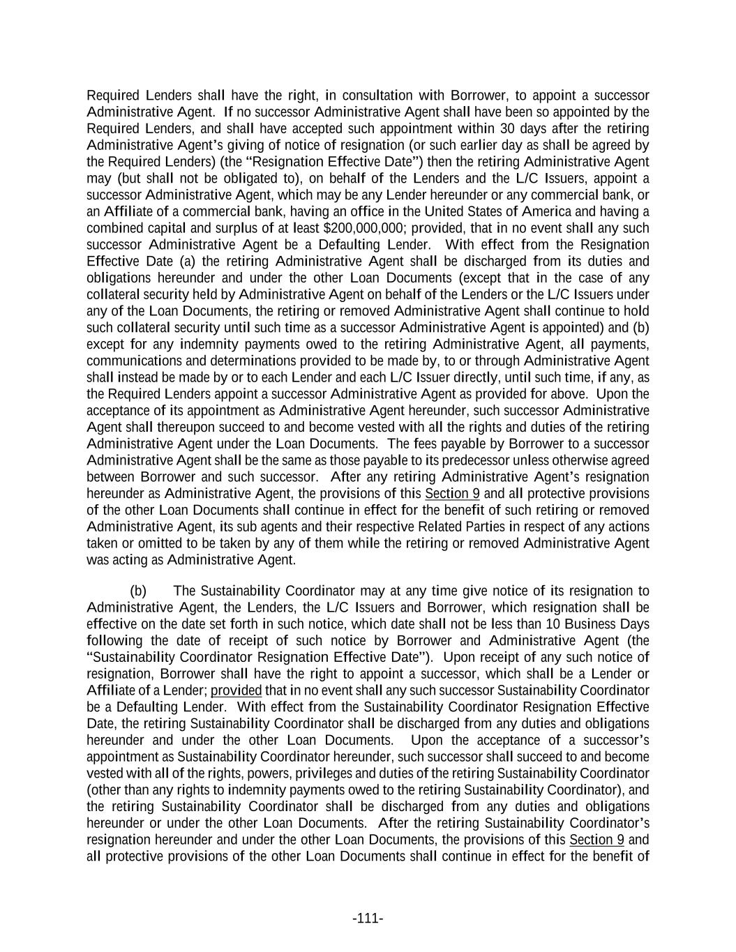 -111- Required Lenders shall have the right, in consultation with Borrower, to appoint a successor Administrative Agent. If no successor Administrative Agent shall have been so appointed by the Required Lenders, and shall have accepted such appointment within 30 days after the retiring Administrative Agent’s giving of notice of resignation (or such earlier day as shall be agreed by the Required Lenders) (the “Resignation Effective Date”) then the retiring Administrative Agent may (but shall not be obligated to), on behalf of the Lenders and the L/C Issuers, appoint a successor Administrative Agent, which may be any Lender hereunder or any commercial bank, or an Affiliate of a commercial bank, having an office in the United States of America and having a combined capital and surplus of at least $200,000,000; provided, that in no event shall any such successor Administrative Agent be a Defaulting Lender. With effect from the Resignation Effective Date (a) the retiring Administrative Agent shall be discharged from its duties and obligations hereunder and under the other Loan Documents (except that in the case of any collateral security held by Administrative Agent on behalf of the Lenders or the L/C Issuers under any of the Loan Documents, the retiring or removed Administrative Agent shall continue to hold such collateral security until such time as a successor Administrative Agent is appointed) and (b) except for any indemnity payments owed to the retiring Administrative Agent, all payments, communications and determinations provided to be made by, to or through Administrative Agent shall instead be made by or to each Lender and each L/C Issuer directly, until such time, if any, as the Required Lenders appoint a successor Administrative Agent as provided for above. Upon the acceptance of its appointment as Administrative Agent hereunder, such successor Administrative Agent shall thereupon succeed to and become vested with all the rights and duties of the retiring Administrative Agent under the Loan Documents. The fees payable by Borrower to a successor Administrative Agent shall be the same as those payable to its predecessor unless otherwise agreed between Borrower and such successor. After any retiring Administrative Agent’s resignation hereunder as Administrative Agent, the provisions of this Section 9 and all protective provisions of the other Loan Documents shall continue in effect for the benefit of such retiring or removed Administrative Agent, its sub agents and their respective Related Parties in respect of any actions taken or omitted to be taken by any of them while the retiring or removed Administrative Agent was acting as Administrative Agent. (b) The Sustainability Coordinator may at any time give notice of its resignation to Administrative Agent, the Lenders, the L/C Issuers and Borrower, which resignation shall be effective on the date set forth in such notice, which date shall not be less than 10 Business Days following the date of receipt of such notice by Borrower and Administrative Agent (the “Sustainability Coordinator Resignation Effective Date”). Upon receipt of any such notice of resignation, Borrower shall have the right to appoint a successor, which shall be a Lender or Affiliate of a Lender; provided that in no event shall any such successor Sustainability Coordinator be a Defaulting Lender. With effect from the Sustainability Coordinator Resignation Effective Date, the retiring Sustainability Coordinator shall be discharged from any duties and obligations hereunder and under the other Loan Documents. Upon the acceptance of a successor’s appointment as Sustainability Coordinator hereunder, such successor shall succeed to and become vested with all of the rights, powers, privileges and duties of the retiring Sustainability Coordinator (other than any rights to indemnity payments owed to the retiring Sustainability Coordinator), and the retiring Sustainability Coordinator shall be discharged from any duties and obligations hereunder or under the other Loan Documents. After the retiring Sustainability Coordinator’s resignation hereunder and under the other Loan Documents, the provisions of this Section 9 and all protective provisions of the other Loan Documents shall continue in effect for the benefit of