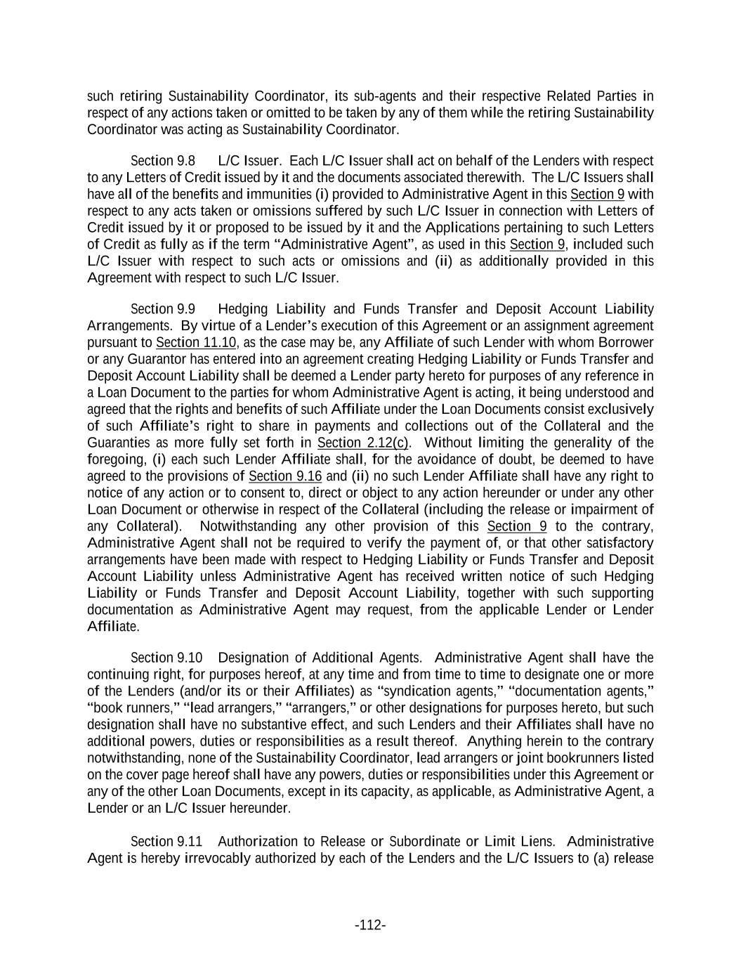 -112- such retiring Sustainability Coordinator, its sub-agents and their respective Related Parties in respect of any actions taken or omitted to be taken by any of them while the retiring Sustainability Coordinator was acting as Sustainability Coordinator. Section 9.8 L/C Issuer. Each L/C Issuer shall act on behalf of the Lenders with respect to any Letters of Credit issued by it and the documents associated therewith. The L/C Issuers shall have all of the benefits and immunities (i) provided to Administrative Agent in this Section 9 with respect to any acts taken or omissions suffered by such L/C Issuer in connection with Letters of Credit issued by it or proposed to be issued by it and the Applications pertaining to such Letters of Credit as fully as if the term “Administrative Agent”, as used in this Section 9, included such L/C Issuer with respect to such acts or omissions and (ii) as additionally provided in this Agreement with respect to such L/C Issuer. Section 9.9 Hedging Liability and Funds Transfer and Deposit Account Liability Arrangements. By virtue of a Lender’s execution of this Agreement or an assignment agreement pursuant to Section 11.10, as the case may be, any Affiliate of such Lender with whom Borrower or any Guarantor has entered into an agreement creating Hedging Liability or Funds Transfer and Deposit Account Liability shall be deemed a Lender party hereto for purposes of any reference in a Loan Document to the parties for whom Administrative Agent is acting, it being understood and agreed that the rights and benefits of such Affiliate under the Loan Documents consist exclusively of such Affiliate’s right to share in payments and collections out of the Collateral and the Guaranties as more fully set forth in Section 2.12(c). Without limiting the generality of the foregoing, (i) each such Lender Affiliate shall, for the avoidance of doubt, be deemed to have agreed to the provisions of Section 9.16 and (ii) no such Lender Affiliate shall have any right to notice of any action or to consent to, direct or object to any action hereunder or under any other Loan Document or otherwise in respect of the Collateral (including the release or impairment of any Collateral). Notwithstanding any other provision of this Section 9 to the contrary, Administrative Agent shall not be required to verify the payment of, or that other satisfactory arrangements have been made with respect to Hedging Liability or Funds Transfer and Deposit Account Liability unless Administrative Agent has received written notice of such Hedging Liability or Funds Transfer and Deposit Account Liability, together with such supporting documentation as Administrative Agent may request, from the applicable Lender or Lender Affiliate. Section 9.10 Designation of Additional Agents. Administrative Agent shall have the continuing right, for purposes hereof, at any time and from time to time to designate one or more of the Lenders (and/or its or their Affiliates) as “syndication agents,” “documentation agents,” “book runners,” “lead arrangers,” “arrangers,” or other designations for purposes hereto, but such designation shall have no substantive effect, and such Lenders and their Affiliates shall have no additional powers, duties or responsibilities as a result thereof. Anything herein to the contrary notwithstanding, none of the Sustainability Coordinator, lead arrangers or joint bookrunners listed on the cover page hereof shall have any powers, duties or responsibilities under this Agreement or any of the other Loan Documents, except in its capacity, as applicable, as Administrative Agent, a Lender or an L/C Issuer hereunder. Section 9.11 Authorization to Release or Subordinate or Limit Liens. Administrative Agent is hereby irrevocably authorized by each of the Lenders and the L/C Issuers to (a) release