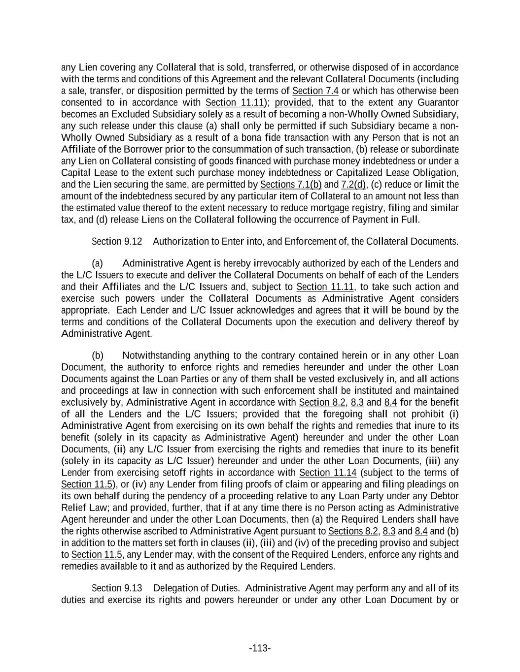 -113- any Lien covering any Collateral that is sold, transferred, or otherwise disposed of in accordance with the terms and conditions of this Agreement and the relevant Collateral Documents (including a sale, transfer, or disposition permitted by the terms of Section 7.4 or which has otherwise been consented to in accordance with Section 11.11); provided, that to the extent any Guarantor becomes an Excluded Subsidiary solely as a result of becoming a non-Wholly Owned Subsidiary, any such release under this clause (a) shall only be permitted if such Subsidiary became a non- Wholly Owned Subsidiary as a result of a bona fide transaction with any Person that is not an Affiliate of the Borrower prior to the consummation of such transaction, (b) release or subordinate any Lien on Collateral consisting of goods financed with purchase money indebtedness or under a Capital Lease to the extent such purchase money indebtedness or Capitalized Lease Obligation, and the Lien securing the same, are permitted by Sections 7.1(b) and 7.2(d), (c) reduce or limit the amount of the indebtedness secured by any particular item of Collateral to an amount not less than the estimated value thereof to the extent necessary to reduce mortgage registry, filing and similar tax, and (d) release Liens on the Collateral following the occurrence of Payment in Full. Section 9.12 Authorization to Enter into, and Enforcement of, the Collateral Documents. (a) Administrative Agent is hereby irrevocably authorized by each of the Lenders and the L/C Issuers to execute and deliver the Collateral Documents on behalf of each of the Lenders and their Affiliates and the L/C Issuers and, subject to Section 11.11, to take such action and exercise such powers under the Collateral Documents as Administrative Agent considers appropriate. Each Lender and L/C Issuer acknowledges and agrees that it will be bound by the terms and conditions of the Collateral Documents upon the execution and delivery thereof by Administrative Agent. (b) Notwithstanding anything to the contrary contained herein or in any other Loan Document, the authority to enforce rights and remedies hereunder and under the other Loan Documents against the Loan Parties or any of them shall be vested exclusively in, and all actions and proceedings at law in connection with such enforcement shall be instituted and maintained exclusively by, Administrative Agent in accordance with Section 8.2, 8.3 and 8.4 for the benefit of all the Lenders and the L/C Issuers; provided that the foregoing shall not prohibit (i) Administrative Agent from exercising on its own behalf the rights and remedies that inure to its benefit (solely in its capacity as Administrative Agent) hereunder and under the other Loan Documents, (ii) any L/C Issuer from exercising the rights and remedies that inure to its benefit (solely in its capacity as L/C Issuer) hereunder and under the other Loan Documents, (iii) any Lender from exercising setoff rights in accordance with Section 11.14 (subject to the terms of Section 11.5), or (iv) any Lender from filing proofs of claim or appearing and filing pleadings on its own behalf during the pendency of a proceeding relative to any Loan Party under any Debtor Relief Law; and provided, further, that if at any time there is no Person acting as Administrative Agent hereunder and under the other Loan Documents, then (a) the Required Lenders shall have the rights otherwise ascribed to Administrative Agent pursuant to Sections 8.2, 8.3 and 8.4 and (b) in addition to the matters set forth in clauses (ii), (iii) and (iv) of the preceding proviso and subject to Section 11.5, any Lender may, with the consent of the Required Lenders, enforce any rights and remedies available to it and as authorized by the Required Lenders. Section 9.13 Delegation of Duties. Administrative Agent may perform any and all of its duties and exercise its rights and powers hereunder or under any other Loan Document by or