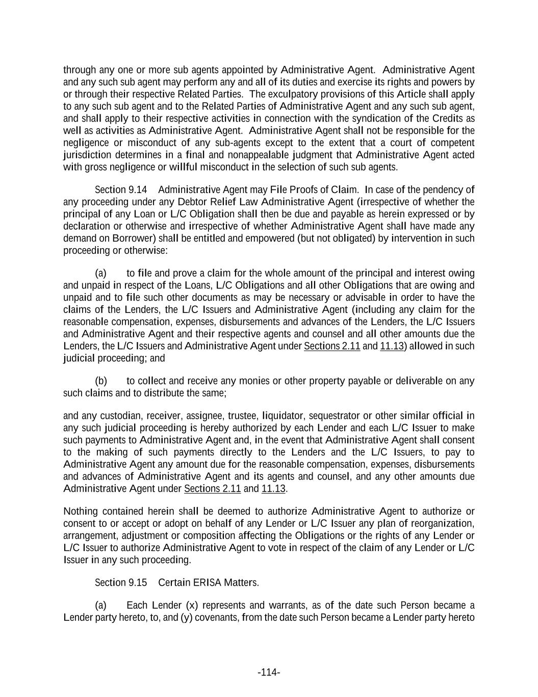 -114- through any one or more sub agents appointed by Administrative Agent. Administrative Agent and any such sub agent may perform any and all of its duties and exercise its rights and powers by or through their respective Related Parties. The exculpatory provisions of this Article shall apply to any such sub agent and to the Related Parties of Administrative Agent and any such sub agent, and shall apply to their respective activities in connection with the syndication of the Credits as well as activities as Administrative Agent. Administrative Agent shall not be responsible for the negligence or misconduct of any sub-agents except to the extent that a court of competent jurisdiction determines in a final and nonappealable judgment that Administrative Agent acted with gross negligence or willful misconduct in the selection of such sub agents. Section 9.14 Administrative Agent may File Proofs of Claim. In case of the pendency of any proceeding under any Debtor Relief Law Administrative Agent (irrespective of whether the principal of any Loan or L/C Obligation shall then be due and payable as herein expressed or by declaration or otherwise and irrespective of whether Administrative Agent shall have made any demand on Borrower) shall be entitled and empowered (but not obligated) by intervention in such proceeding or otherwise: (a) to file and prove a claim for the whole amount of the principal and interest owing and unpaid in respect of the Loans, L/C Obligations and all other Obligations that are owing and unpaid and to file such other documents as may be necessary or advisable in order to have the claims of the Lenders, the L/C Issuers and Administrative Agent (including any claim for the reasonable compensation, expenses, disbursements and advances of the Lenders, the L/C Issuers and Administrative Agent and their respective agents and counsel and all other amounts due the Lenders, the L/C Issuers and Administrative Agent under Sections 2.11 and 11.13) allowed in such judicial proceeding; and (b) to collect and receive any monies or other property payable or deliverable on any such claims and to distribute the same; and any custodian, receiver, assignee, trustee, liquidator, sequestrator or other similar official in any such judicial proceeding is hereby authorized by each Lender and each L/C Issuer to make such payments to Administrative Agent and, in the event that Administrative Agent shall consent to the making of such payments directly to the Lenders and the L/C Issuers, to pay to Administrative Agent any amount due for the reasonable compensation, expenses, disbursements and advances of Administrative Agent and its agents and counsel, and any other amounts due Administrative Agent under Sections 2.11 and 11.13. Nothing contained herein shall be deemed to authorize Administrative Agent to authorize or consent to or accept or adopt on behalf of any Lender or L/C Issuer any plan of reorganization, arrangement, adjustment or composition affecting the Obligations or the rights of any Lender or L/C Issuer to authorize Administrative Agent to vote in respect of the claim of any Lender or L/C Issuer in any such proceeding. Section 9.15 Certain ERISA Matters. (a) Each Lender (x) represents and warrants, as of the date such Person became a Lender party hereto, to, and (y) covenants, from the date such Person became a Lender party hereto