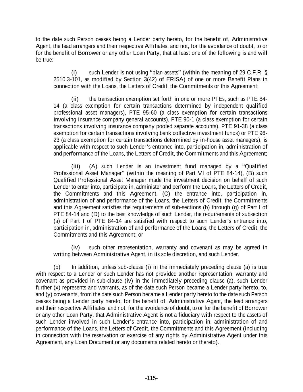 -115- to the date such Person ceases being a Lender party hereto, for the benefit of, Administrative Agent, the lead arrangers and their respective Affiliates, and not, for the avoidance of doubt, to or for the benefit of Borrower or any other Loan Party, that at least one of the following is and will be true: (i) such Lender is not using “plan assets” (within the meaning of 29 C.F.R. § 2510.3-101, as modified by Section 3(42) of ERISA) of one or more Benefit Plans in connection with the Loans, the Letters of Credit, the Commitments or this Agreement; (ii) the transaction exemption set forth in one or more PTEs, such as PTE 84- 14 (a class exemption for certain transactions determined by independent qualified professional asset managers), PTE 95-60 (a class exemption for certain transactions involving insurance company general accounts), PTE 90-1 (a class exemption for certain transactions involving insurance company pooled separate accounts), PTE 91-38 (a class exemption for certain transactions involving bank collective investment funds) or PTE 96- 23 (a class exemption for certain transactions determined by in-house asset managers), is applicable with respect to such Lender’s entrance into, participation in, administration of and performance of the Loans, the Letters of Credit, the Commitments and this Agreement; (iii) (A) such Lender is an investment fund managed by a “Qualified Professional Asset Manager” (within the meaning of Part VI of PTE 84-14), (B) such Qualified Professional Asset Manager made the investment decision on behalf of such Lender to enter into, participate in, administer and perform the Loans, the Letters of Credit, the Commitments and this Agreement, (C) the entrance into, participation in, administration of and performance of the Loans, the Letters of Credit, the Commitments and this Agreement satisfies the requirements of sub-sections (b) through (g) of Part I of PTE 84-14 and (D) to the best knowledge of such Lender, the requirements of subsection (a) of Part I of PTE 84-14 are satisfied with respect to such Lender’s entrance into, participation in, administration of and performance of the Loans, the Letters of Credit, the Commitments and this Agreement; or (iv) such other representation, warranty and covenant as may be agreed in writing between Administrative Agent, in its sole discretion, and such Lender. (b) In addition, unless sub-clause (i) in the immediately preceding clause (a) is true with respect to a Lender or such Lender has not provided another representation, warranty and covenant as provided in sub-clause (iv) in the immediately preceding clause (a), such Lender further (x) represents and warrants, as of the date such Person became a Lender party hereto, to, and (y) covenants, from the date such Person became a Lender party hereto to the date such Person ceases being a Lender party hereto, for the benefit of, Administrative Agent, the lead arrangers and their respective Affiliates, and not, for the avoidance of doubt, to or for the benefit of Borrower or any other Loan Party, that Administrative Agent is not a fiduciary with respect to the assets of such Lender involved in such Lender’s entrance into, participation in, administration of and performance of the Loans, the Letters of Credit, the Commitments and this Agreement (including in connection with the reservation or exercise of any rights by Administrative Agent under this Agreement, any Loan Document or any documents related hereto or thereto).