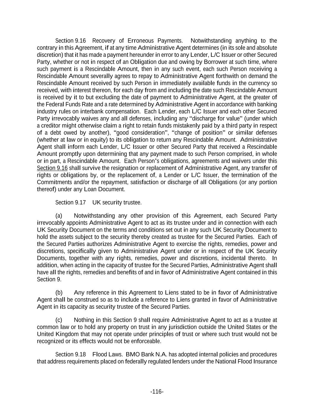-116- Section 9.16 Recovery of Erroneous Payments. Notwithstanding anything to the contrary in this Agreement, if at any time Administrative Agent determines (in its sole and absolute discretion) that it has made a payment hereunder in error to any Lender, L/C Issuer or other Secured Party, whether or not in respect of an Obligation due and owing by Borrower at such time, where such payment is a Rescindable Amount, then in any such event, each such Person receiving a Rescindable Amount severally agrees to repay to Administrative Agent forthwith on demand the Rescindable Amount received by such Person in immediately available funds in the currency so received, with interest thereon, for each day from and including the date such Rescindable Amount is received by it to but excluding the date of payment to Administrative Agent, at the greater of the Federal Funds Rate and a rate determined by Administrative Agent in accordance with banking industry rules on interbank compensation. Each Lender, each L/C Issuer and each other Secured Party irrevocably waives any and all defenses, including any “discharge for value” (under which a creditor might otherwise claim a right to retain funds mistakenly paid by a third party in respect of a debt owed by another), “good consideration”, “change of position” or similar defenses (whether at law or in equity) to its obligation to return any Rescindable Amount. Administrative Agent shall inform each Lender, L/C Issuer or other Secured Party that received a Rescindable Amount promptly upon determining that any payment made to such Person comprised, in whole or in part, a Rescindable Amount. Each Person’s obligations, agreements and waivers under this Section 9.16 shall survive the resignation or replacement of Administrative Agent, any transfer of rights or obligations by, or the replacement of, a Lender or L/C Issuer, the termination of the Commitments and/or the repayment, satisfaction or discharge of all Obligations (or any portion thereof) under any Loan Document. Section 9.17 UK security trustee. (a) Notwithstanding any other provision of this Agreement, each Secured Party irrevocably appoints Administrative Agent to act as its trustee under and in connection with each UK Security Document on the terms and conditions set out in any such UK Security Document to hold the assets subject to the security thereby created as trustee for the Secured Parties. Each of the Secured Parties authorizes Administrative Agent to exercise the rights, remedies, power and discretions, specifically given to Administrative Agent under or in respect of the UK Security Documents, together with any rights, remedies, power and discretions, incidental thereto. In addition, when acting in the capacity of trustee for the Secured Parties, Administrative Agent shall have all the rights, remedies and benefits of and in favor of Administrative Agent contained in this Section 9. (b) Any reference in this Agreement to Liens stated to be in favor of Administrative Agent shall be construed so as to include a reference to Liens granted in favor of Administrative Agent in its capacity as security trustee of the Secured Parties. (c) Nothing in this Section 9 shall require Administrative Agent to act as a trustee at common law or to hold any property on trust in any jurisdiction outside the United States or the United Kingdom that may not operate under principles of trust or where such trust would not be recognized or its effects would not be enforceable. Section 9.18 Flood Laws. BMO Bank N.A. has adopted internal policies and procedures that address requirements placed on federally regulated lenders under the National Flood Insurance