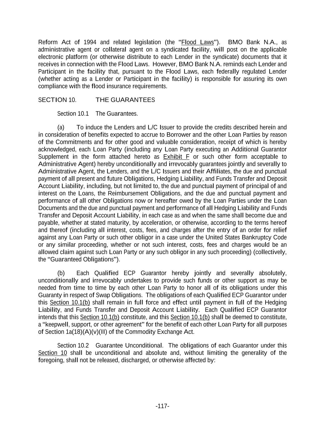 -117- Reform Act of 1994 and related legislation (the “Flood Laws”). BMO Bank N.A., as administrative agent or collateral agent on a syndicated facility, will post on the applicable electronic platform (or otherwise distribute to each Lender in the syndicate) documents that it receives in connection with the Flood Laws. However, BMO Bank N.A. reminds each Lender and Participant in the facility that, pursuant to the Flood Laws, each federally regulated Lender (whether acting as a Lender or Participant in the facility) is responsible for assuring its own compliance with the flood insurance requirements. SECTION 10. THE GUARANTEES Section 10.1 The Guarantees. (a) To induce the Lenders and L/C Issuer to provide the credits described herein and in consideration of benefits expected to accrue to Borrower and the other Loan Parties by reason of the Commitments and for other good and valuable consideration, receipt of which is hereby acknowledged, each Loan Party (including any Loan Party executing an Additional Guarantor Supplement in the form attached hereto as Exhibit F or such other form acceptable to Administrative Agent) hereby unconditionally and irrevocably guarantees jointly and severally to Administrative Agent, the Lenders, and the L/C Issuers and their Affiliates, the due and punctual payment of all present and future Obligations, Hedging Liability, and Funds Transfer and Deposit Account Liability, including, but not limited to, the due and punctual payment of principal of and interest on the Loans, the Reimbursement Obligations, and the due and punctual payment and performance of all other Obligations now or hereafter owed by the Loan Parties under the Loan Documents and the due and punctual payment and performance of all Hedging Liability and Funds Transfer and Deposit Account Liability, in each case as and when the same shall become due and payable, whether at stated maturity, by acceleration, or otherwise, according to the terms hereof and thereof (including all interest, costs, fees, and charges after the entry of an order for relief against any Loan Party or such other obligor in a case under the United States Bankruptcy Code or any similar proceeding, whether or not such interest, costs, fees and charges would be an allowed claim against such Loan Party or any such obligor in any such proceeding) (collectively, the “Guaranteed Obligations”). (b) Each Qualified ECP Guarantor hereby jointly and severally absolutely, unconditionally and irrevocably undertakes to provide such funds or other support as may be needed from time to time by each other Loan Party to honor all of its obligations under this Guaranty in respect of Swap Obligations. The obligations of each Qualified ECP Guarantor under this Section 10.1(b) shall remain in full force and effect until payment in full of the Hedging Liability, and Funds Transfer and Deposit Account Liability. Each Qualified ECP Guarantor intends that this Section 10.1(b) constitute, and this Section 10.1(b) shall be deemed to constitute, a “keepwell, support, or other agreement” for the benefit of each other Loan Party for all purposes of Section 1a(18)(A)(v)(II) of the Commodity Exchange Act. Section 10.2 Guarantee Unconditional. The obligations of each Guarantor under this Section 10 shall be unconditional and absolute and, without limiting the generality of the foregoing, shall not be released, discharged, or otherwise affected by: