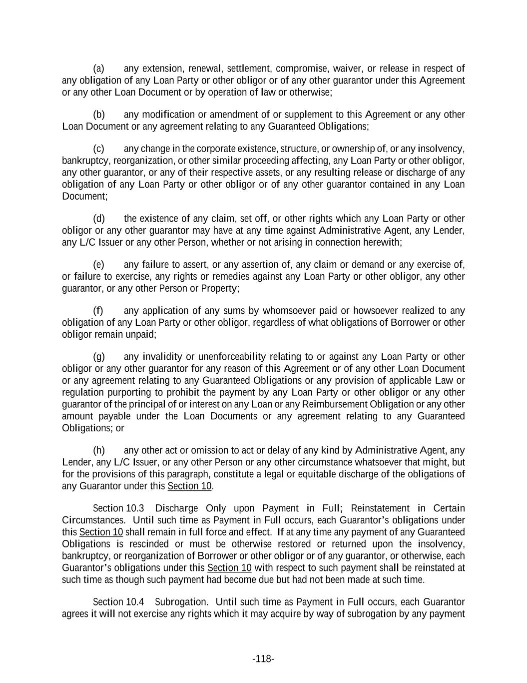 -118- (a) any extension, renewal, settlement, compromise, waiver, or release in respect of any obligation of any Loan Party or other obligor or of any other guarantor under this Agreement or any other Loan Document or by operation of law or otherwise; (b) any modification or amendment of or supplement to this Agreement or any other Loan Document or any agreement relating to any Guaranteed Obligations; (c) any change in the corporate existence, structure, or ownership of, or any insolvency, bankruptcy, reorganization, or other similar proceeding affecting, any Loan Party or other obligor, any other guarantor, or any of their respective assets, or any resulting release or discharge of any obligation of any Loan Party or other obligor or of any other guarantor contained in any Loan Document; (d) the existence of any claim, set off, or other rights which any Loan Party or other obligor or any other guarantor may have at any time against Administrative Agent, any Lender, any L/C Issuer or any other Person, whether or not arising in connection herewith; (e) any failure to assert, or any assertion of, any claim or demand or any exercise of, or failure to exercise, any rights or remedies against any Loan Party or other obligor, any other guarantor, or any other Person or Property; (f) any application of any sums by whomsoever paid or howsoever realized to any obligation of any Loan Party or other obligor, regardless of what obligations of Borrower or other obligor remain unpaid; (g) any invalidity or unenforceability relating to or against any Loan Party or other obligor or any other guarantor for any reason of this Agreement or of any other Loan Document or any agreement relating to any Guaranteed Obligations or any provision of applicable Law or regulation purporting to prohibit the payment by any Loan Party or other obligor or any other guarantor of the principal of or interest on any Loan or any Reimbursement Obligation or any other amount payable under the Loan Documents or any agreement relating to any Guaranteed Obligations; or (h) any other act or omission to act or delay of any kind by Administrative Agent, any Lender, any L/C Issuer, or any other Person or any other circumstance whatsoever that might, but for the provisions of this paragraph, constitute a legal or equitable discharge of the obligations of any Guarantor under this Section 10. Section 10.3 Discharge Only upon Payment in Full; Reinstatement in Certain Circumstances. Until such time as Payment in Full occurs, each Guarantor’s obligations under this Section 10 shall remain in full force and effect. If at any time any payment of any Guaranteed Obligations is rescinded or must be otherwise restored or returned upon the insolvency, bankruptcy, or reorganization of Borrower or other obligor or of any guarantor, or otherwise, each Guarantor’s obligations under this Section 10 with respect to such payment shall be reinstated at such time as though such payment had become due but had not been made at such time. Section 10.4 Subrogation. Until such time as Payment in Full occurs, each Guarantor agrees it will not exercise any rights which it may acquire by way of subrogation by any payment