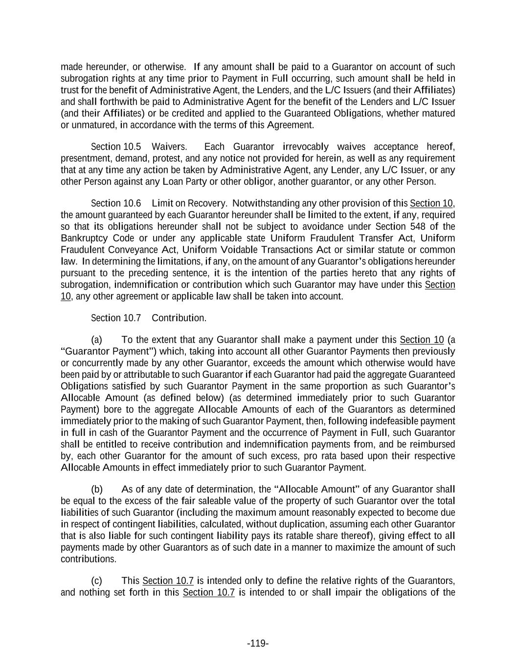 -119- made hereunder, or otherwise. If any amount shall be paid to a Guarantor on account of such subrogation rights at any time prior to Payment in Full occurring, such amount shall be held in trust for the benefit of Administrative Agent, the Lenders, and the L/C Issuers (and their Affiliates) and shall forthwith be paid to Administrative Agent for the benefit of the Lenders and L/C Issuer (and their Affiliates) or be credited and applied to the Guaranteed Obligations, whether matured or unmatured, in accordance with the terms of this Agreement. Section 10.5 Waivers. Each Guarantor irrevocably waives acceptance hereof, presentment, demand, protest, and any notice not provided for herein, as well as any requirement that at any time any action be taken by Administrative Agent, any Lender, any L/C Issuer, or any other Person against any Loan Party or other obligor, another guarantor, or any other Person. Section 10.6 Limit on Recovery. Notwithstanding any other provision of this Section 10, the amount guaranteed by each Guarantor hereunder shall be limited to the extent, if any, required so that its obligations hereunder shall not be subject to avoidance under Section 548 of the Bankruptcy Code or under any applicable state Uniform Fraudulent Transfer Act, Uniform Fraudulent Conveyance Act, Uniform Voidable Transactions Act or similar statute or common law. In determining the limitations, if any, on the amount of any Guarantor’s obligations hereunder pursuant to the preceding sentence, it is the intention of the parties hereto that any rights of subrogation, indemnification or contribution which such Guarantor may have under this Section 10, any other agreement or applicable law shall be taken into account. Section 10.7 Contribution. (a) To the extent that any Guarantor shall make a payment under this Section 10 (a “Guarantor Payment”) which, taking into account all other Guarantor Payments then previously or concurrently made by any other Guarantor, exceeds the amount which otherwise would have been paid by or attributable to such Guarantor if each Guarantor had paid the aggregate Guaranteed Obligations satisfied by such Guarantor Payment in the same proportion as such Guarantor’s Allocable Amount (as defined below) (as determined immediately prior to such Guarantor Payment) bore to the aggregate Allocable Amounts of each of the Guarantors as determined immediately prior to the making of such Guarantor Payment, then, following indefeasible payment in full in cash of the Guarantor Payment and the occurrence of Payment in Full, such Guarantor shall be entitled to receive contribution and indemnification payments from, and be reimbursed by, each other Guarantor for the amount of such excess, pro rata based upon their respective Allocable Amounts in effect immediately prior to such Guarantor Payment. (b) As of any date of determination, the “Allocable Amount” of any Guarantor shall be equal to the excess of the fair saleable value of the property of such Guarantor over the total liabilities of such Guarantor (including the maximum amount reasonably expected to become due in respect of contingent liabilities, calculated, without duplication, assuming each other Guarantor that is also liable for such contingent liability pays its ratable share thereof), giving effect to all payments made by other Guarantors as of such date in a manner to maximize the amount of such contributions. (c) This Section 10.7 is intended only to define the relative rights of the Guarantors, and nothing set forth in this Section 10.7 is intended to or shall impair the obligations of the