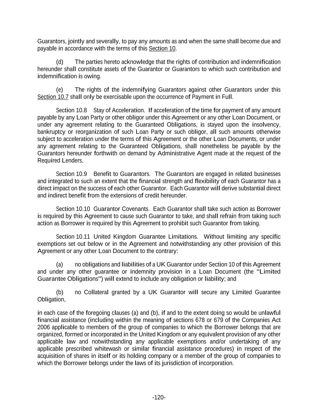 -120- Guarantors, jointly and severally, to pay any amounts as and when the same shall become due and payable in accordance with the terms of this Section 10. (d) The parties hereto acknowledge that the rights of contribution and indemnification hereunder shall constitute assets of the Guarantor or Guarantors to which such contribution and indemnification is owing. (e) The rights of the indemnifying Guarantors against other Guarantors under this Section 10.7 shall only be exercisable upon the occurrence of Payment in Full. Section 10.8 Stay of Acceleration. If acceleration of the time for payment of any amount payable by any Loan Party or other obligor under this Agreement or any other Loan Document, or under any agreement relating to the Guaranteed Obligations, is stayed upon the insolvency, bankruptcy or reorganization of such Loan Party or such obligor, all such amounts otherwise subject to acceleration under the terms of this Agreement or the other Loan Documents, or under any agreement relating to the Guaranteed Obligations, shall nonetheless be payable by the Guarantors hereunder forthwith on demand by Administrative Agent made at the request of the Required Lenders. Section 10.9 Benefit to Guarantors. The Guarantors are engaged in related businesses and integrated to such an extent that the financial strength and flexibility of each Guarantor has a direct impact on the success of each other Guarantor. Each Guarantor will derive substantial direct and indirect benefit from the extensions of credit hereunder. Section 10.10 Guarantor Covenants. Each Guarantor shall take such action as Borrower is required by this Agreement to cause such Guarantor to take, and shall refrain from taking such action as Borrower is required by this Agreement to prohibit such Guarantor from taking. Section 10.11 United Kingdom Guarantee Limitations. Without limiting any specific exemptions set out below or in the Agreement and notwithstanding any other provision of this Agreement or any other Loan Document to the contrary: (a) no obligations and liabilities of a UK Guarantor under Section 10 of this Agreement and under any other guarantee or indemnity provision in a Loan Document (the “Limited Guarantee Obligations”) will extend to include any obligation or liability; and (b) no Collateral granted by a UK Guarantor will secure any Limited Guarantee Obligation, in each case of the foregoing clauses (a) and (b), if and to the extent doing so would be unlawful financial assistance (including within the meaning of sections 678 or 679 of the Companies Act 2006 applicable to members of the group of companies to which the Borrower belongs that are organized, formed or incorporated in the United Kingdom or any equivalent provision of any other applicable law and notwithstanding any applicable exemptions and/or undertaking of any applicable prescribed whitewash or similar financial assistance procedures) in respect of the acquisition of shares in itself or its holding company or a member of the group of companies to which the Borrower belongs under the laws of its jurisdiction of incorporation.