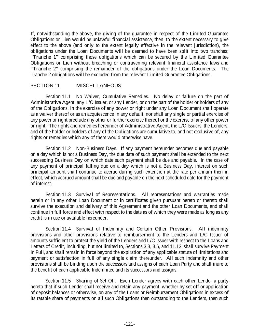 -121- If, notwithstanding the above, the giving of the guarantee in respect of the Limited Guarantee Obligations or Lien would be unlawful financial assistance, then, to the extent necessary to give effect to the above (and only to the extent legally effective in the relevant jurisdiction), the obligations under the Loan Documents will be deemed to have been split into two tranches; “Tranche 1” comprising those obligations which can be secured by the Limited Guarantee Obligations or Lien without breaching or contravening relevant financial assistance laws and “Tranche 2” comprising the remainder of the obligations under the Loan Documents. The Tranche 2 obligations will be excluded from the relevant Limited Guarantee Obligations. SECTION 11. MISCELLANEOUS Section 11.1 No Waiver, Cumulative Remedies. No delay or failure on the part of Administrative Agent, any L/C Issuer, or any Lender, or on the part of the holder or holders of any of the Obligations, in the exercise of any power or right under any Loan Document shall operate as a waiver thereof or as an acquiescence in any default, nor shall any single or partial exercise of any power or right preclude any other or further exercise thereof or the exercise of any other power or right. The rights and remedies hereunder of Administrative Agent, the L/C Issuers, the Lenders, and of the holder or holders of any of the Obligations are cumulative to, and not exclusive of, any rights or remedies which any of them would otherwise have. Section 11.2 Non-Business Days. If any payment hereunder becomes due and payable on a day which is not a Business Day, the due date of such payment shall be extended to the next succeeding Business Day on which date such payment shall be due and payable. In the case of any payment of principal falling due on a day which is not a Business Day, interest on such principal amount shall continue to accrue during such extension at the rate per annum then in effect, which accrued amount shall be due and payable on the next scheduled date for the payment of interest. Section 11.3 Survival of Representations. All representations and warranties made herein or in any other Loan Document or in certificates given pursuant hereto or thereto shall survive the execution and delivery of this Agreement and the other Loan Documents, and shall continue in full force and effect with respect to the date as of which they were made as long as any credit is in use or available hereunder. Section 11.4 Survival of Indemnity and Certain Other Provisions. All indemnity provisions and other provisions relative to reimbursement to the Lenders and L/C Issuer of amounts sufficient to protect the yield of the Lenders and L/C Issuer with respect to the Loans and Letters of Credit, including, but not limited to, Sections 3.3, 3.6, and 11.13, shall survive Payment in Full, and shall remain in force beyond the expiration of any applicable statute of limitations and payment or satisfaction in full of any single claim thereunder. All such indemnity and other provisions shall be binding upon the successors and assigns of each Loan Party and shall inure to the benefit of each applicable Indemnitee and its successors and assigns. Section 11.5 Sharing of Set Off. Each Lender agrees with each other Lender a party hereto that if such Lender shall receive and retain any payment, whether by set off or application of deposit balances or otherwise, on any of the Loans or Reimbursement Obligations in excess of its ratable share of payments on all such Obligations then outstanding to the Lenders, then such