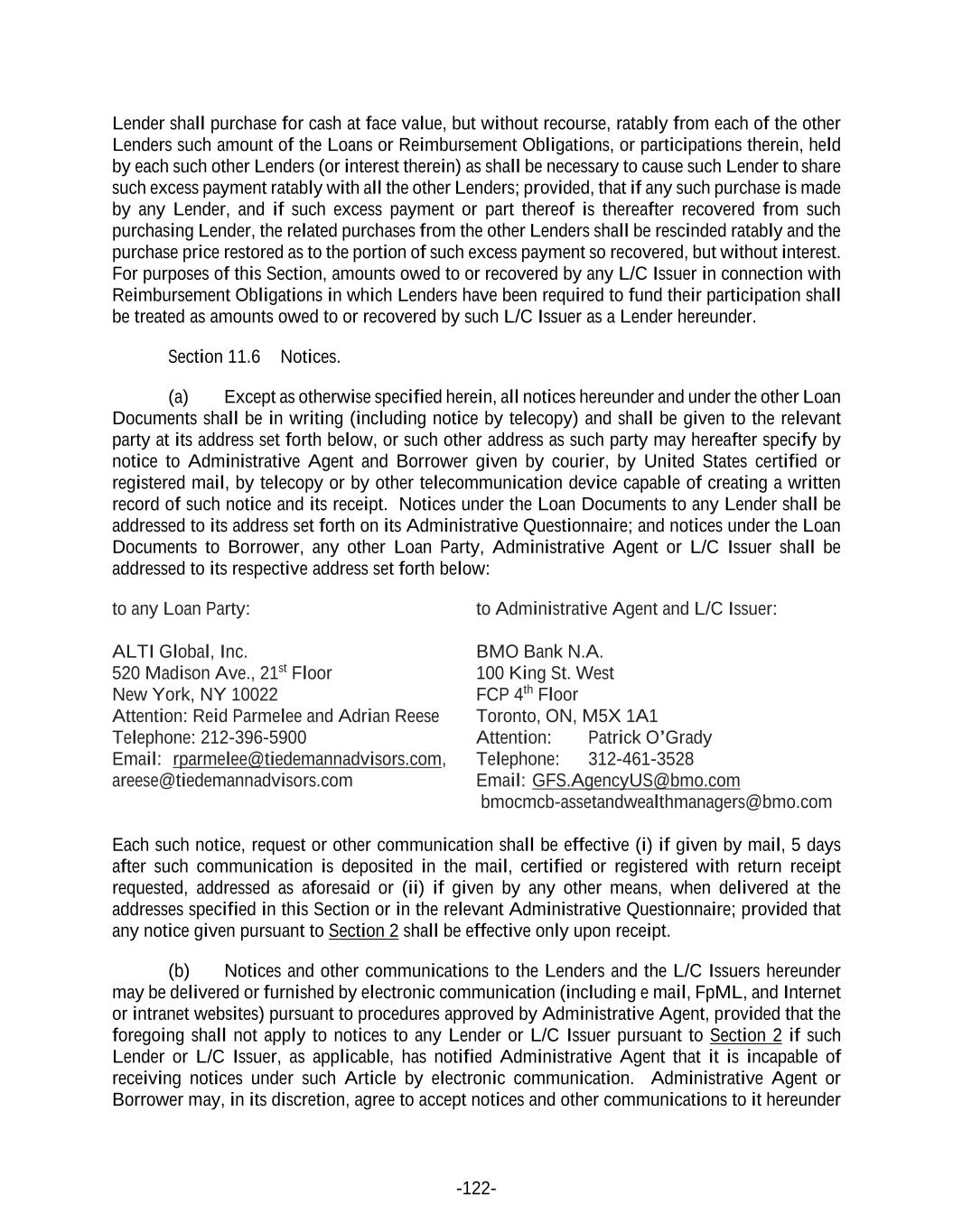 -122- Lender shall purchase for cash at face value, but without recourse, ratably from each of the other Lenders such amount of the Loans or Reimbursement Obligations, or participations therein, held by each such other Lenders (or interest therein) as shall be necessary to cause such Lender to share such excess payment ratably with all the other Lenders; provided, that if any such purchase is made by any Lender, and if such excess payment or part thereof is thereafter recovered from such purchasing Lender, the related purchases from the other Lenders shall be rescinded ratably and the purchase price restored as to the portion of such excess payment so recovered, but without interest. For purposes of this Section, amounts owed to or recovered by any L/C Issuer in connection with Reimbursement Obligations in which Lenders have been required to fund their participation shall be treated as amounts owed to or recovered by such L/C Issuer as a Lender hereunder. Section 11.6 Notices. (a) Except as otherwise specified herein, all notices hereunder and under the other Loan Documents shall be in writing (including notice by telecopy) and shall be given to the relevant party at its address set forth below, or such other address as such party may hereafter specify by notice to Administrative Agent and Borrower given by courier, by United States certified or registered mail, by telecopy or by other telecommunication device capable of creating a written record of such notice and its receipt. Notices under the Loan Documents to any Lender shall be addressed to its address set forth on its Administrative Questionnaire; and notices under the Loan Documents to Borrower, any other Loan Party, Administrative Agent or L/C Issuer shall be addressed to its respective address set forth below: to any Loan Party: ALTI Global, Inc. 520 Madison Ave., 21st Floor New York, NY 10022 Attention: Reid Parmelee and Adrian Reese Telephone: 212-396-5900 Email: rparmelee@tiedemannadvisors.com, areese@tiedemannadvisors.com to Administrative Agent and L/C Issuer: BMO Bank N.A. 100 King St. West FCP 4th Floor Toronto, ON, M5X 1A1 Attention: Patrick O’Grady Telephone: 312-461-3528 Email: GFS.AgencyUS@bmo.com bmocmcb-assetandwealthmanagers@bmo.com Each such notice, request or other communication shall be effective (i) if given by mail, 5 days after such communication is deposited in the mail, certified or registered with return receipt requested, addressed as aforesaid or (ii) if given by any other means, when delivered at the addresses specified in this Section or in the relevant Administrative Questionnaire; provided that any notice given pursuant to Section 2 shall be effective only upon receipt. (b) Notices and other communications to the Lenders and the L/C Issuers hereunder may be delivered or furnished by electronic communication (including e mail, FpML, and Internet or intranet websites) pursuant to procedures approved by Administrative Agent, provided that the foregoing shall not apply to notices to any Lender or L/C Issuer pursuant to Section 2 if such Lender or L/C Issuer, as applicable, has notified Administrative Agent that it is incapable of receiving notices under such Article by electronic communication. Administrative Agent or Borrower may, in its discretion, agree to accept notices and other communications to it hereunder