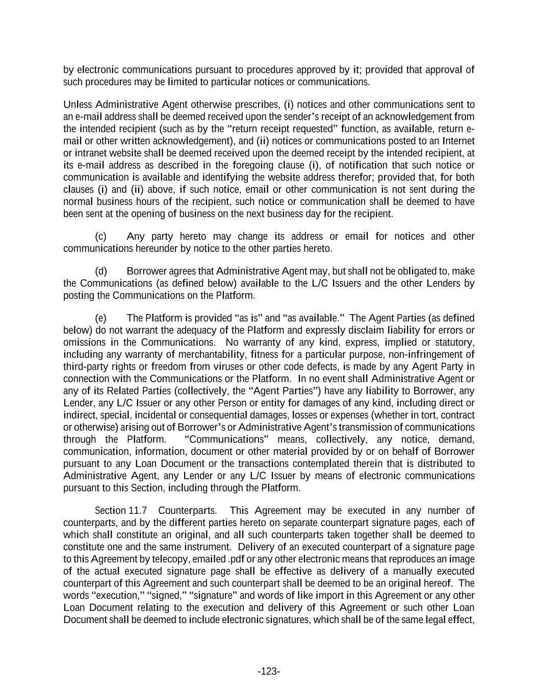-123- by electronic communications pursuant to procedures approved by it; provided that approval of such procedures may be limited to particular notices or communications. Unless Administrative Agent otherwise prescribes, (i) notices and other communications sent to an e-mail address shall be deemed received upon the sender’s receipt of an acknowledgement from the intended recipient (such as by the “return receipt requested” function, as available, return e- mail or other written acknowledgement), and (ii) notices or communications posted to an Internet or intranet website shall be deemed received upon the deemed receipt by the intended recipient, at its e-mail address as described in the foregoing clause (i), of notification that such notice or communication is available and identifying the website address therefor; provided that, for both clauses (i) and (ii) above, if such notice, email or other communication is not sent during the normal business hours of the recipient, such notice or communication shall be deemed to have been sent at the opening of business on the next business day for the recipient. (c) Any party hereto may change its address or email for notices and other communications hereunder by notice to the other parties hereto. (d) Borrower agrees that Administrative Agent may, but shall not be obligated to, make the Communications (as defined below) available to the L/C Issuers and the other Lenders by posting the Communications on the Platform. (e) The Platform is provided “as is” and “as available.” The Agent Parties (as defined below) do not warrant the adequacy of the Platform and expressly disclaim liability for errors or omissions in the Communications. No warranty of any kind, express, implied or statutory, including any warranty of merchantability, fitness for a particular purpose, non-infringement of third-party rights or freedom from viruses or other code defects, is made by any Agent Party in connection with the Communications or the Platform. In no event shall Administrative Agent or any of its Related Parties (collectively, the “Agent Parties”) have any liability to Borrower, any Lender, any L/C Issuer or any other Person or entity for damages of any kind, including direct or indirect, special, incidental or consequential damages, losses or expenses (whether in tort, contract or otherwise) arising out of Borrower’s or Administrative Agent’s transmission of communications through the Platform. “Communications” means, collectively, any notice, demand, communication, information, document or other material provided by or on behalf of Borrower pursuant to any Loan Document or the transactions contemplated therein that is distributed to Administrative Agent, any Lender or any L/C Issuer by means of electronic communications pursuant to this Section, including through the Platform. Section 11.7 Counterparts. This Agreement may be executed in any number of counterparts, and by the different parties hereto on separate counterpart signature pages, each of which shall constitute an original, and all such counterparts taken together shall be deemed to constitute one and the same instrument. Delivery of an executed counterpart of a signature page to this Agreement by telecopy, emailed .pdf or any other electronic means that reproduces an image of the actual executed signature page shall be effective as delivery of a manually executed counterpart of this Agreement and such counterpart shall be deemed to be an original hereof. The words “execution,” “signed,” “signature” and words of like import in this Agreement or any other Loan Document relating to the execution and delivery of this Agreement or such other Loan Document shall be deemed to include electronic signatures, which shall be of the same legal effect,