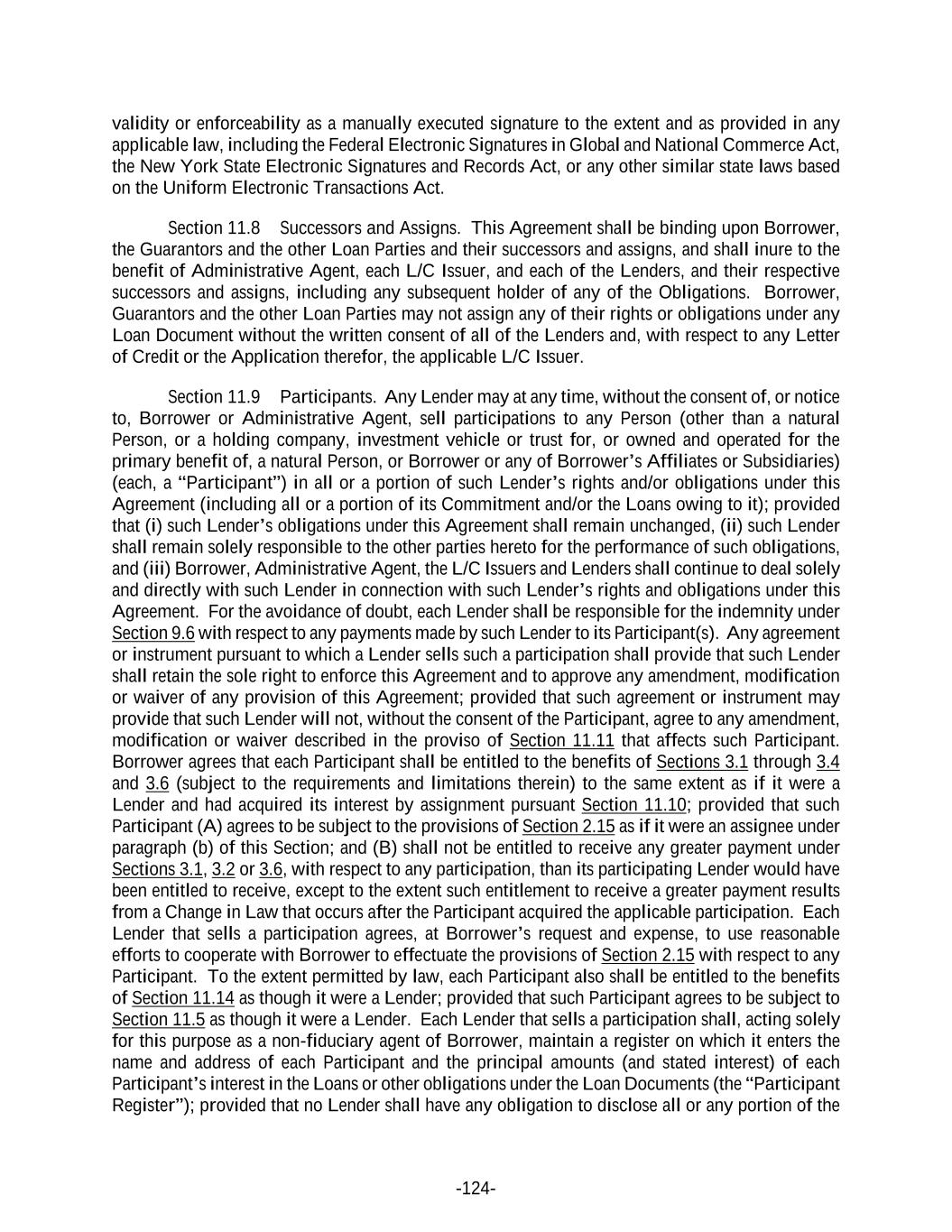 -124- validity or enforceability as a manually executed signature to the extent and as provided in any applicable law, including the Federal Electronic Signatures in Global and National Commerce Act, the New York State Electronic Signatures and Records Act, or any other similar state laws based on the Uniform Electronic Transactions Act. Section 11.8 Successors and Assigns. This Agreement shall be binding upon Borrower, the Guarantors and the other Loan Parties and their successors and assigns, and shall inure to the benefit of Administrative Agent, each L/C Issuer, and each of the Lenders, and their respective successors and assigns, including any subsequent holder of any of the Obligations. Borrower, Guarantors and the other Loan Parties may not assign any of their rights or obligations under any Loan Document without the written consent of all of the Lenders and, with respect to any Letter of Credit or the Application therefor, the applicable L/C Issuer. Section 11.9 Participants. Any Lender may at any time, without the consent of, or notice to, Borrower or Administrative Agent, sell participations to any Person (other than a natural Person, or a holding company, investment vehicle or trust for, or owned and operated for the primary benefit of, a natural Person, or Borrower or any of Borrower’s Affiliates or Subsidiaries) (each, a “Participant”) in all or a portion of such Lender’s rights and/or obligations under this Agreement (including all or a portion of its Commitment and/or the Loans owing to it); provided that (i) such Lender’s obligations under this Agreement shall remain unchanged, (ii) such Lender shall remain solely responsible to the other parties hereto for the performance of such obligations, and (iii) Borrower, Administrative Agent, the L/C Issuers and Lenders shall continue to deal solely and directly with such Lender in connection with such Lender’s rights and obligations under this Agreement. For the avoidance of doubt, each Lender shall be responsible for the indemnity under Section 9.6 with respect to any payments made by such Lender to its Participant(s). Any agreement or instrument pursuant to which a Lender sells such a participation shall provide that such Lender shall retain the sole right to enforce this Agreement and to approve any amendment, modification or waiver of any provision of this Agreement; provided that such agreement or instrument may provide that such Lender will not, without the consent of the Participant, agree to any amendment, modification or waiver described in the proviso of Section 11.11 that affects such Participant. Borrower agrees that each Participant shall be entitled to the benefits of Sections 3.1 through 3.4 and 3.6 (subject to the requirements and limitations therein) to the same extent as if it were a Lender and had acquired its interest by assignment pursuant Section 11.10; provided that such Participant (A) agrees to be subject to the provisions of Section 2.15 as if it were an assignee under paragraph (b) of this Section; and (B) shall not be entitled to receive any greater payment under Sections 3.1, 3.2 or 3.6, with respect to any participation, than its participating Lender would have been entitled to receive, except to the extent such entitlement to receive a greater payment results from a Change in Law that occurs after the Participant acquired the applicable participation. Each Lender that sells a participation agrees, at Borrower’s request and expense, to use reasonable efforts to cooperate with Borrower to effectuate the provisions of Section 2.15 with respect to any Participant. To the extent permitted by law, each Participant also shall be entitled to the benefits of Section 11.14 as though it were a Lender; provided that such Participant agrees to be subject to Section 11.5 as though it were a Lender. Each Lender that sells a participation shall, acting solely for this purpose as a non-fiduciary agent of Borrower, maintain a register on which it enters the name and address of each Participant and the principal amounts (and stated interest) of each Participant’s interest in the Loans or other obligations under the Loan Documents (the “Participant Register”); provided that no Lender shall have any obligation to disclose all or any portion of the