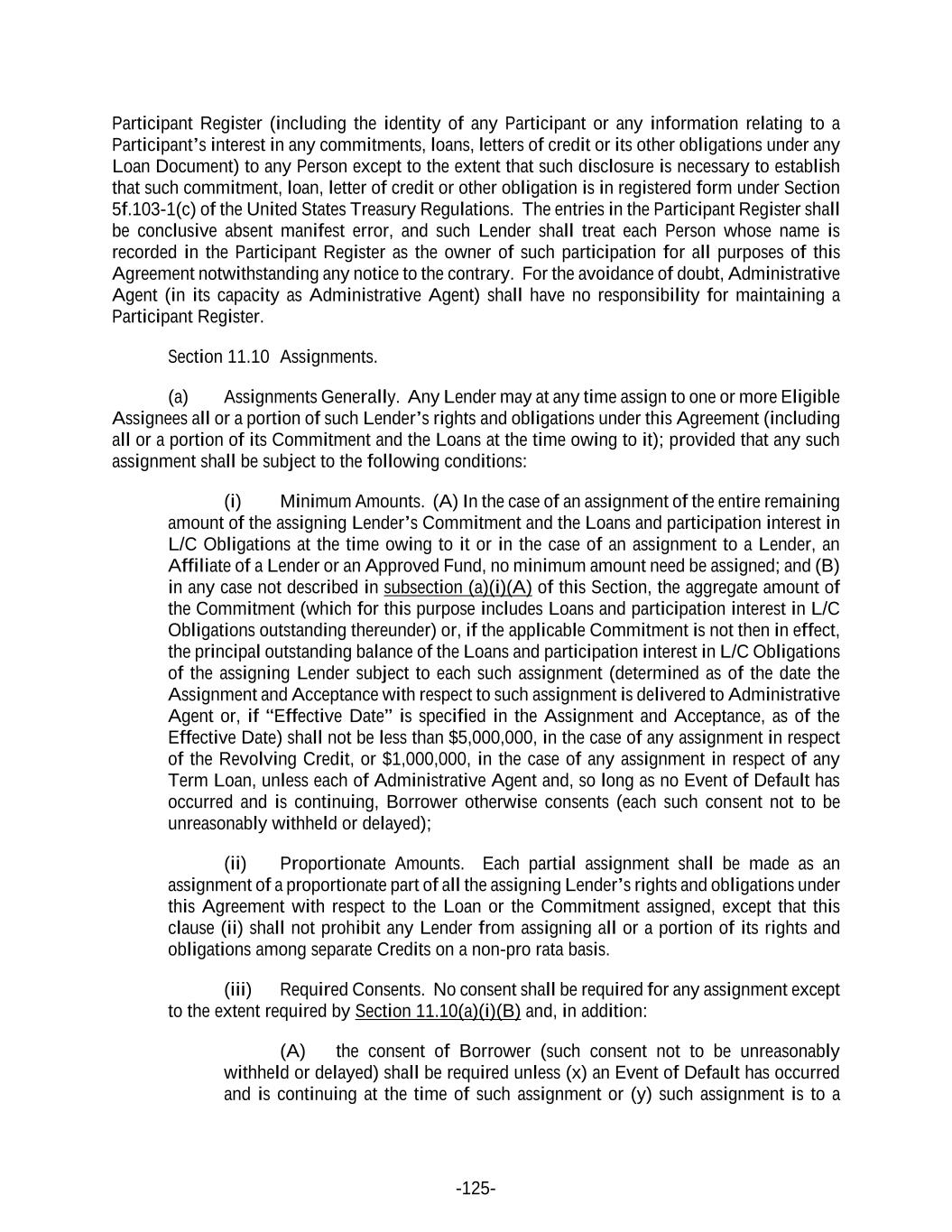 -125- Participant Register (including the identity of any Participant or any information relating to a Participant’s interest in any commitments, loans, letters of credit or its other obligations under any Loan Document) to any Person except to the extent that such disclosure is necessary to establish that such commitment, loan, letter of credit or other obligation is in registered form under Section 5f.103-1(c) of the United States Treasury Regulations. The entries in the Participant Register shall be conclusive absent manifest error, and such Lender shall treat each Person whose name is recorded in the Participant Register as the owner of such participation for all purposes of this Agreement notwithstanding any notice to the contrary. For the avoidance of doubt, Administrative Agent (in its capacity as Administrative Agent) shall have no responsibility for maintaining a Participant Register. Section 11.10 Assignments. (a) Assignments Generally. Any Lender may at any time assign to one or more Eligible Assignees all or a portion of such Lender’s rights and obligations under this Agreement (including all or a portion of its Commitment and the Loans at the time owing to it); provided that any such assignment shall be subject to the following conditions: (i) Minimum Amounts. (A) In the case of an assignment of the entire remaining amount of the assigning Lender’s Commitment and the Loans and participation interest in L/C Obligations at the time owing to it or in the case of an assignment to a Lender, an Affiliate of a Lender or an Approved Fund, no minimum amount need be assigned; and (B) in any case not described in subsection (a)(i)(A) of this Section, the aggregate amount of the Commitment (which for this purpose includes Loans and participation interest in L/C Obligations outstanding thereunder) or, if the applicable Commitment is not then in effect, the principal outstanding balance of the Loans and participation interest in L/C Obligations of the assigning Lender subject to each such assignment (determined as of the date the Assignment and Acceptance with respect to such assignment is delivered to Administrative Agent or, if “Effective Date” is specified in the Assignment and Acceptance, as of the Effective Date) shall not be less than $5,000,000, in the case of any assignment in respect of the Revolving Credit, or $1,000,000, in the case of any assignment in respect of any Term Loan, unless each of Administrative Agent and, so long as no Event of Default has occurred and is continuing, Borrower otherwise consents (each such consent not to be unreasonably withheld or delayed); (ii) Proportionate Amounts. Each partial assignment shall be made as an assignment of a proportionate part of all the assigning Lender’s rights and obligations under this Agreement with respect to the Loan or the Commitment assigned, except that this clause (ii) shall not prohibit any Lender from assigning all or a portion of its rights and obligations among separate Credits on a non-pro rata basis. (iii) Required Consents. No consent shall be required for any assignment except to the extent required by Section 11.10(a)(i)(B) and, in addition: (A) the consent of Borrower (such consent not to be unreasonably withheld or delayed) shall be required unless (x) an Event of Default has occurred and is continuing at the time of such assignment or (y) such assignment is to a
