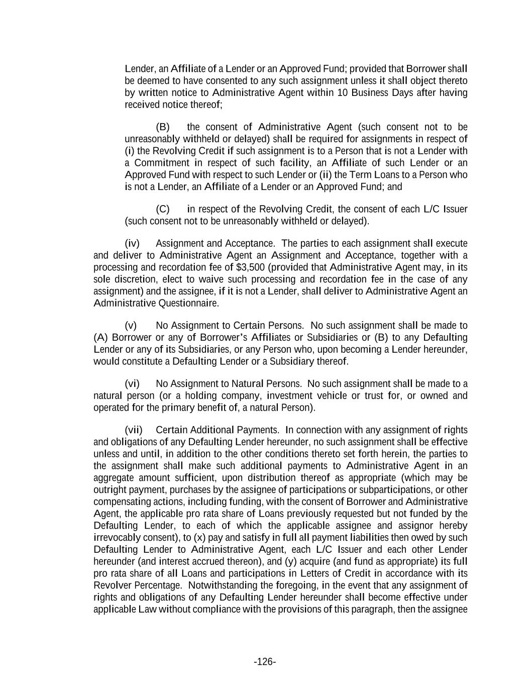 -126- Lender, an Affiliate of a Lender or an Approved Fund; provided that Borrower shall be deemed to have consented to any such assignment unless it shall object thereto by written notice to Administrative Agent within 10 Business Days after having received notice thereof; (B) the consent of Administrative Agent (such consent not to be unreasonably withheld or delayed) shall be required for assignments in respect of (i) the Revolving Credit if such assignment is to a Person that is not a Lender with a Commitment in respect of such facility, an Affiliate of such Lender or an Approved Fund with respect to such Lender or (ii) the Term Loans to a Person who is not a Lender, an Affiliate of a Lender or an Approved Fund; and (C) in respect of the Revolving Credit, the consent of each L/C Issuer (such consent not to be unreasonably withheld or delayed). (iv) Assignment and Acceptance. The parties to each assignment shall execute and deliver to Administrative Agent an Assignment and Acceptance, together with a processing and recordation fee of $3,500 (provided that Administrative Agent may, in its sole discretion, elect to waive such processing and recordation fee in the case of any assignment) and the assignee, if it is not a Lender, shall deliver to Administrative Agent an Administrative Questionnaire. (v) No Assignment to Certain Persons. No such assignment shall be made to (A) Borrower or any of Borrower’s Affiliates or Subsidiaries or (B) to any Defaulting Lender or any of its Subsidiaries, or any Person who, upon becoming a Lender hereunder, would constitute a Defaulting Lender or a Subsidiary thereof. (vi) No Assignment to Natural Persons. No such assignment shall be made to a natural person (or a holding company, investment vehicle or trust for, or owned and operated for the primary benefit of, a natural Person). (vii) Certain Additional Payments. In connection with any assignment of rights and obligations of any Defaulting Lender hereunder, no such assignment shall be effective unless and until, in addition to the other conditions thereto set forth herein, the parties to the assignment shall make such additional payments to Administrative Agent in an aggregate amount sufficient, upon distribution thereof as appropriate (which may be outright payment, purchases by the assignee of participations or subparticipations, or other compensating actions, including funding, with the consent of Borrower and Administrative Agent, the applicable pro rata share of Loans previously requested but not funded by the Defaulting Lender, to each of which the applicable assignee and assignor hereby irrevocably consent), to (x) pay and satisfy in full all payment liabilities then owed by such Defaulting Lender to Administrative Agent, each L/C Issuer and each other Lender hereunder (and interest accrued thereon), and (y) acquire (and fund as appropriate) its full pro rata share of all Loans and participations in Letters of Credit in accordance with its Revolver Percentage. Notwithstanding the foregoing, in the event that any assignment of rights and obligations of any Defaulting Lender hereunder shall become effective under applicable Law without compliance with the provisions of this paragraph, then the assignee