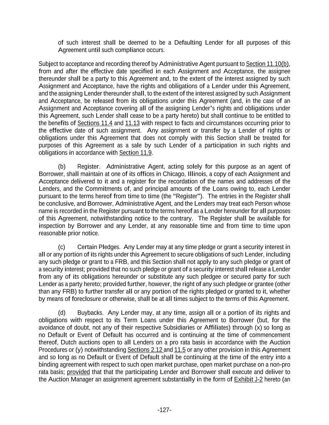 -127- of such interest shall be deemed to be a Defaulting Lender for all purposes of this Agreement until such compliance occurs. Subject to acceptance and recording thereof by Administrative Agent pursuant to Section 11.10(b), from and after the effective date specified in each Assignment and Acceptance, the assignee thereunder shall be a party to this Agreement and, to the extent of the interest assigned by such Assignment and Acceptance, have the rights and obligations of a Lender under this Agreement, and the assigning Lender thereunder shall, to the extent of the interest assigned by such Assignment and Acceptance, be released from its obligations under this Agreement (and, in the case of an Assignment and Acceptance covering all of the assigning Lender’s rights and obligations under this Agreement, such Lender shall cease to be a party hereto) but shall continue to be entitled to the benefits of Sections 11.4 and 11.13 with respect to facts and circumstances occurring prior to the effective date of such assignment. Any assignment or transfer by a Lender of rights or obligations under this Agreement that does not comply with this Section shall be treated for purposes of this Agreement as a sale by such Lender of a participation in such rights and obligations in accordance with Section 11.9. (b) Register. Administrative Agent, acting solely for this purpose as an agent of Borrower, shall maintain at one of its offices in Chicago, Illinois, a copy of each Assignment and Acceptance delivered to it and a register for the recordation of the names and addresses of the Lenders, and the Commitments of, and principal amounts of the Loans owing to, each Lender pursuant to the terms hereof from time to time (the “Register”). The entries in the Register shall be conclusive, and Borrower, Administrative Agent, and the Lenders may treat each Person whose name is recorded in the Register pursuant to the terms hereof as a Lender hereunder for all purposes of this Agreement, notwithstanding notice to the contrary. The Register shall be available for inspection by Borrower and any Lender, at any reasonable time and from time to time upon reasonable prior notice. (c) Certain Pledges. Any Lender may at any time pledge or grant a security interest in all or any portion of its rights under this Agreement to secure obligations of such Lender, including any such pledge or grant to a FRB, and this Section shall not apply to any such pledge or grant of a security interest; provided that no such pledge or grant of a security interest shall release a Lender from any of its obligations hereunder or substitute any such pledgee or secured party for such Lender as a party hereto; provided further, however, the right of any such pledgee or grantee (other than any FRB) to further transfer all or any portion of the rights pledged or granted to it, whether by means of foreclosure or otherwise, shall be at all times subject to the terms of this Agreement. (d) Buybacks. Any Lender may, at any time, assign all or a portion of its rights and obligations with respect to its Term Loans under this Agreement to Borrower (but, for the avoidance of doubt, not any of their respective Subsidiaries or Affiliates) through (x) so long as no Default or Event of Default has occurred and is continuing at the time of commencement thereof, Dutch auctions open to all Lenders on a pro rata basis in accordance with the Auction Procedures or (y) notwithstanding Sections 2.12 and 11.5 or any other provision in this Agreement and so long as no Default or Event of Default shall be continuing at the time of the entry into a binding agreement with respect to such open market purchase, open market purchase on a non-pro rata basis; provided that that the participating Lender and Borrower shall execute and deliver to the Auction Manager an assignment agreement substantially in the form of Exhibit J-2 hereto (an